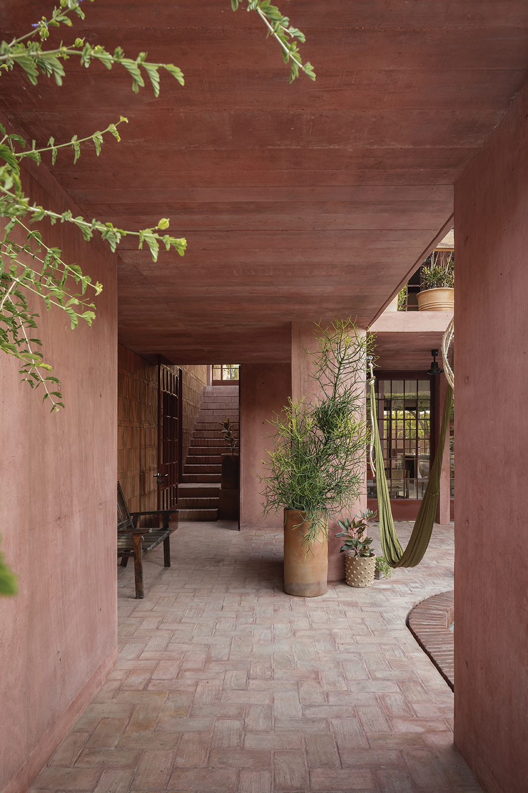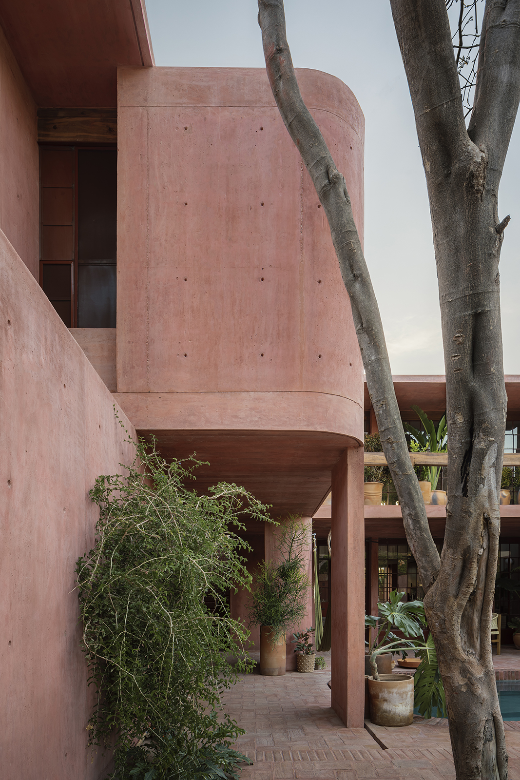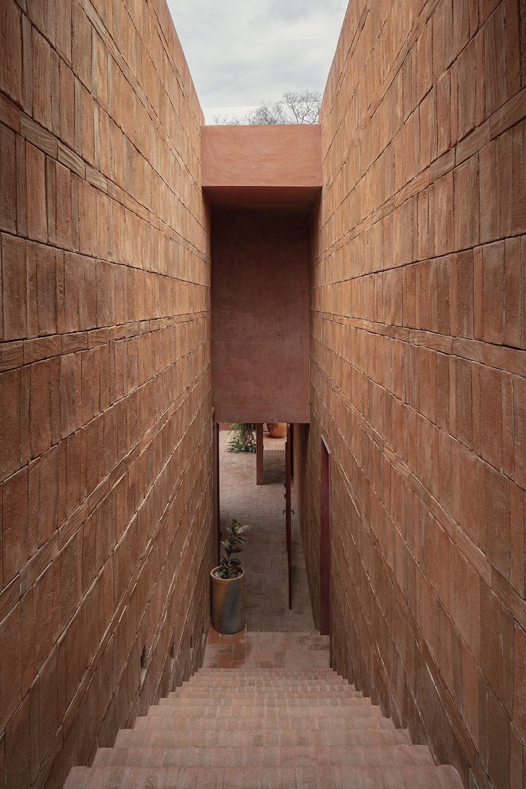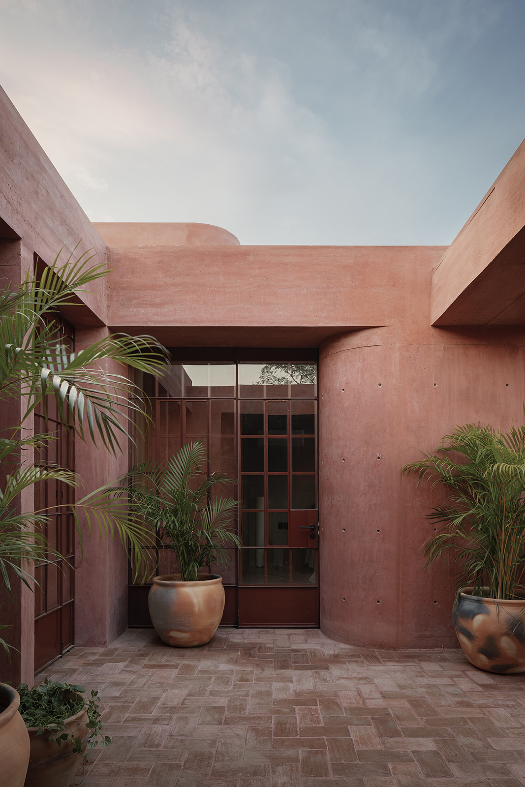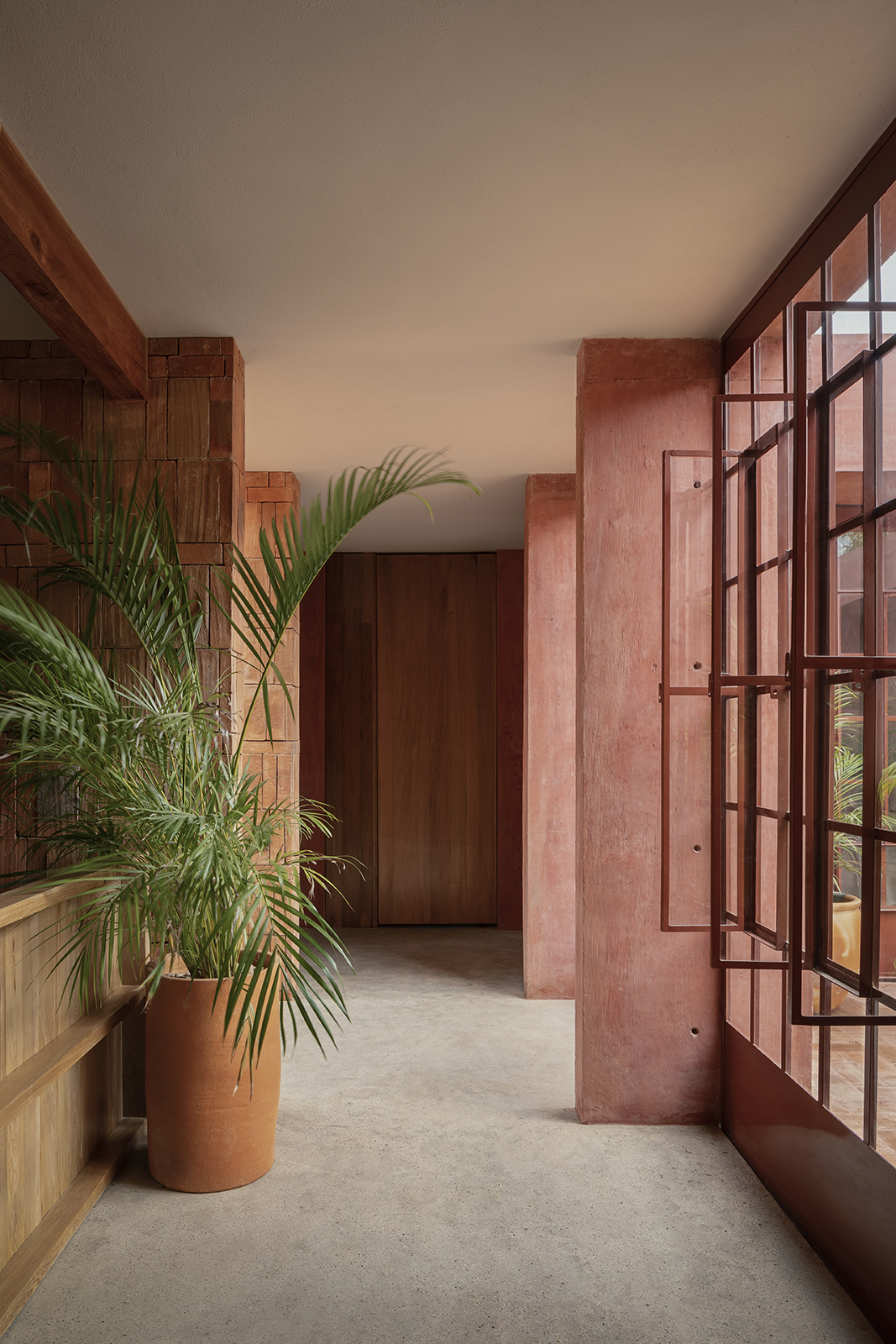 Materiality plays a fundamental role in expressing both place and memory. Pigmented concrete walls echo the warm, reddish hues of Oaxacan ceramics, while clay bricks, ironwork, wooden shutters and handcrafted details ground the project in local building traditions.