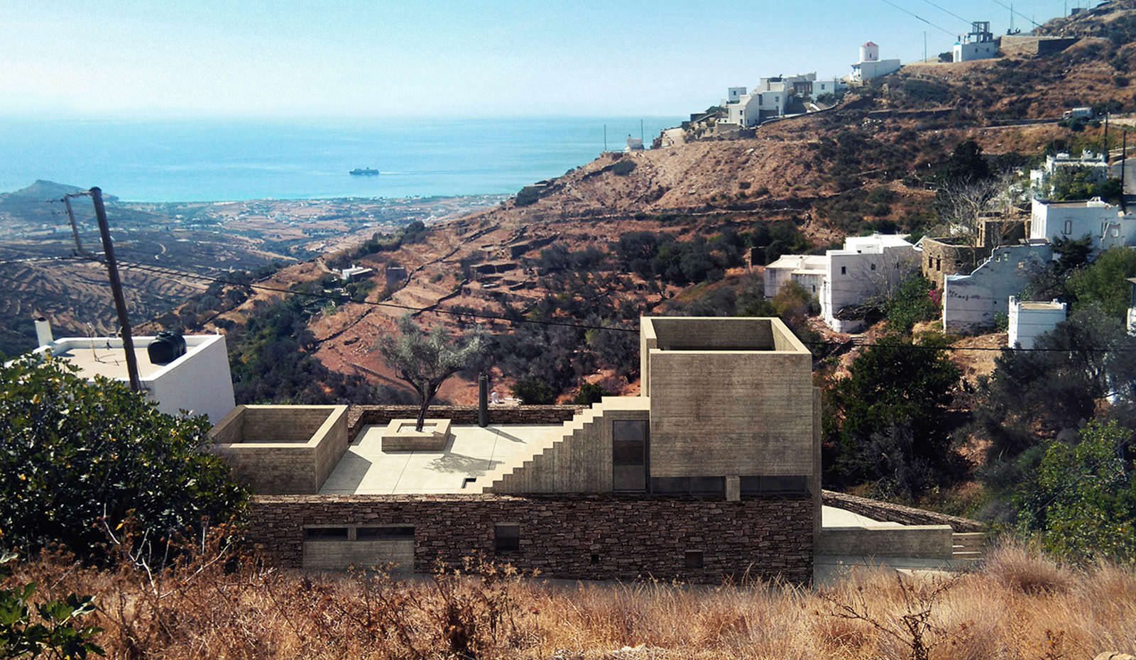 Υιοθετώντας την αφαιρετική προσέγγιση και επιζητώντας την ελάχιστη παρέμβαση στο τοπίο, η αρχιτεκτονική πρόταση, σύγχρονη αλλά ταυτόχρονα κριτικά παραδοσιακή, αποτελείται από την αρμονική ένταξη/ αιώρηση ενός κύβου από ανεπίχρηστο (αδρό) σκυρόδεμα πάνω στον υφιστάμενο πέτρινο όγκο. Ενισχύοντας τη γεωμετρικότητα και στρέφοντας την οπτική προς τον κατακόρυφο άξονα, η σύνθεση επαναπροσδιορίζει τη θέση της στο φυσικό ανάγλυφο που φέρει στοιχεία από τον παραδοσιακό περιστερώνα, οδηγώντας το βλέμμα δυναμικά προς το μπλε της θάλασσας και του ουρανού.