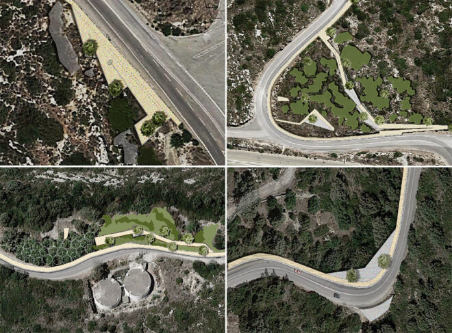 Η διαμόρφωση εισχωρεί σε επιλεγμένα σημεία μέσα στο φυσικό τοπίο. Με αυτό τον τρόπο δημιουργούνται διακριτές περιοχές στάσης και ξεκούρασης κατά μήκος της πορείας. Οι διαμορφώσεις περιλαμβάνουν υπαίθρια μπαλκόνια/ σημεία θέας, που αποκαλύπτουν ένα νέο τρόπο ενατένισης της πόλης. Προβλέπονται υπαίθρια καθιστικά για συνάντηση και ξεκούραση καθώς και ανοιχτοί χώροι για συναθροίσεις μικρής κλίμακας. Έχει γίνει ειδική μέριμνα για την αποκατάσταση του τοπίου με επανασχεδιασμό της τοπογραφίας, ενίσχυση της βλάστησης και δημιουργία επιφανειών πρασίνου. Ωστόσο, ο σχεδιασμός παραμένει ανοιχτός και ευέλικτος για εφήμερες δράσεις και νέους τρόπους αξιοποίησης του. Για παράδειγμα υπαίθριες εκθέσεις, μικρές συναθροίσεις και καλλιτεχνικά δρώμενα.