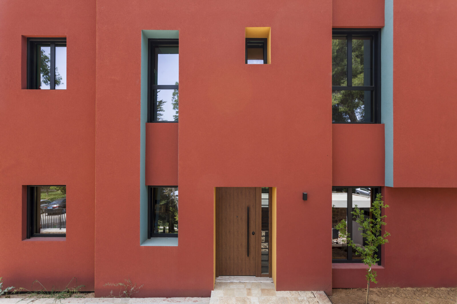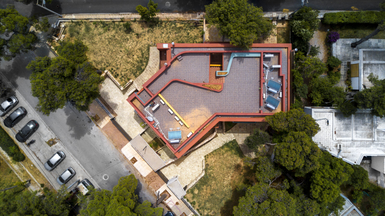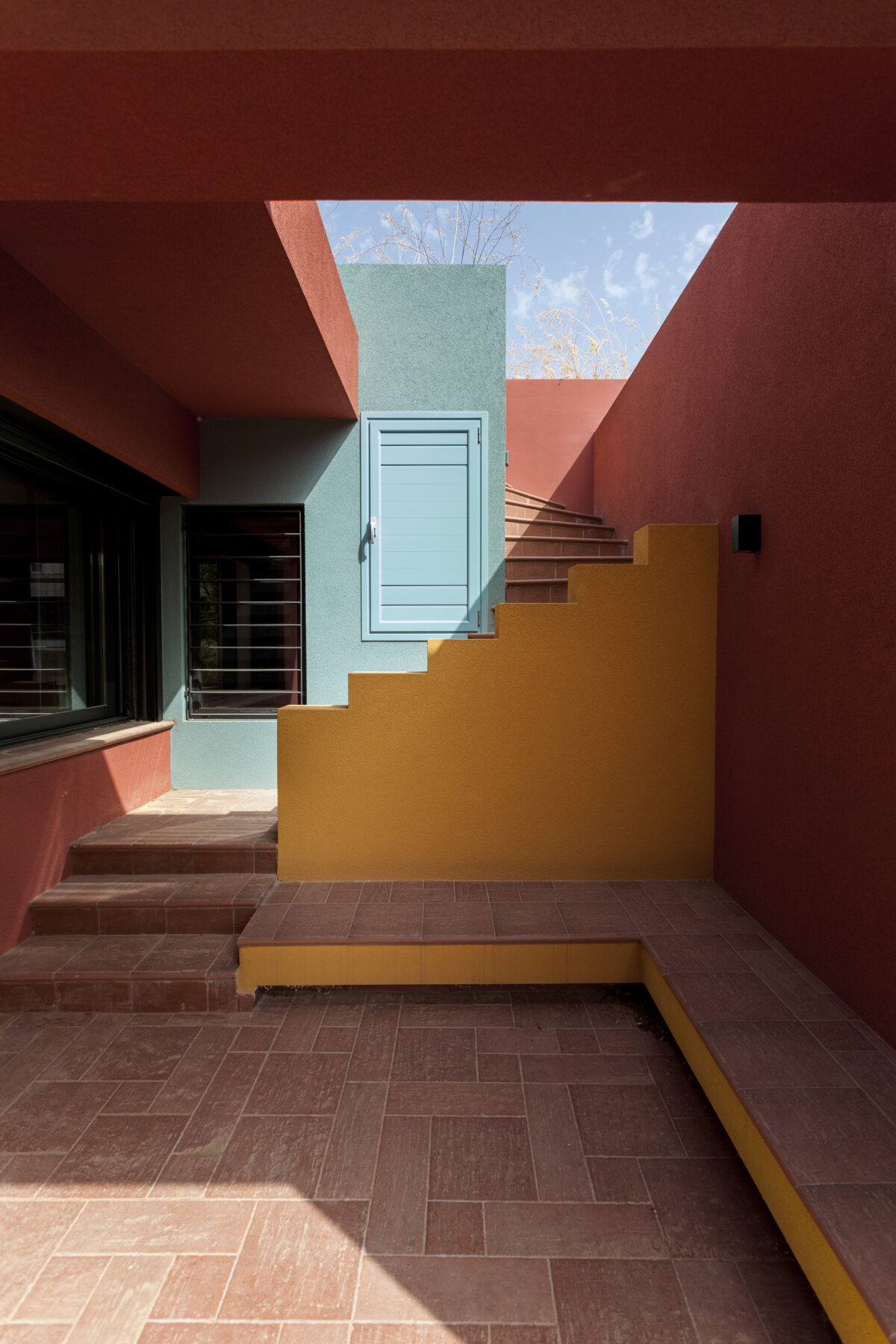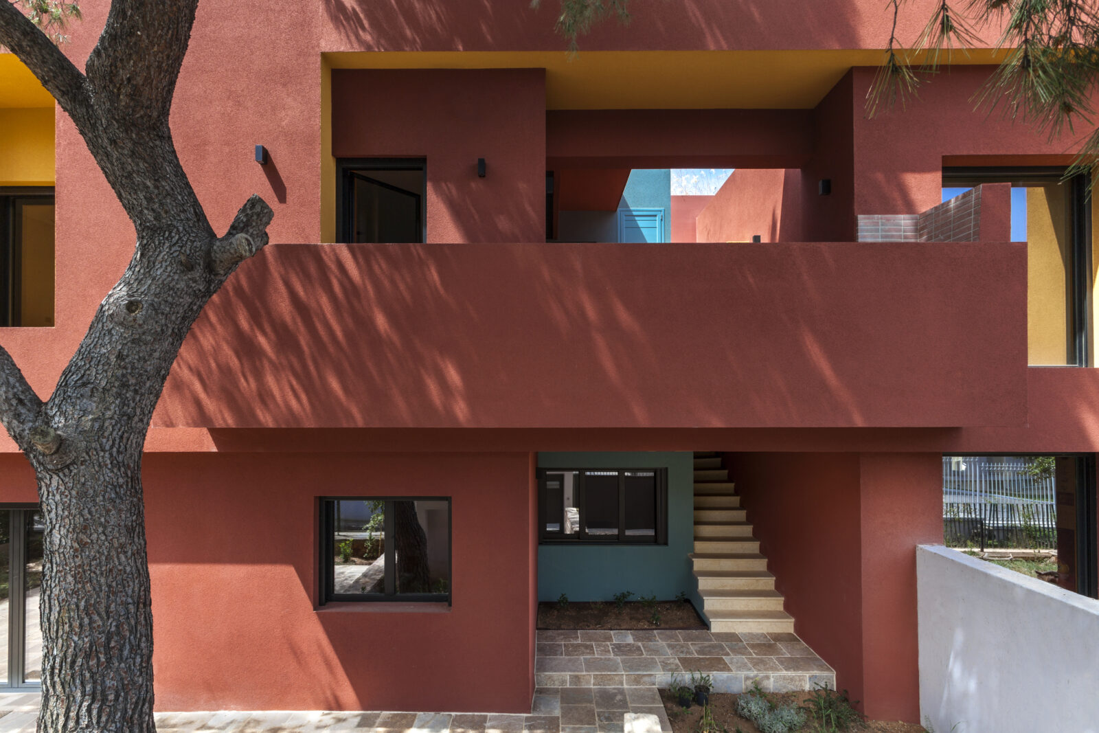 A dominant feature of the building is its color. Inside the quiet, green and tranquil environment of P. Psychiko, we aim to harmonize the building in its context but at the same time also to mark it. This way, the building is painted with earthy but vibrant colors: red, orange, blue-green. It is not just a building any more, it gains movement and life. It works as a living organism with the ability to provoke feelings and to influence the life of both its users and non-users.