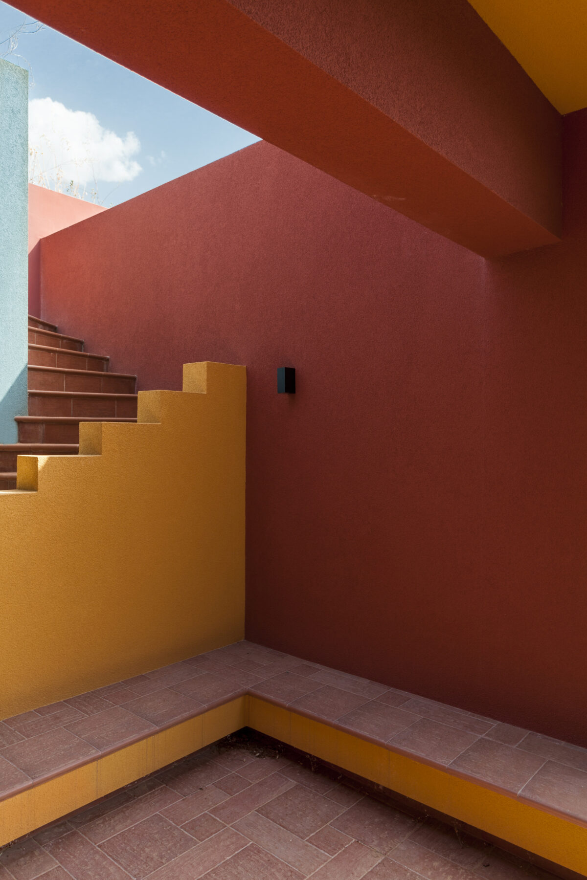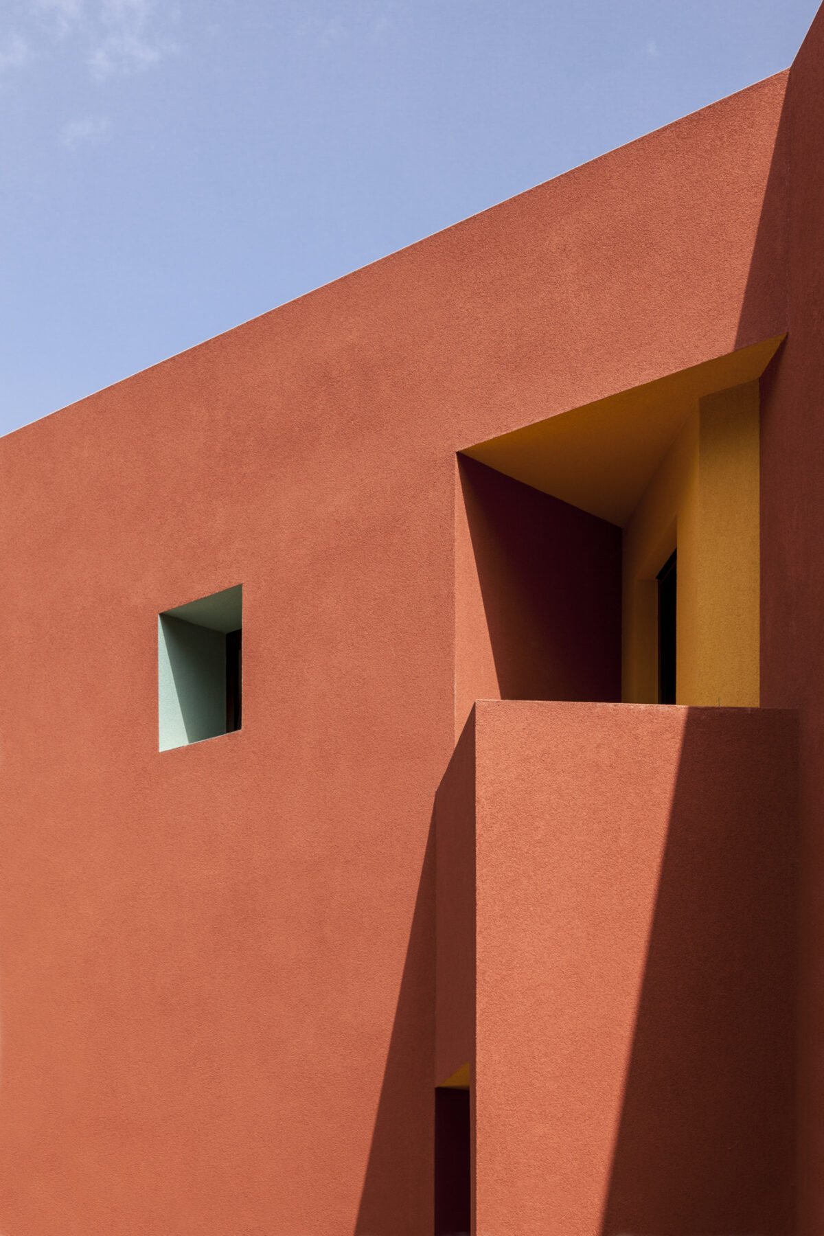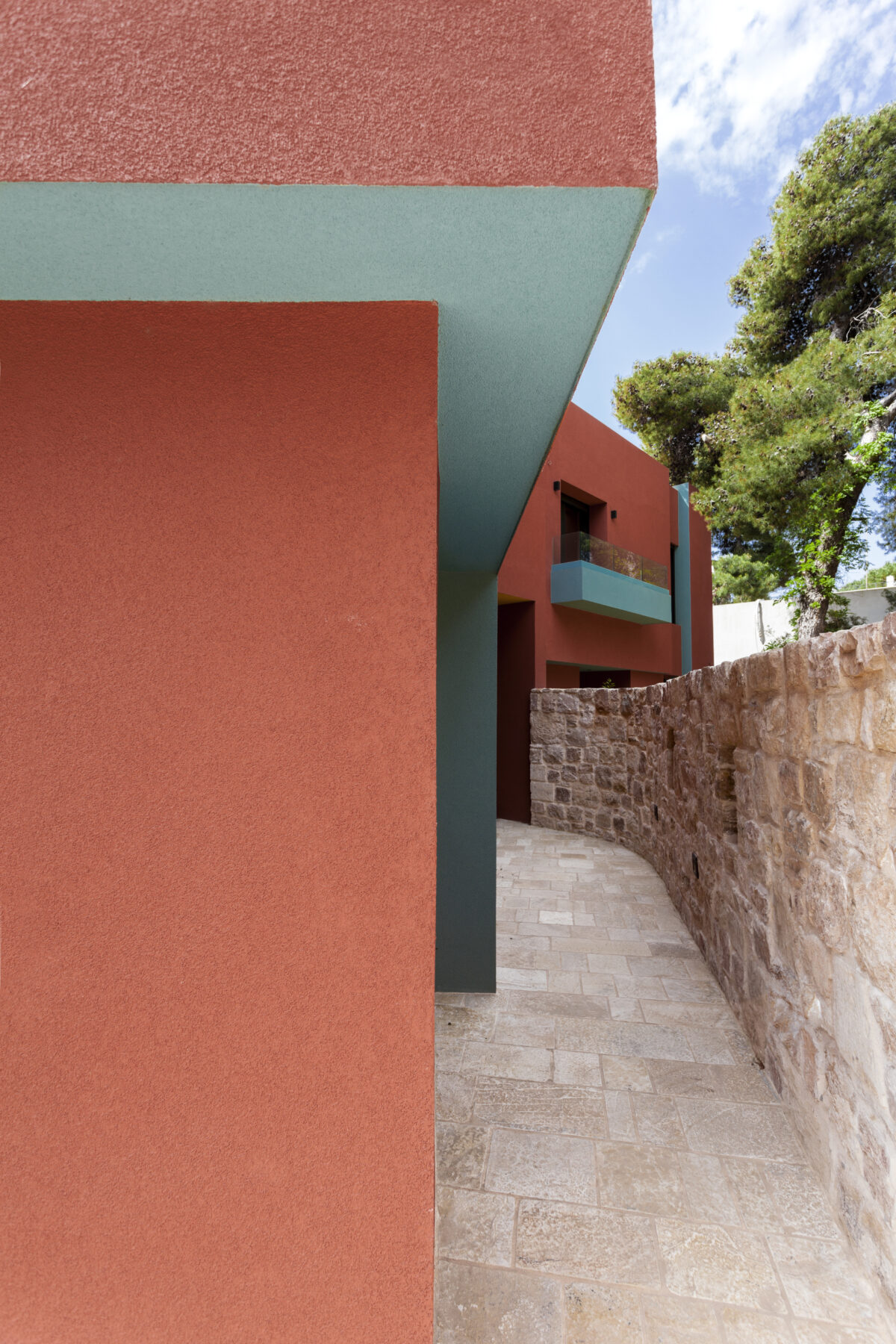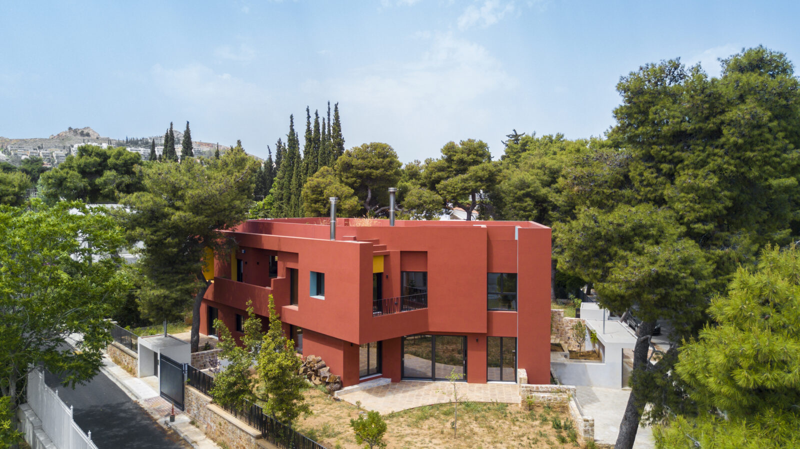 A dominant feature of the building is its color. Inside the quiet, green and tranquil environment of P. Psychiko, we aim to harmonize the building in its context but at the same time also to mark it. This way, the building is painted with earthy but vibrant colors: red, orange, blue-green. It is not just a building any more, it gains movement and life. It works as a living organism with the ability to provoke feelings and to influence the life of both its users and non-users.
