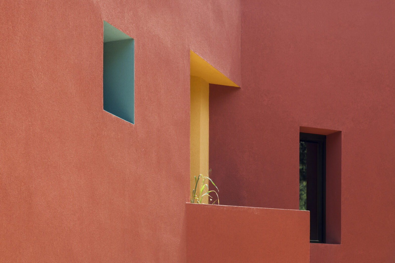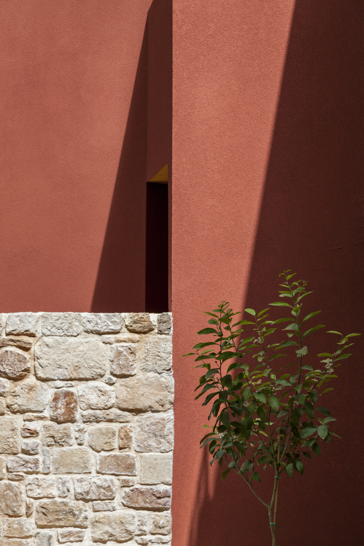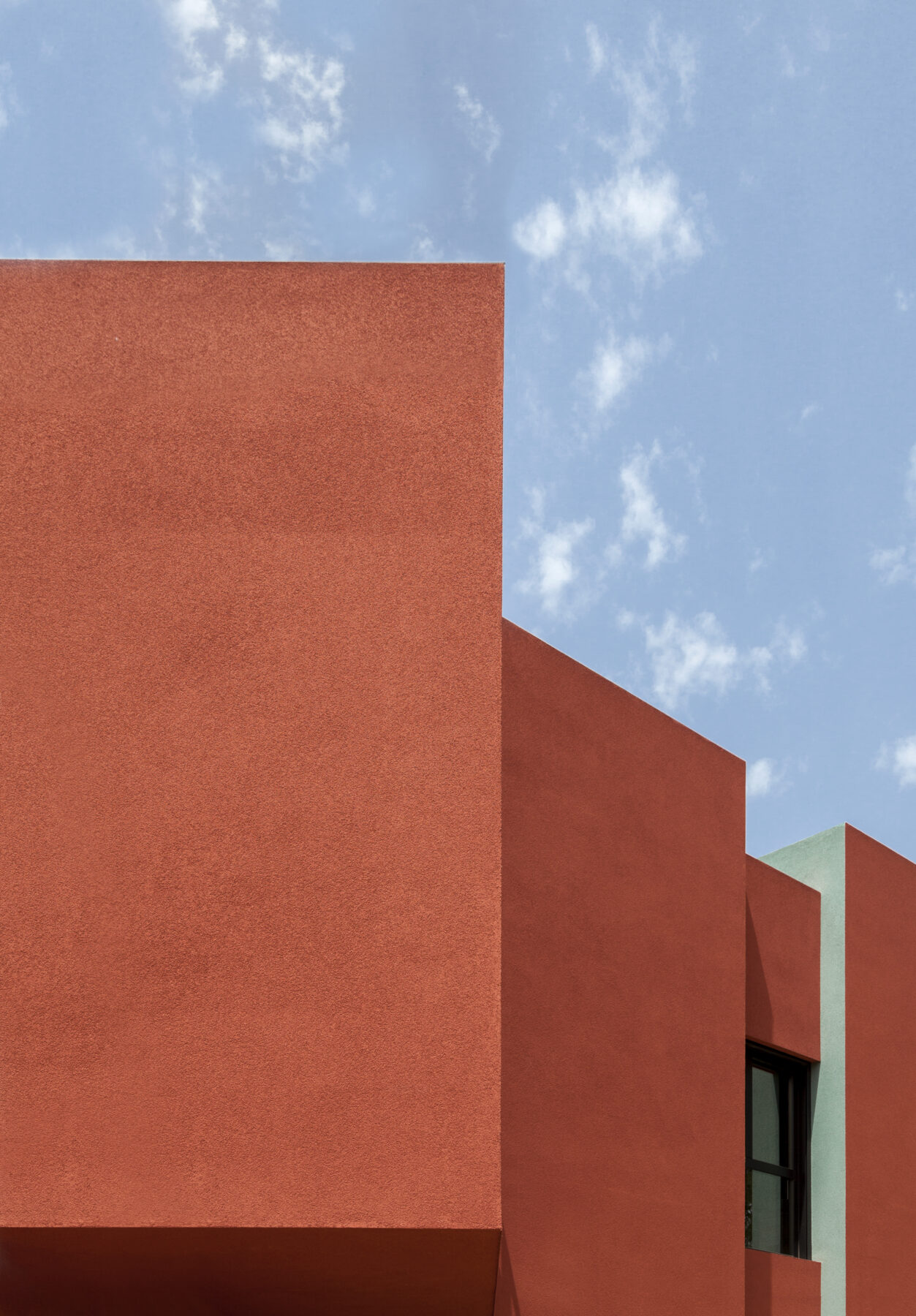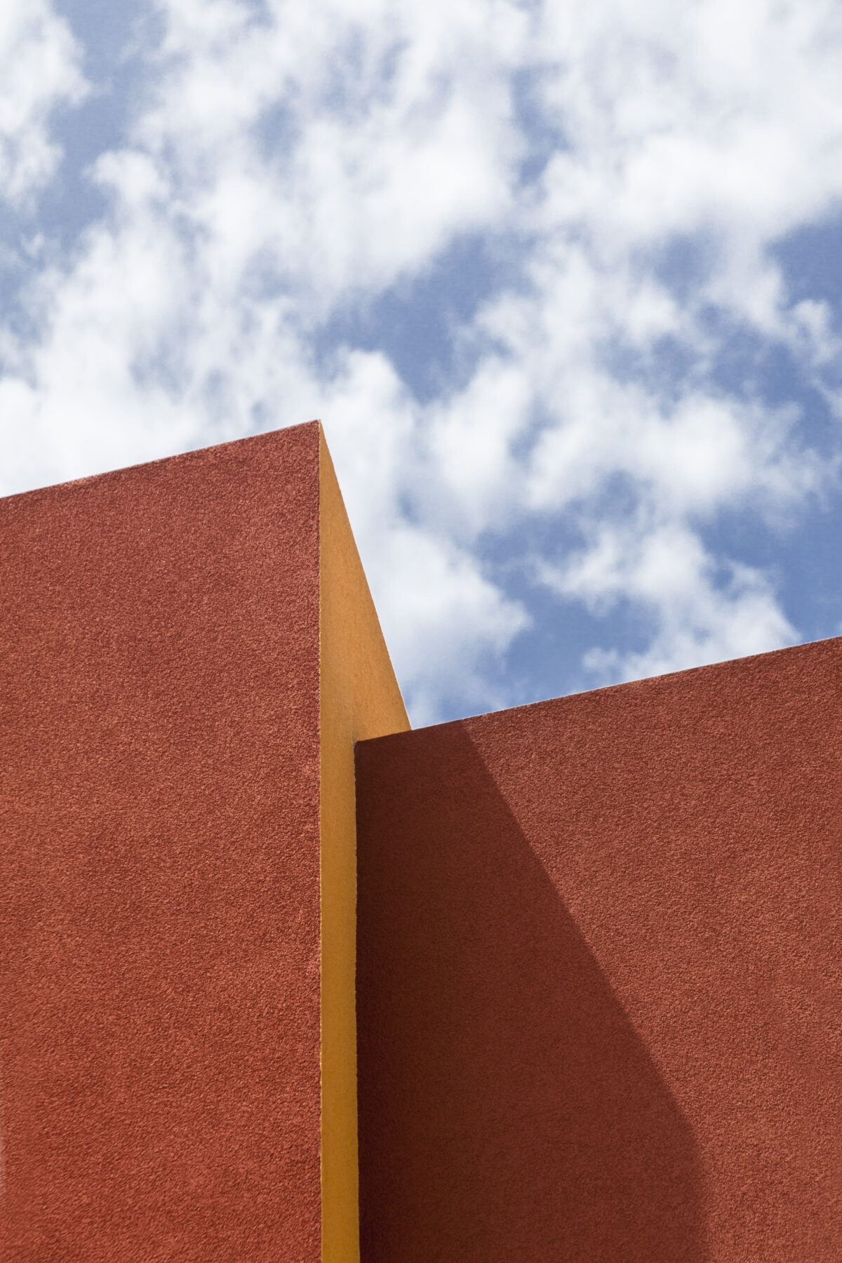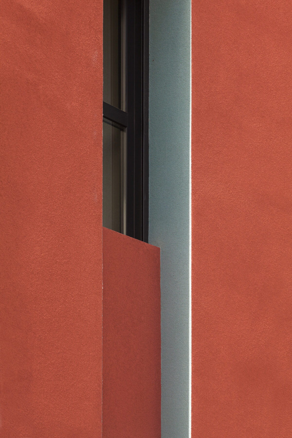 It looks like a sculpture, characterized by the continuity of its sides. A new red veil covers the building and unifies it.