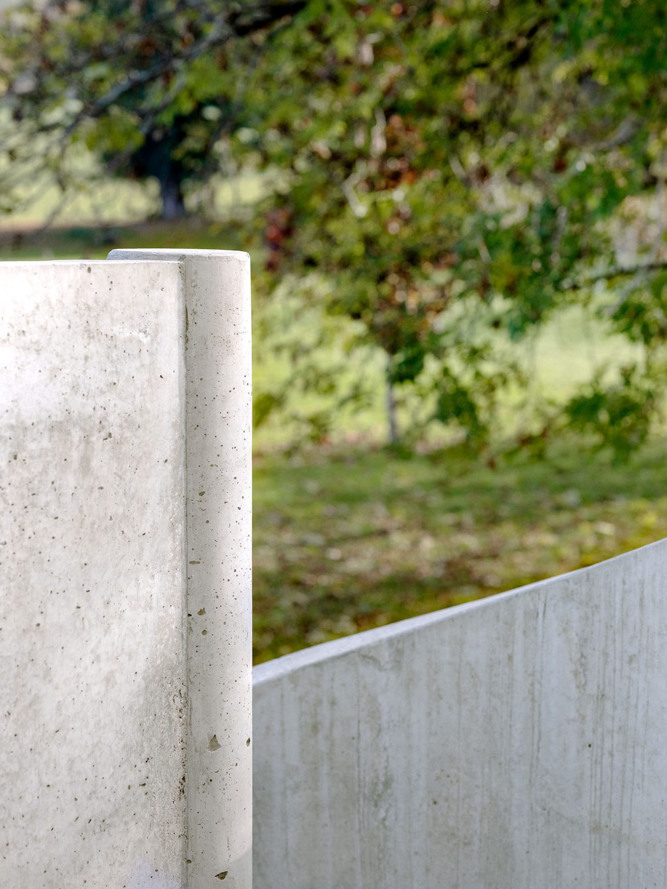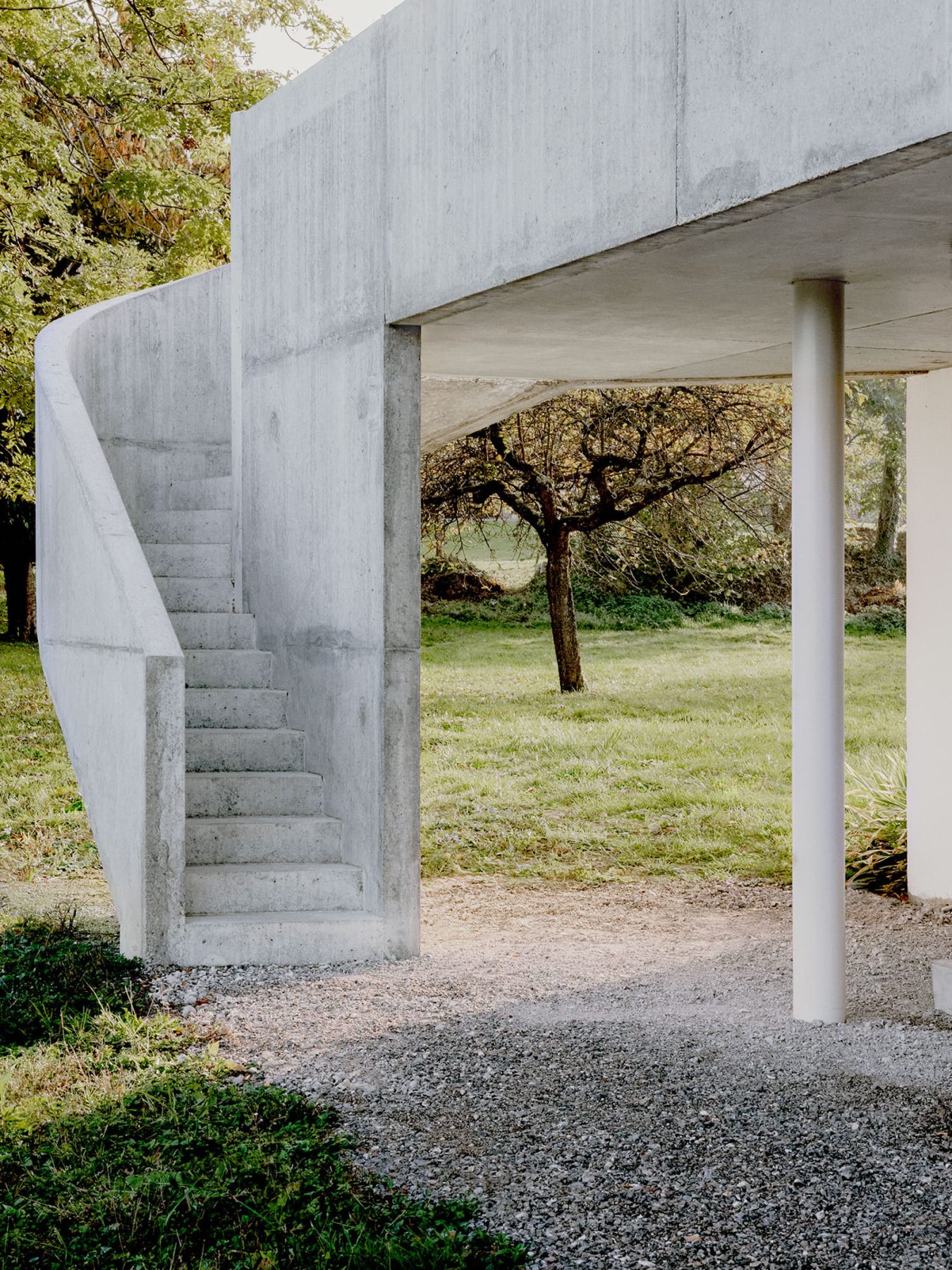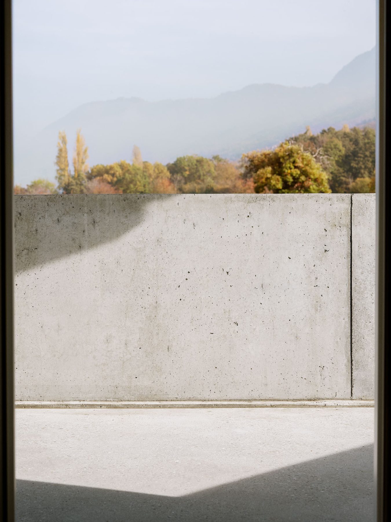 Nestled in a tranquil landscape, the project emerges as a minimalist concrete addition that seamlessly integrates with an existing vernacular residence.