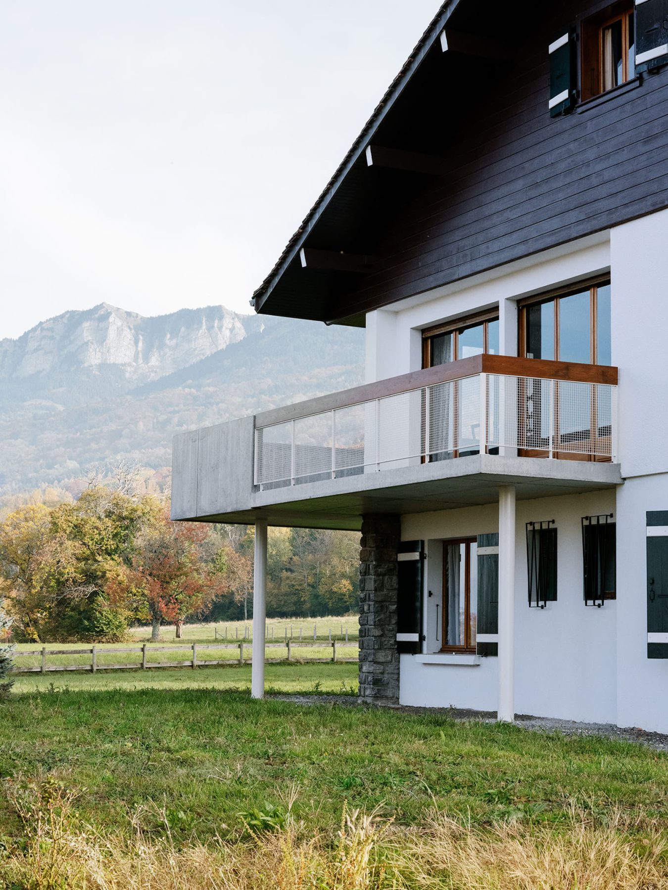 The main house, a traditional savoyard archetype, was turned toward the view on the Geneva lake, but was lacking a link with its garden and the view on the mountains below.