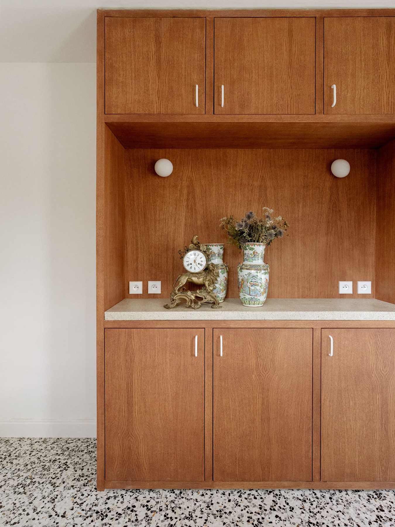 Contrasting with the raw concrete, a wooden cabinet echoes the window frames of the original authentic building, creating a visual and textural continuity between old and new.