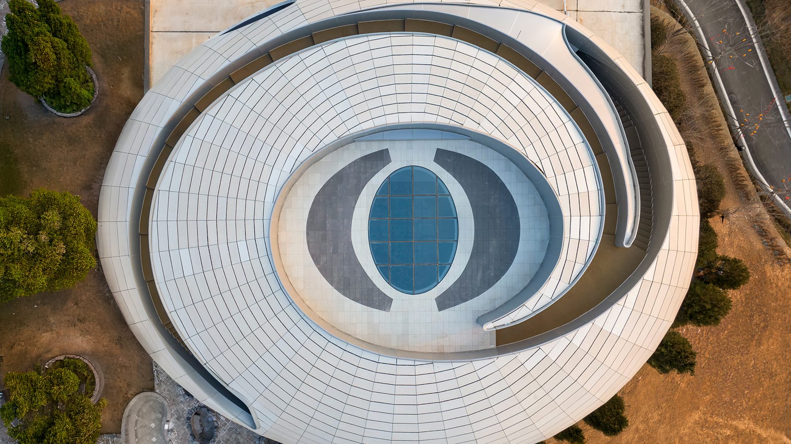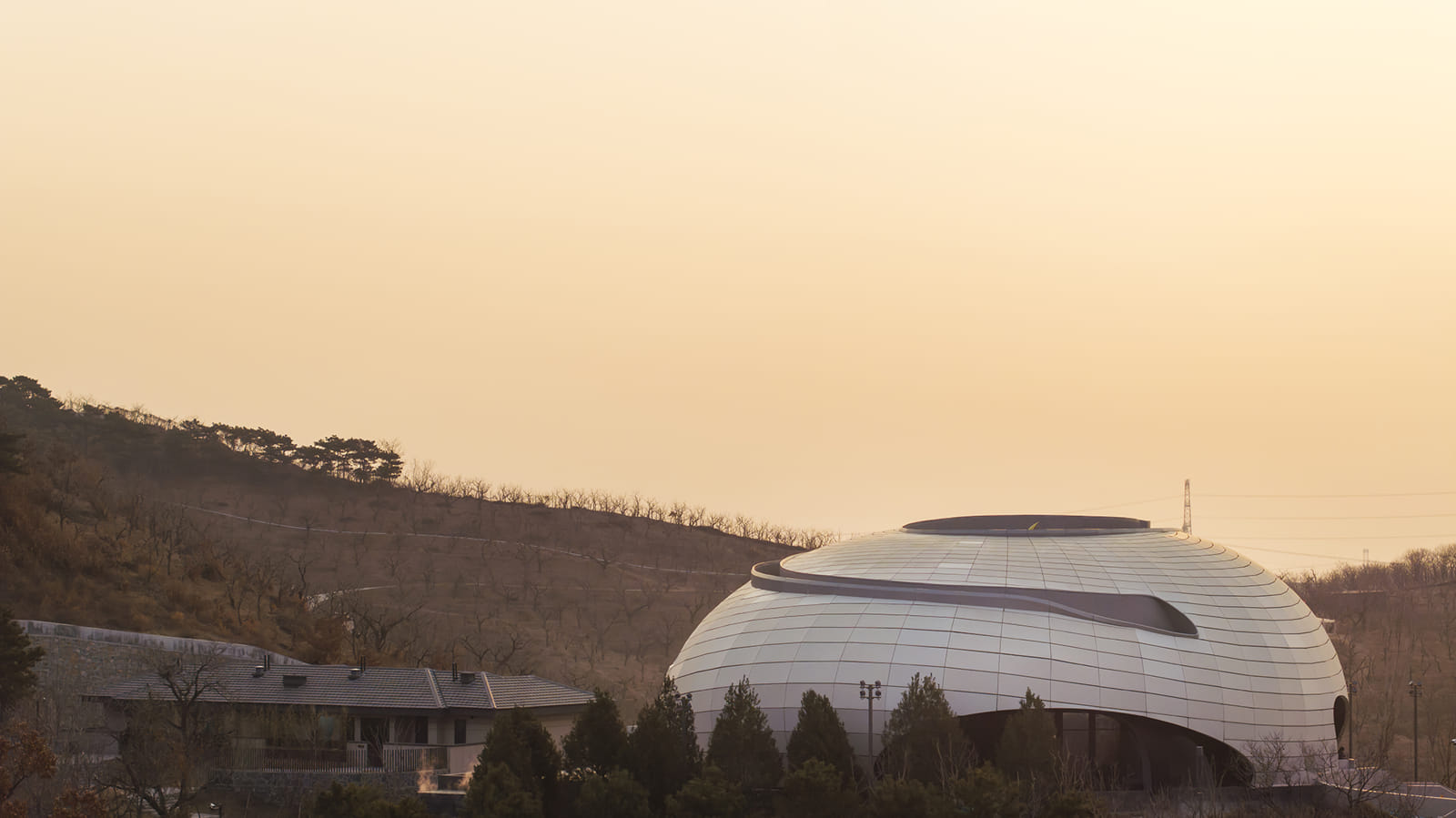 With this skylight, I wanted visitors to ascend to the summit. Drawing analogy from the Nazca Lines, I constructed a spiraling ramp that penetrates and emerges from the rock, evoking a gentle sense of flight. Zunhua and the Great Wall then unfold quietly before your eyes.