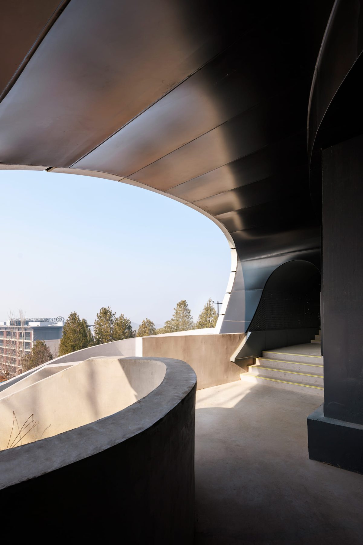 To control the building’s gross floor area, the outer metal façade is designed as an open shell encasing a waterproof, insulated core. Only the core is counted in floor area calculations. The cavity between shell and core allows a rooftop ramp to traverse the structure without affecting interior spaces—open to public access. The greatest challenge was waterproofing. We drafted numerous large-scale sectional drawings to ensure continuity and efficient drainage of waterproof layers. Even so, on-site coordination between client and architect was necessary to resolve unexpected construction issues.