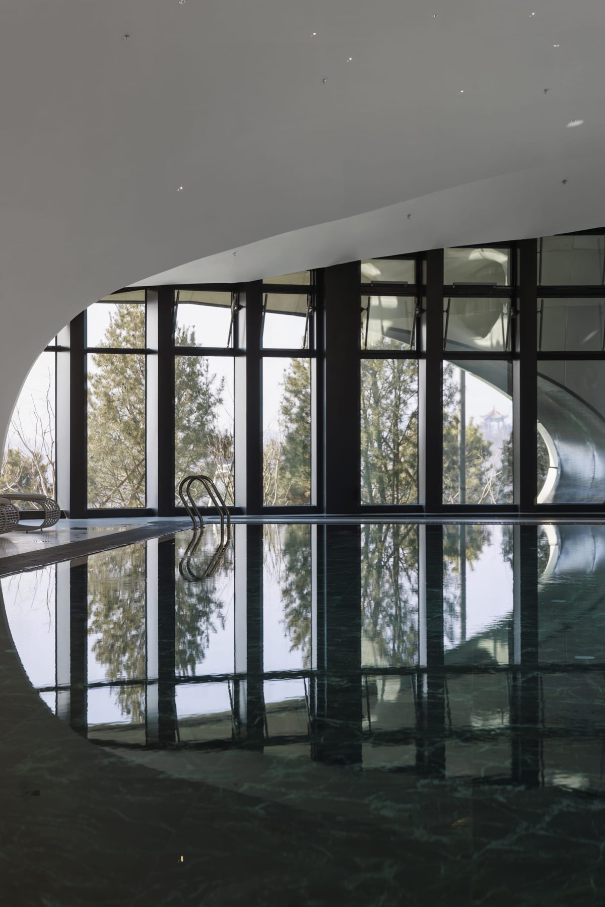 The gym on the second floor offers a superb view of the pool—as if peering from a small cave into a grander one, while also gazing beyond the rock into the surrounding nature. The outdoor hot spring pools are enclosed by terrain and vegetation for privacy, yet still offer a distant view of the Great Wall. At night, as lights twinkle above the pool, the cave transforms into a starry sky.