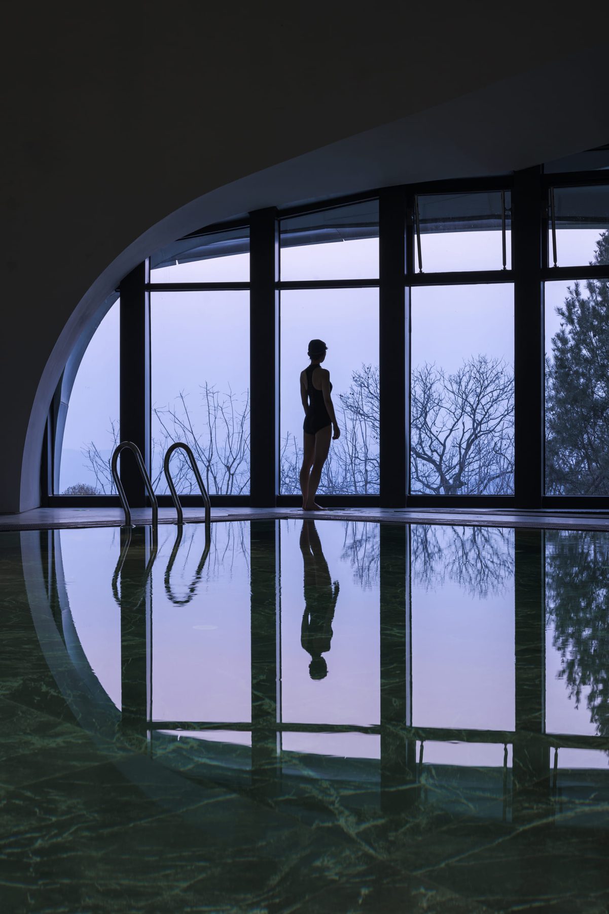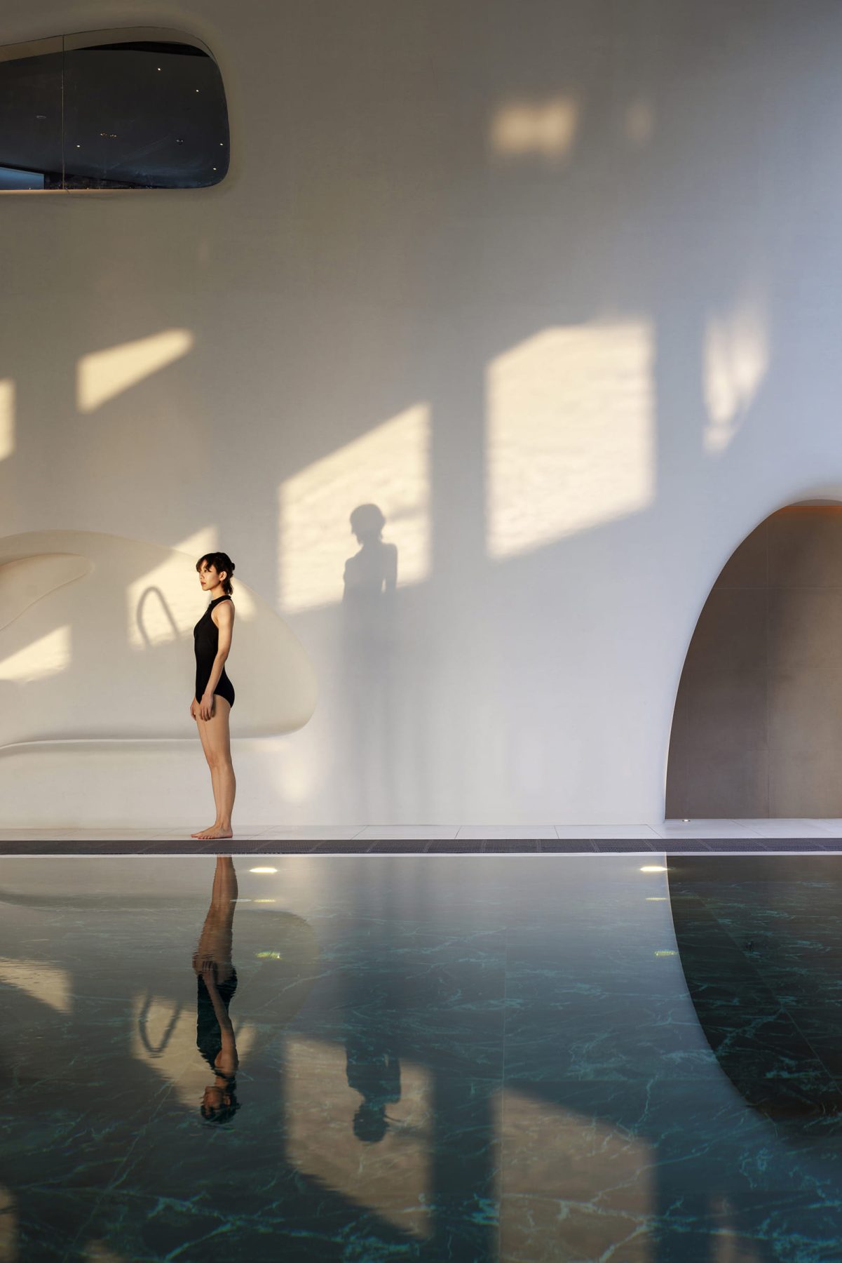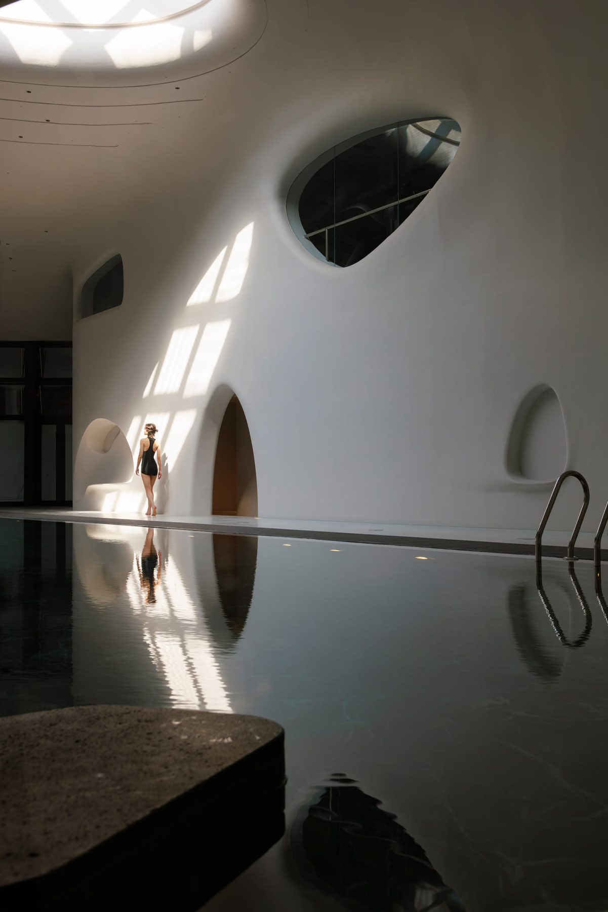 When snow blankets the mountaintop, all that’s visible are steaming pools and faintly spiraling curves. Nature becomes the true artist, transforming the center into a stone born of the mountain. The zigzagging landscape path connecting villas to the clubhouse is embedded in the earth—disappearing, reappearing, leading visitors into the experience from the very first step.