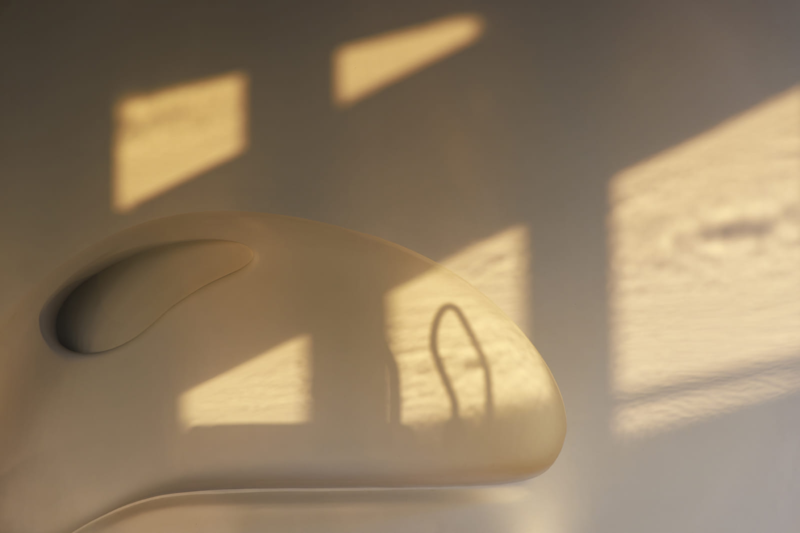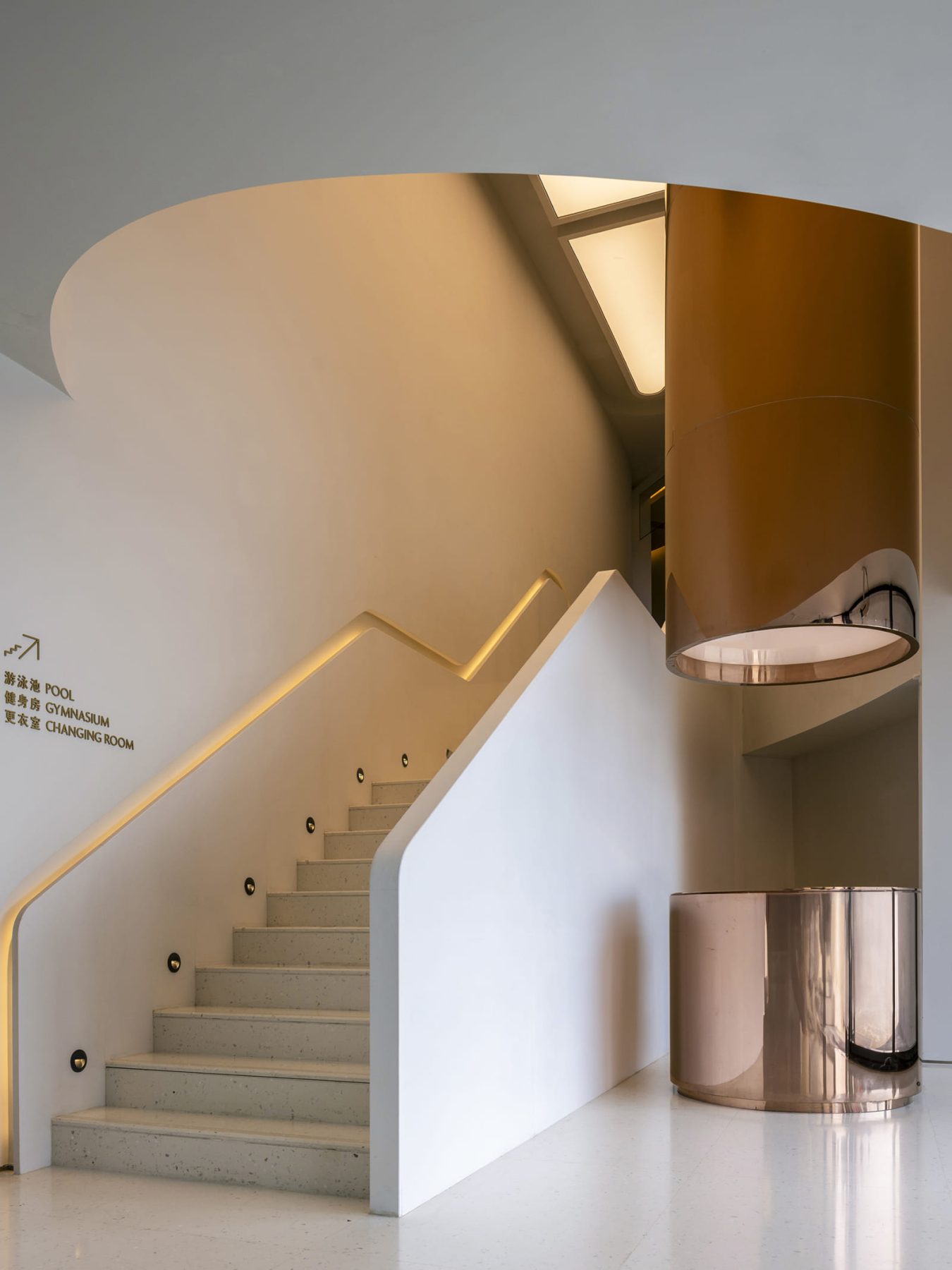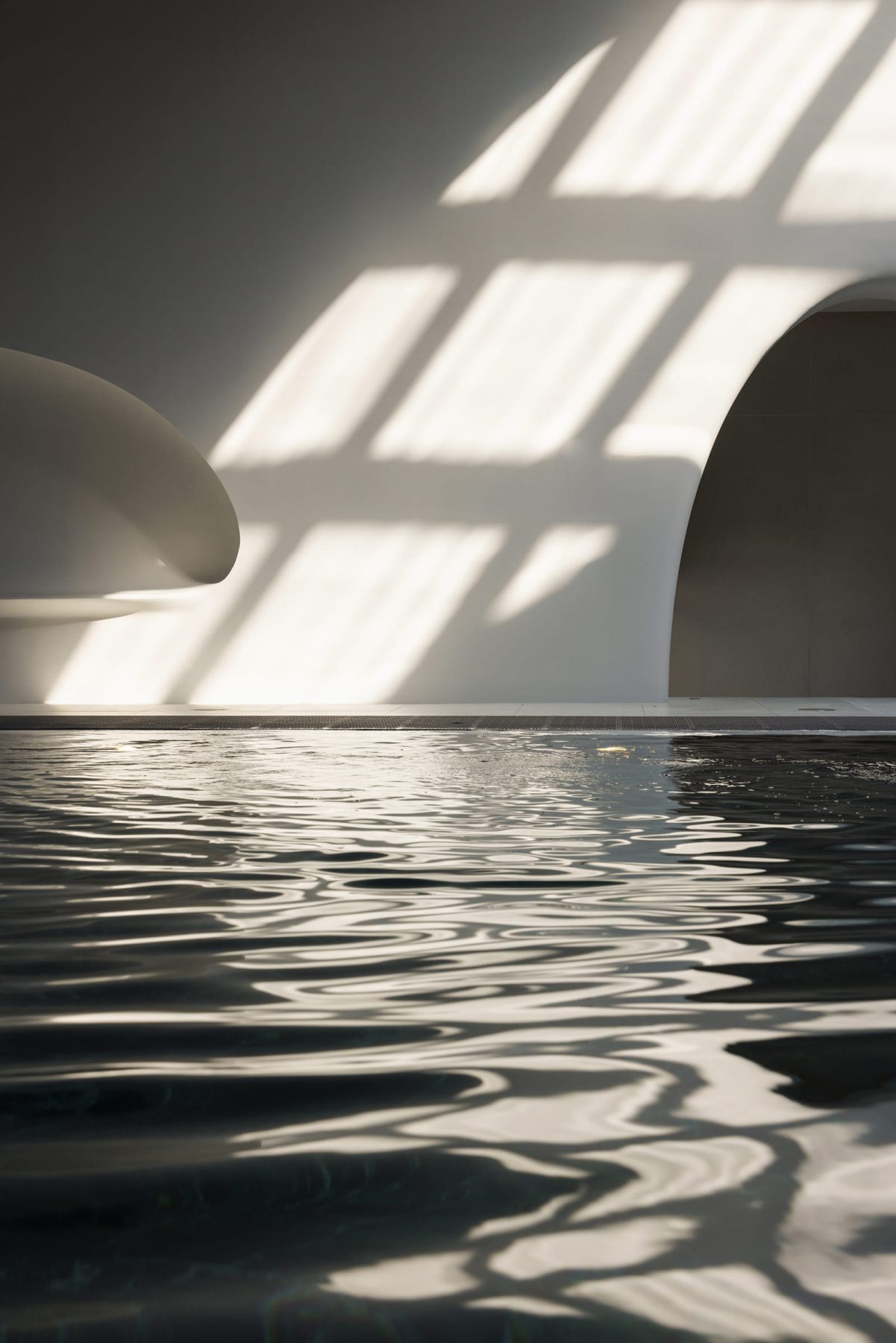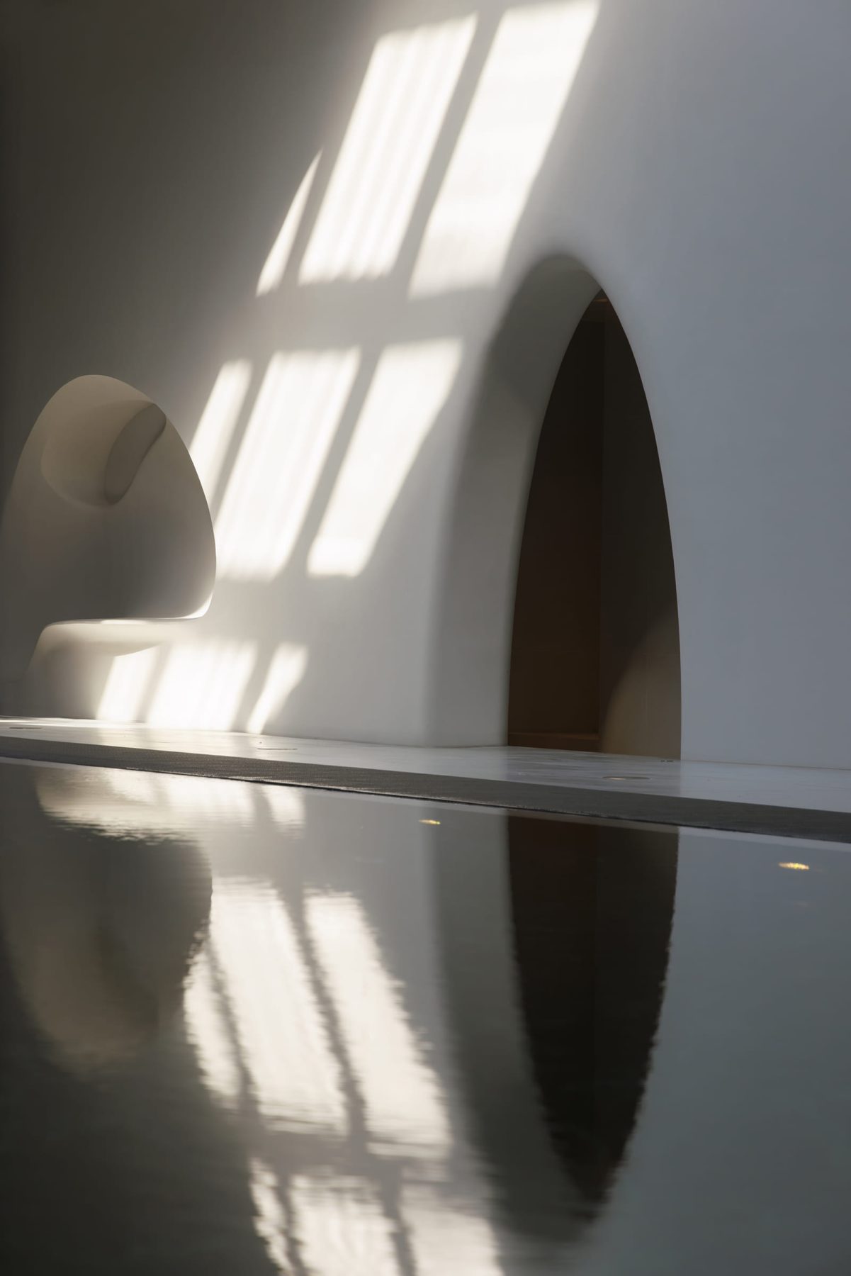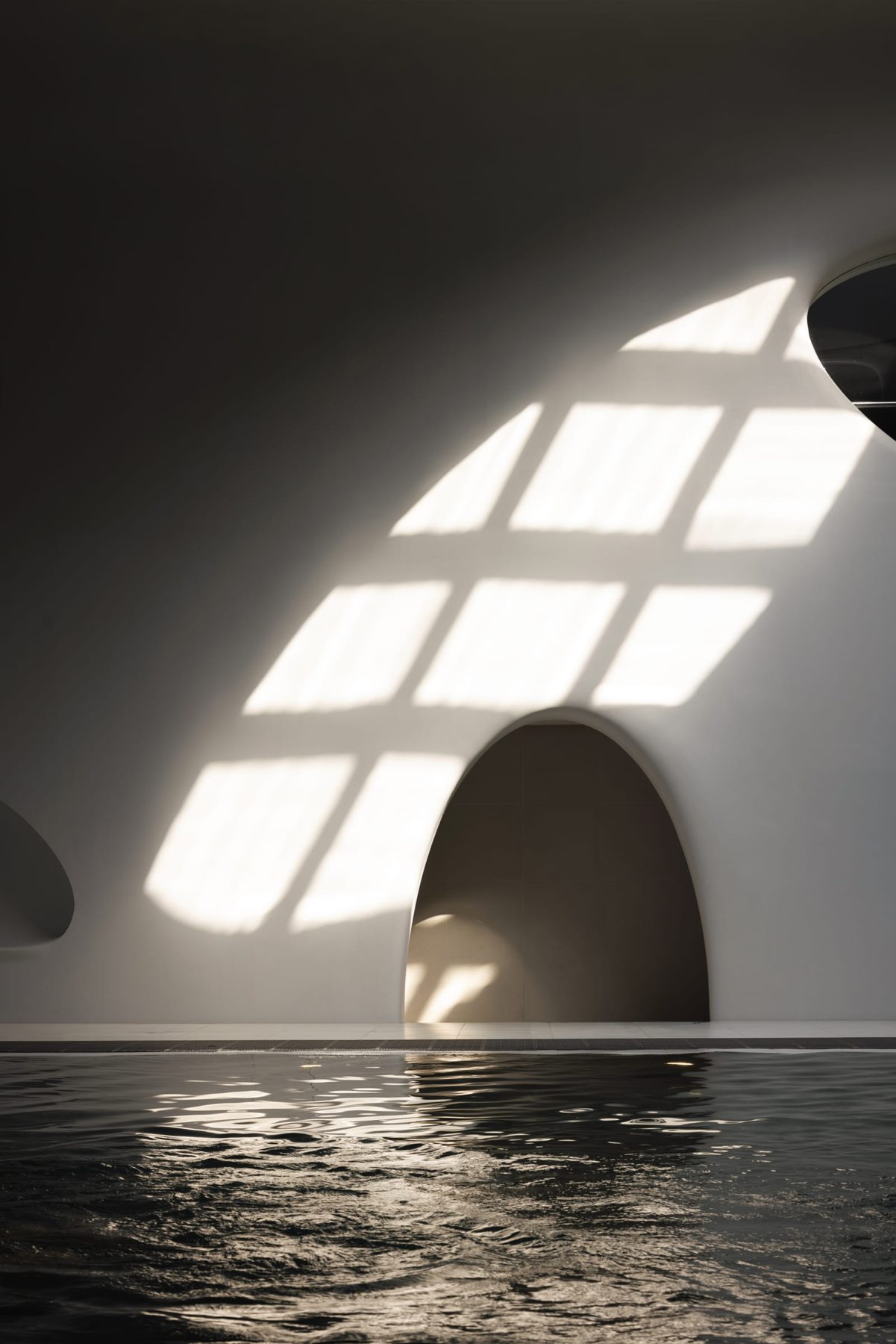 Stone and cave are both shelter and enclosure. Thus, light is essential. Sunlight enters through a 26-square-meter skylight and the northern curtain wall, illuminating the cavern. The ceiling and walls are finished in a unified soft grey-white, blended through curved transitions—an abstracted cave. Reflected water light shimmers on the surfaces, making even the solid seem to ripple, just like one’s emotions.