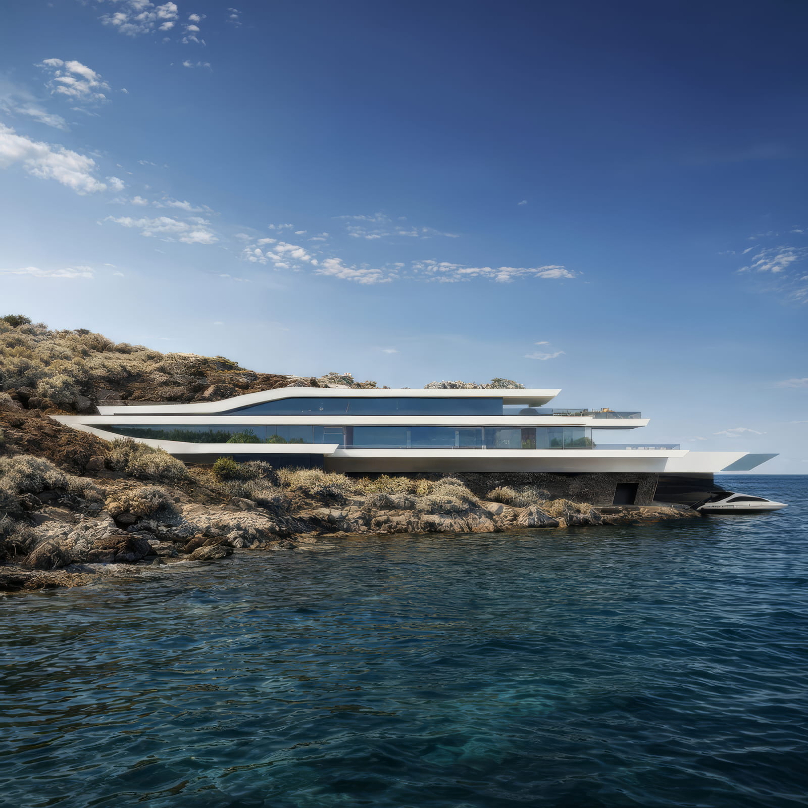 Τοποθετημένη στο όριο μεταξύ θάλασσας και στεριάς στο νησί της Κέρκυρας, η κατοικία προσφέρει μια διττή ανάγνωση που μεταβάλλεται ανάλογα με τη θέση του παρατηρητή: από τη στεριά ενσωματώνεται διακριτικά στο τοπίο, ενώ από τη θάλασσα οι έντονες γεωμετρικές της χαράξεις αναδύονται δυναμικά, παραπέμποντας στη μορφολογία ενός πολυτελούς σκάφους.