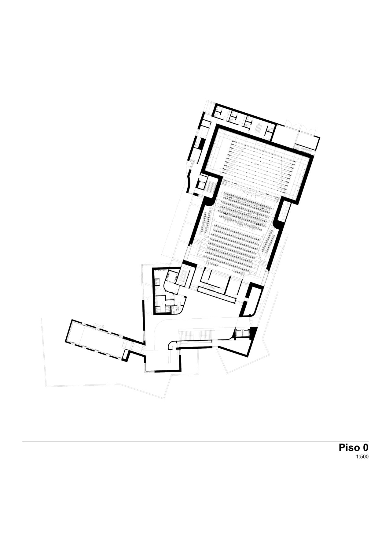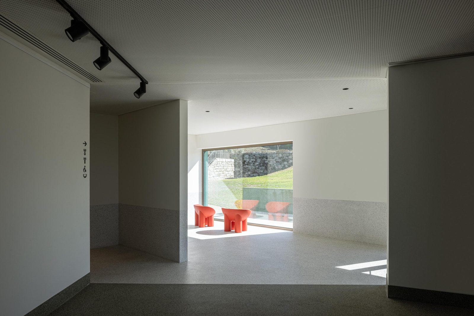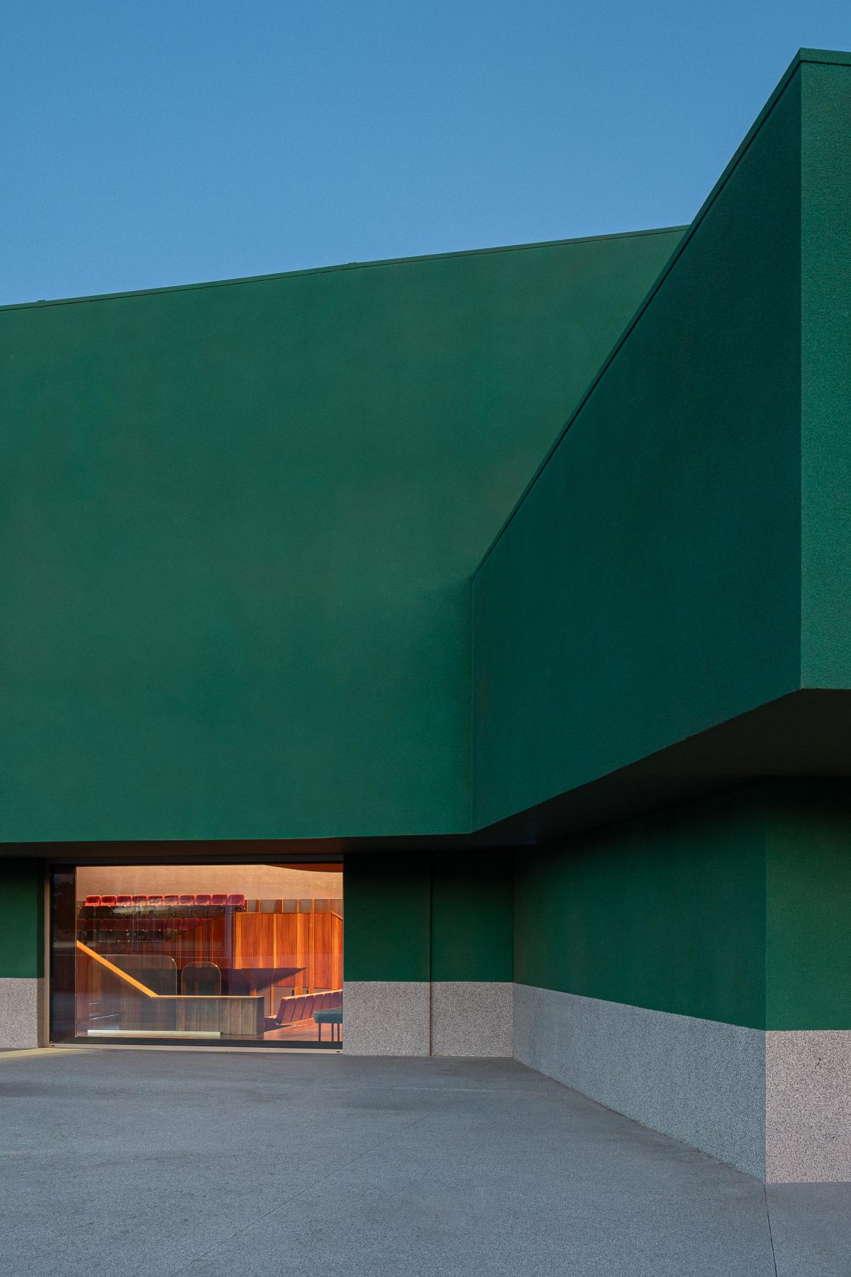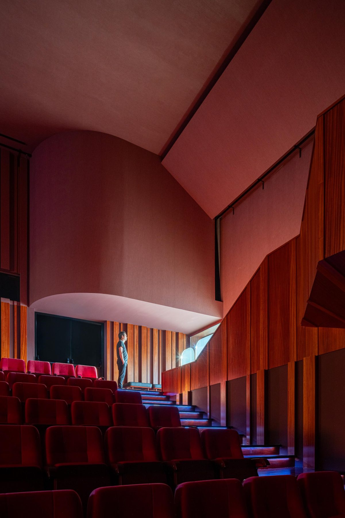 If the reception square acts as a welcoming carpet guiding visitors inside, the auditorium contrasts with the exterior, dressed formally, where deep red tones warm the space awaiting its audience.