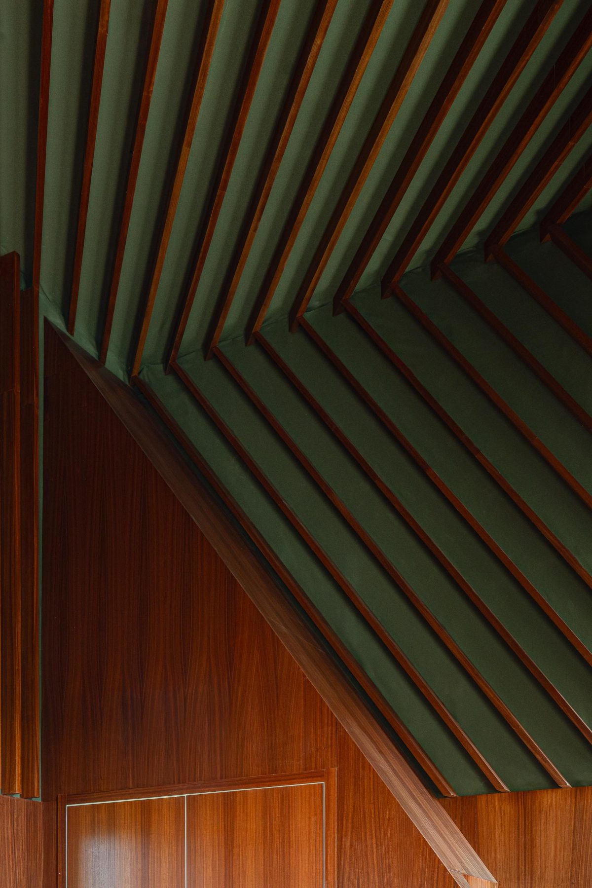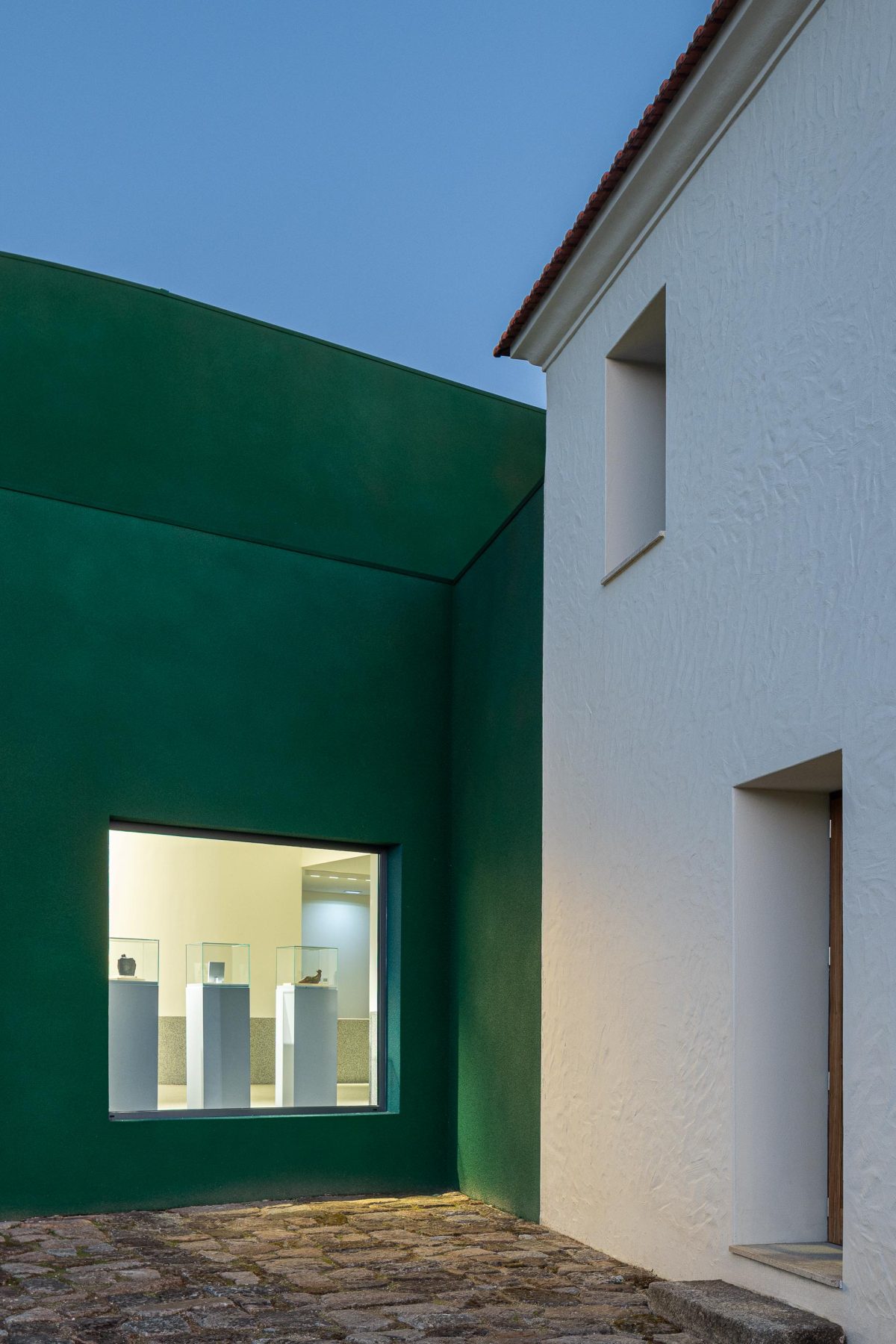 The presence of the old structure remains, giving way to new textures and functions; yet what stands out is the boldness of its color: green, which over time is expected to blend gradually with the surrounding vegetation. The projected cork appears differently depending on the angle and light, as if offering multiple interpretations of an artistic piece.