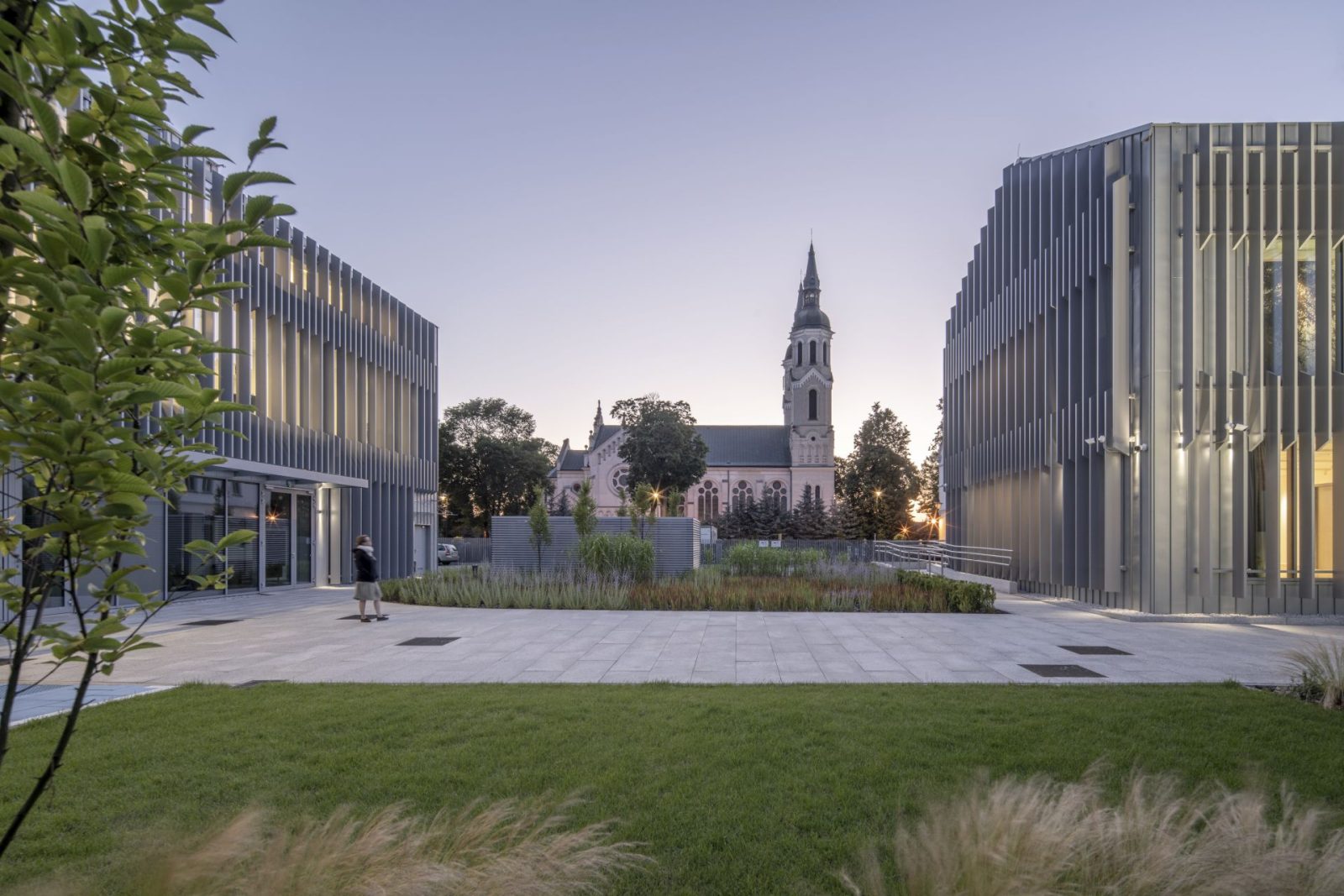 The institution, however, required more space for both exhibitions and administrative functions. The architecture of the new part of the museum – an extension of the existing building and a new structure located deeper within the plot, serving as a spatial counterpoint – continues the form of a townhouse from the turn of the 19th and 20th centuries, with its steep gable roof. Its façade is composed of a structure of vertical rhythms, which, through the sculptural use of light and shadow, gain variability depending on the time of day and year. Designed to serve as a subtle backdrop to the historic building, it also gently references the landscape of Augustów and its surroundings. On a symbolic level, the architecture alludes to the dense forests of the Augustów Forest, which was the place of the tragic events of the Augustów Roundup.