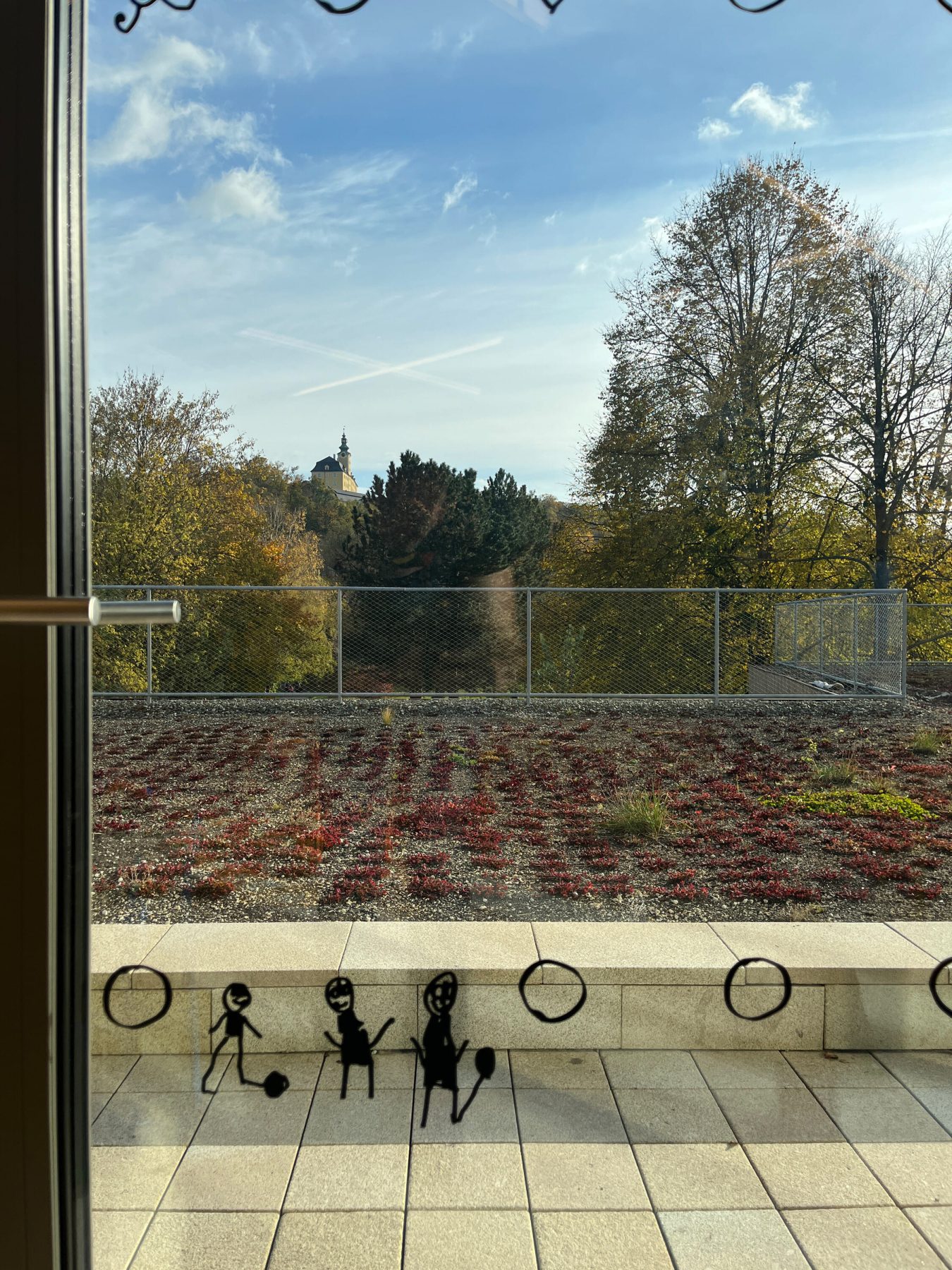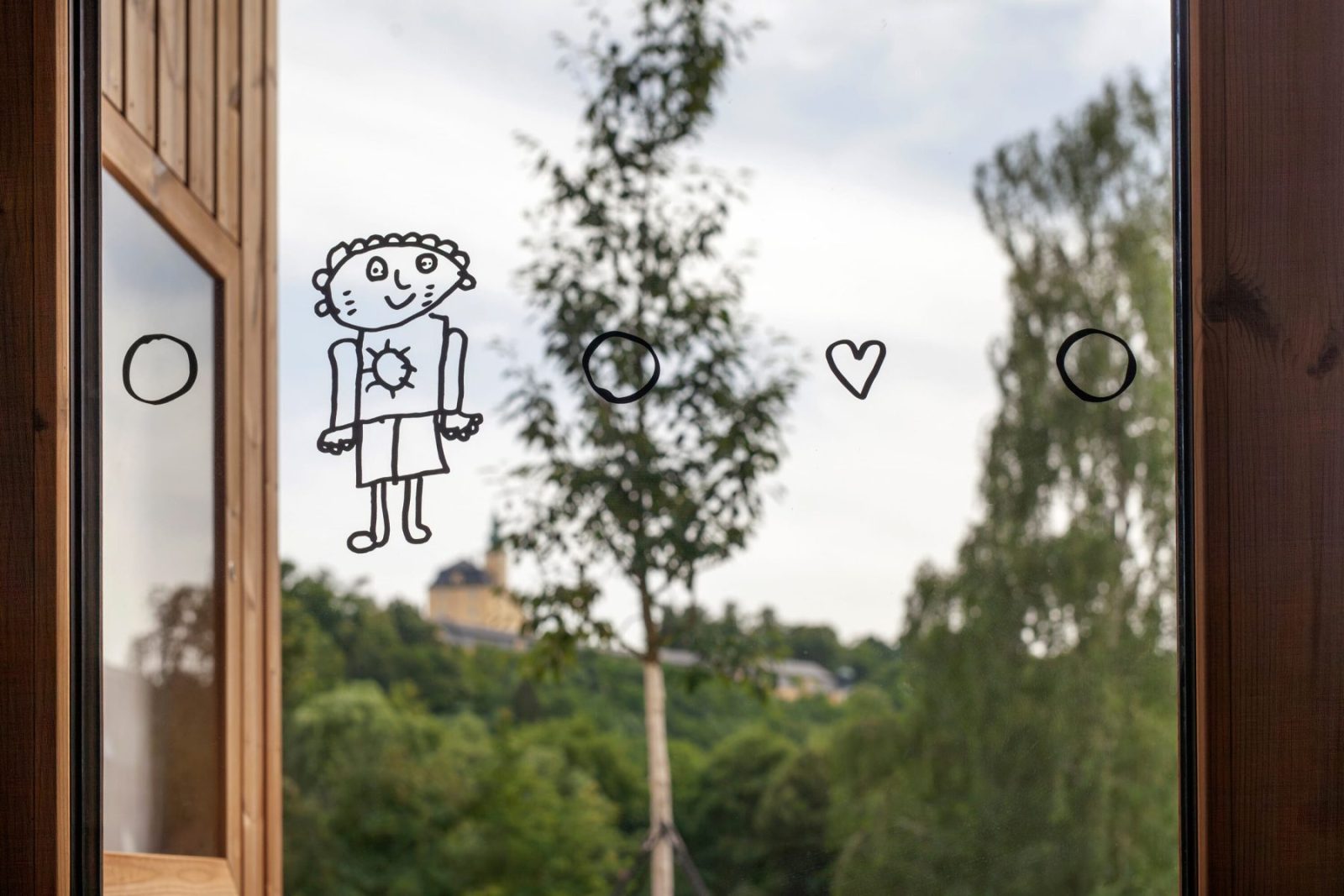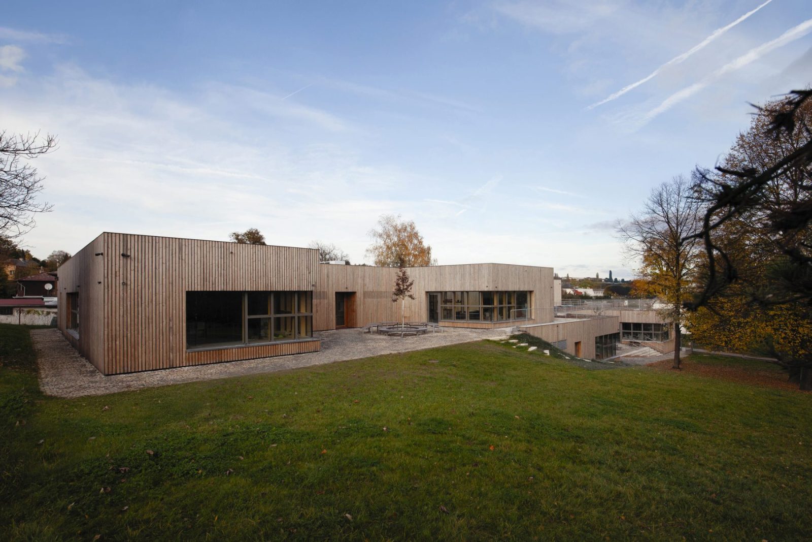 The new kindergarten in Fulnek is nestled into the northern part of its plot, set within an expansive garden. It boasts both generous space and open views—its entire southern façade opens toward the landscape and frames distant vistas of the château, the town’s commanding landmark, majestically seated on the opposite hill.