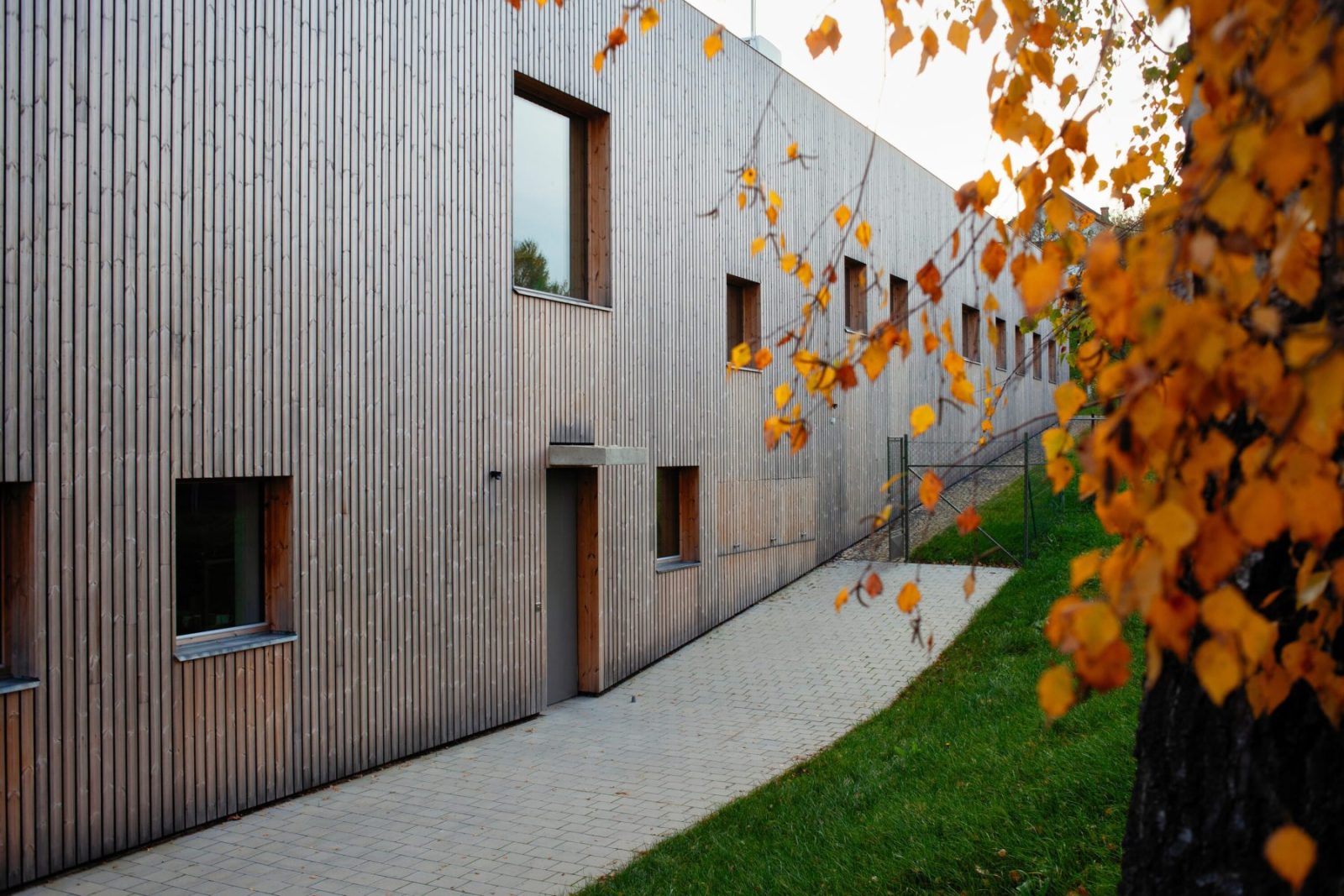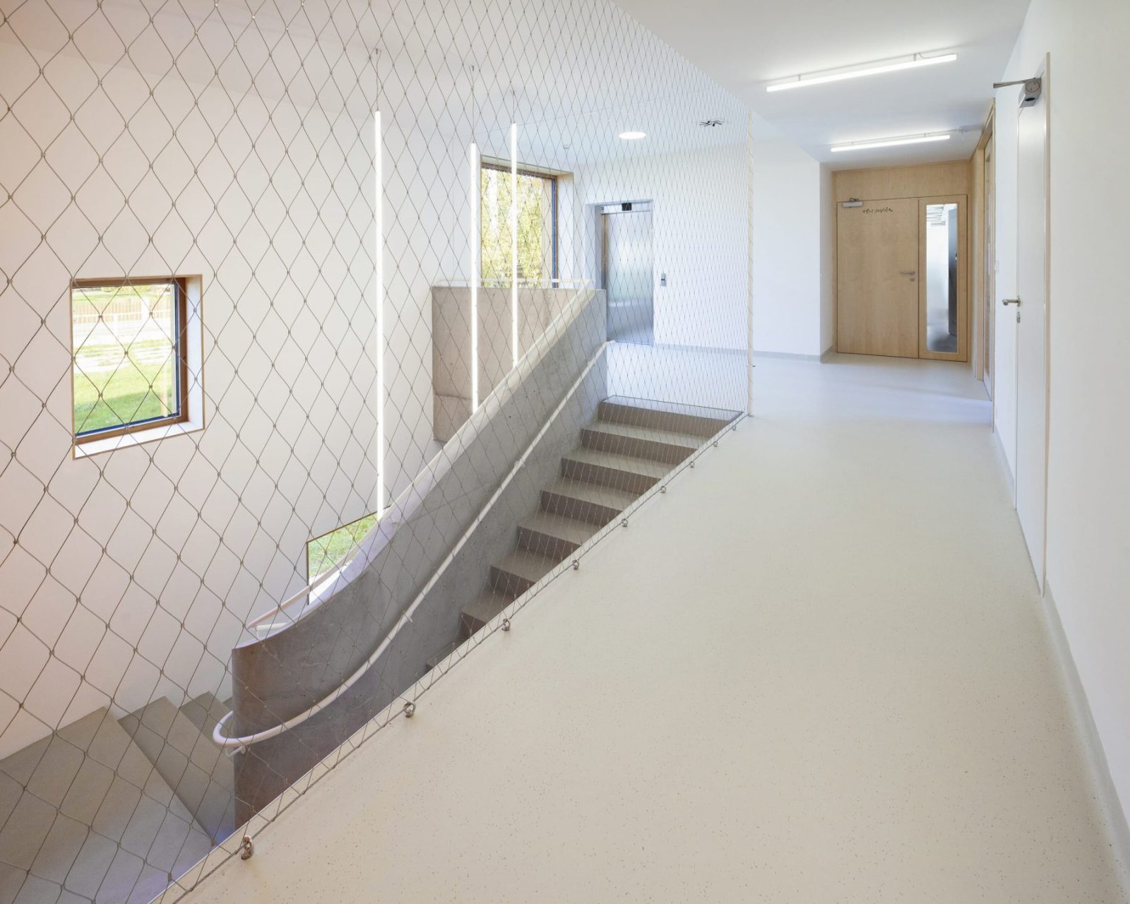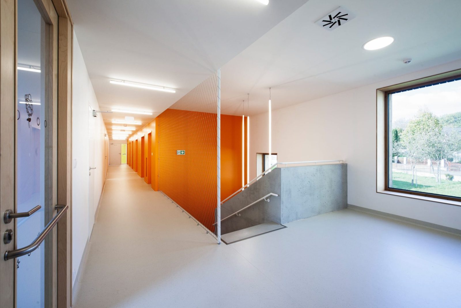 The kindergarten is horizontally connected by a corridor and vertically by a central staircase hall. Four classrooms are located on the ground floor, paired around shared outdoor atria, which also function as semi-sheltered entrances. Through these glazed vestibules—visually connected to the classrooms—children move into their individual cloakrooms, gradually transitioning from public space into their familiar environment.