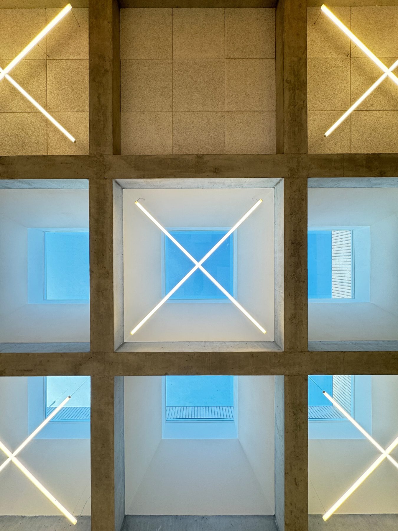This concept is driven by a recurring square motif, expressed at multiple scales: from ceiling joists and window frames to acoustic panels, modular furniture, movable storage boxes, and even LEGO bricks.