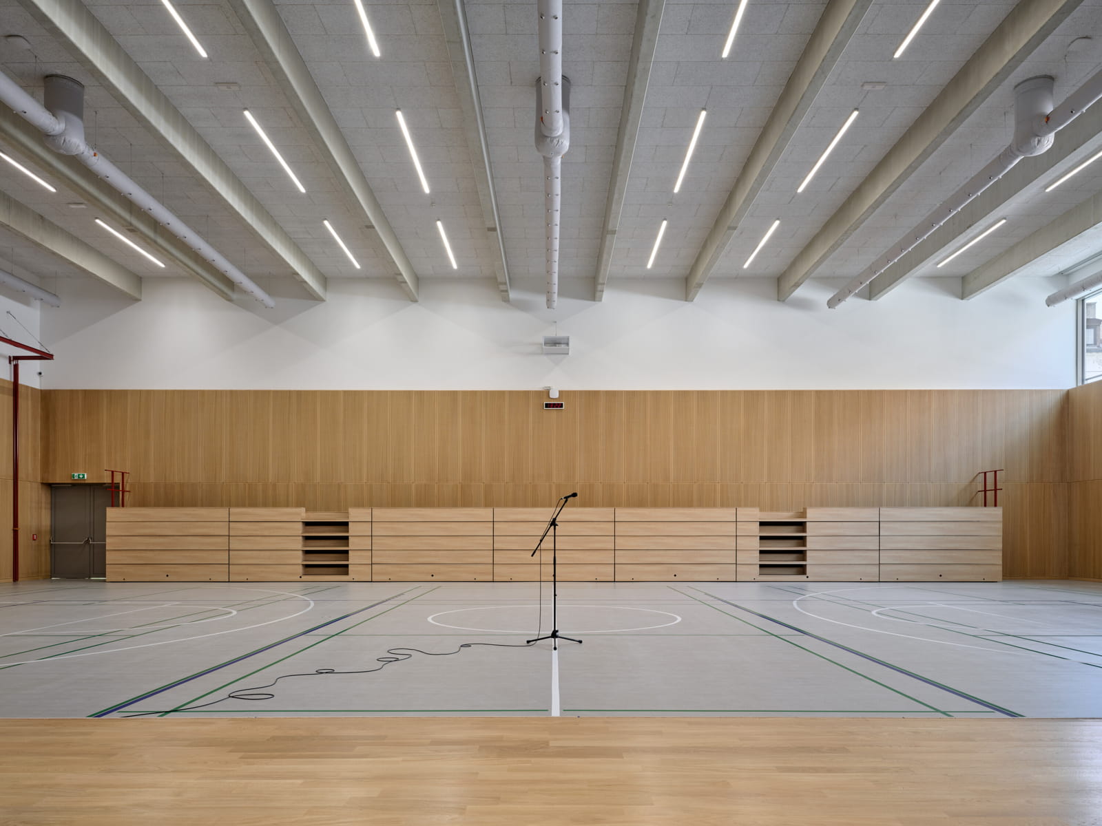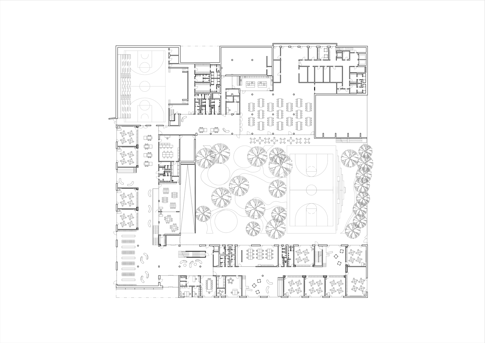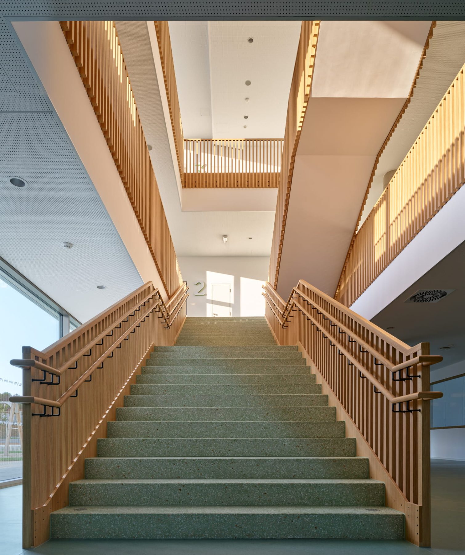 The upper grades are located in the southern wing on the second floor and are accessible via the central staircase. The corridor in the southern wing is expanded with bays intended for alternative learning. Beneath the covered grandstand on the third floor are an outdoor classroom, a service courtyard, and access to the roof terrace.