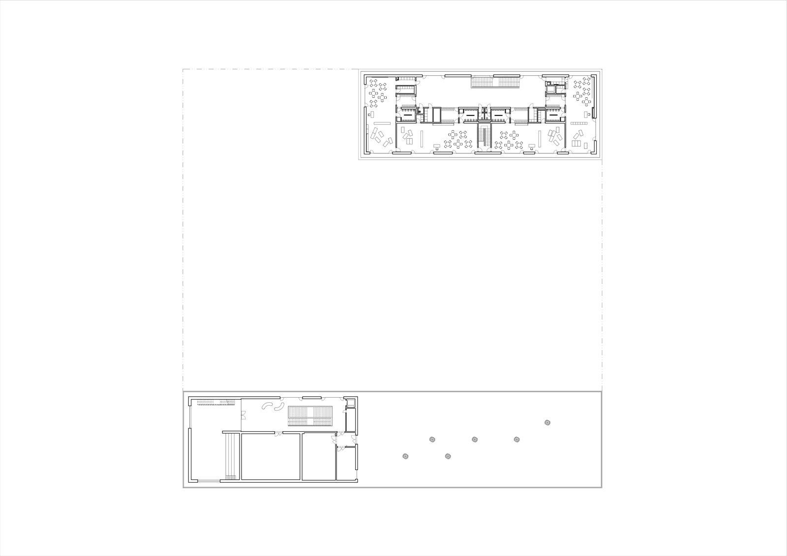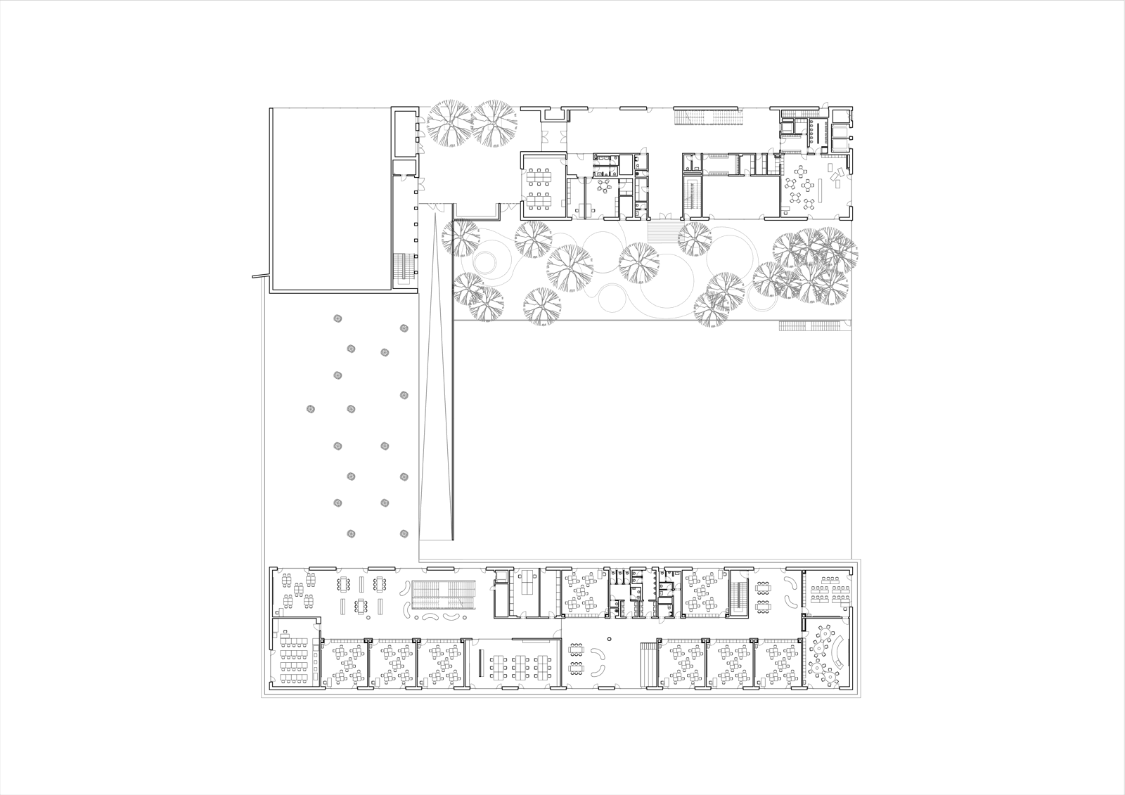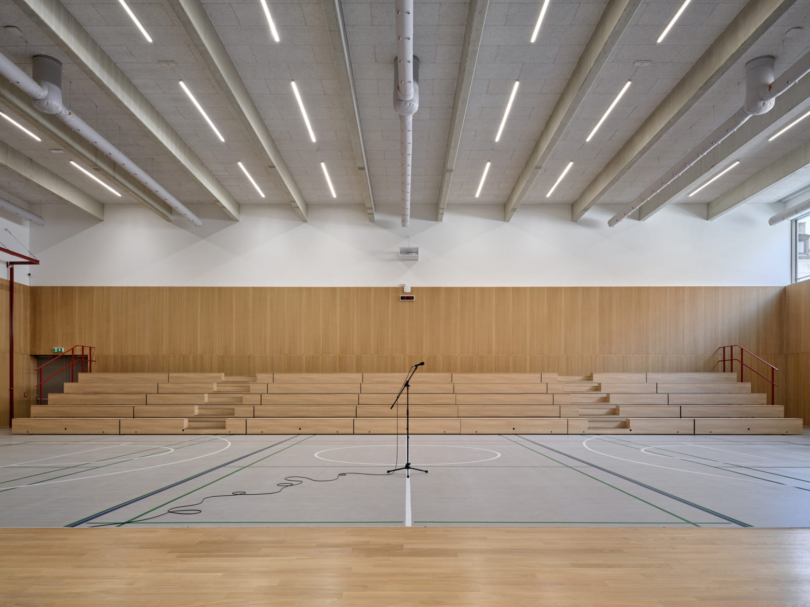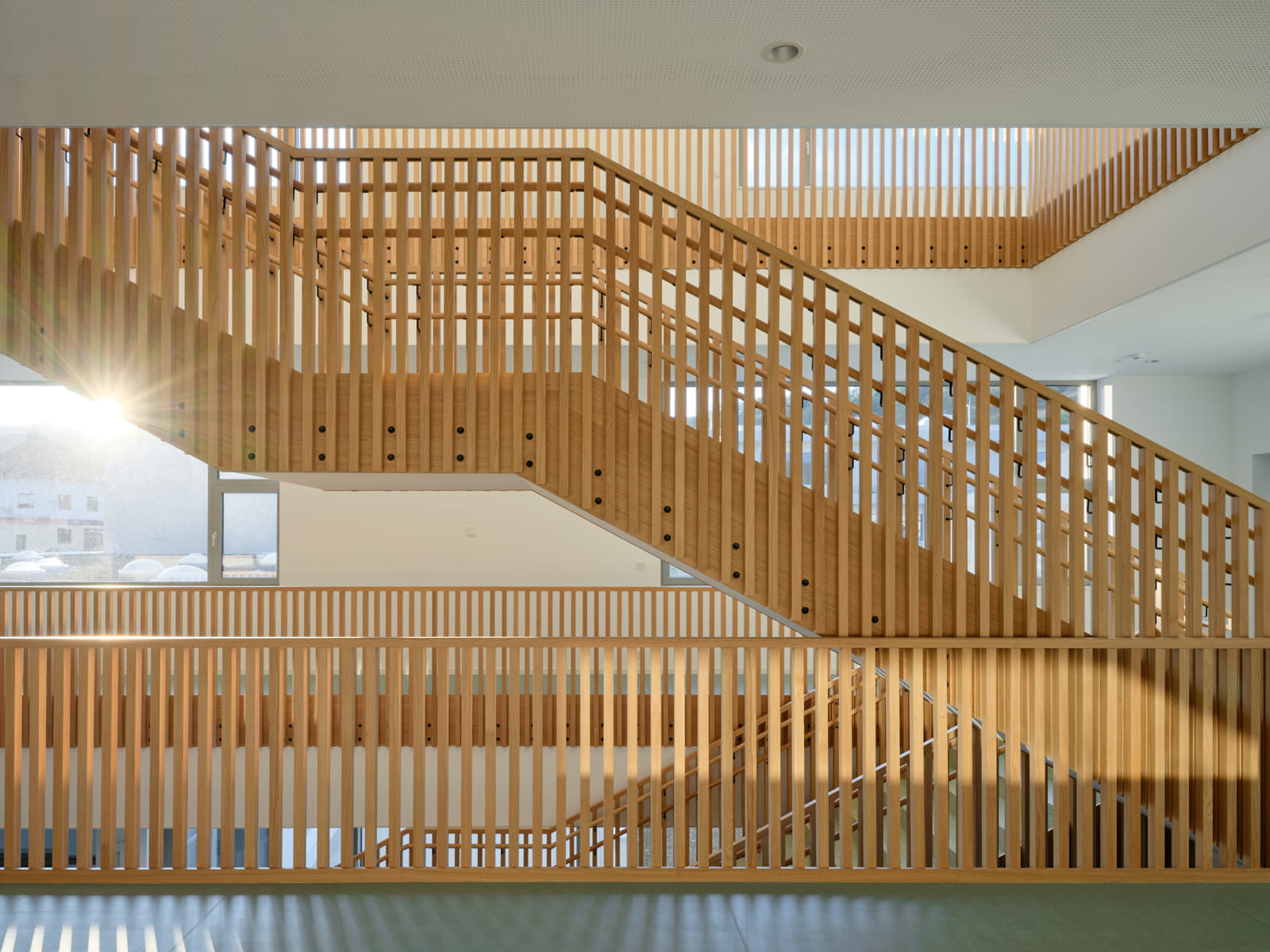 The upper grades are located in the southern wing on the second floor and are accessible via the central staircase. The corridor in the southern wing is expanded with bays intended for alternative learning. Beneath the covered grandstand on the third floor are an outdoor classroom, a service courtyard, and access to the roof terrace.