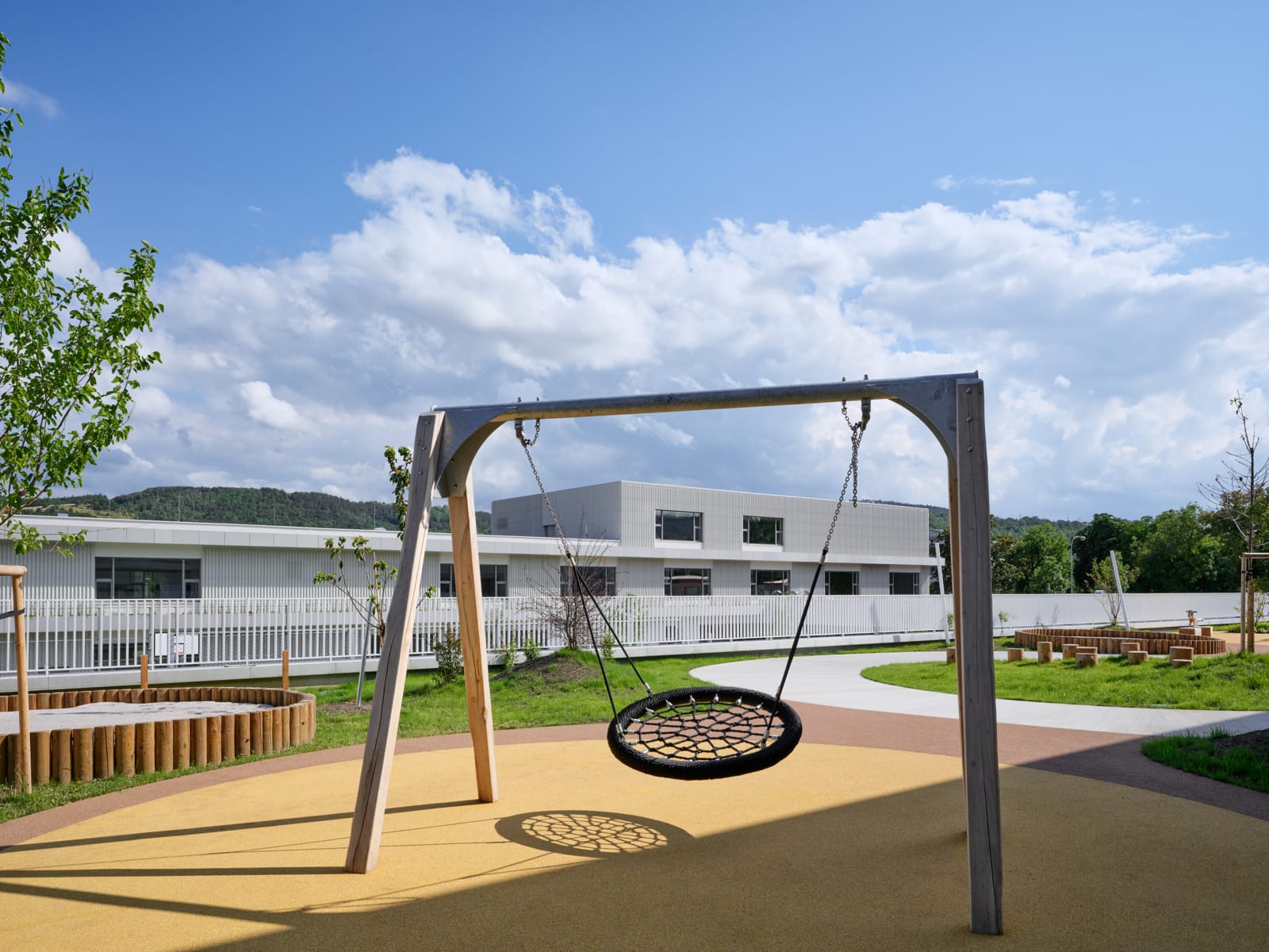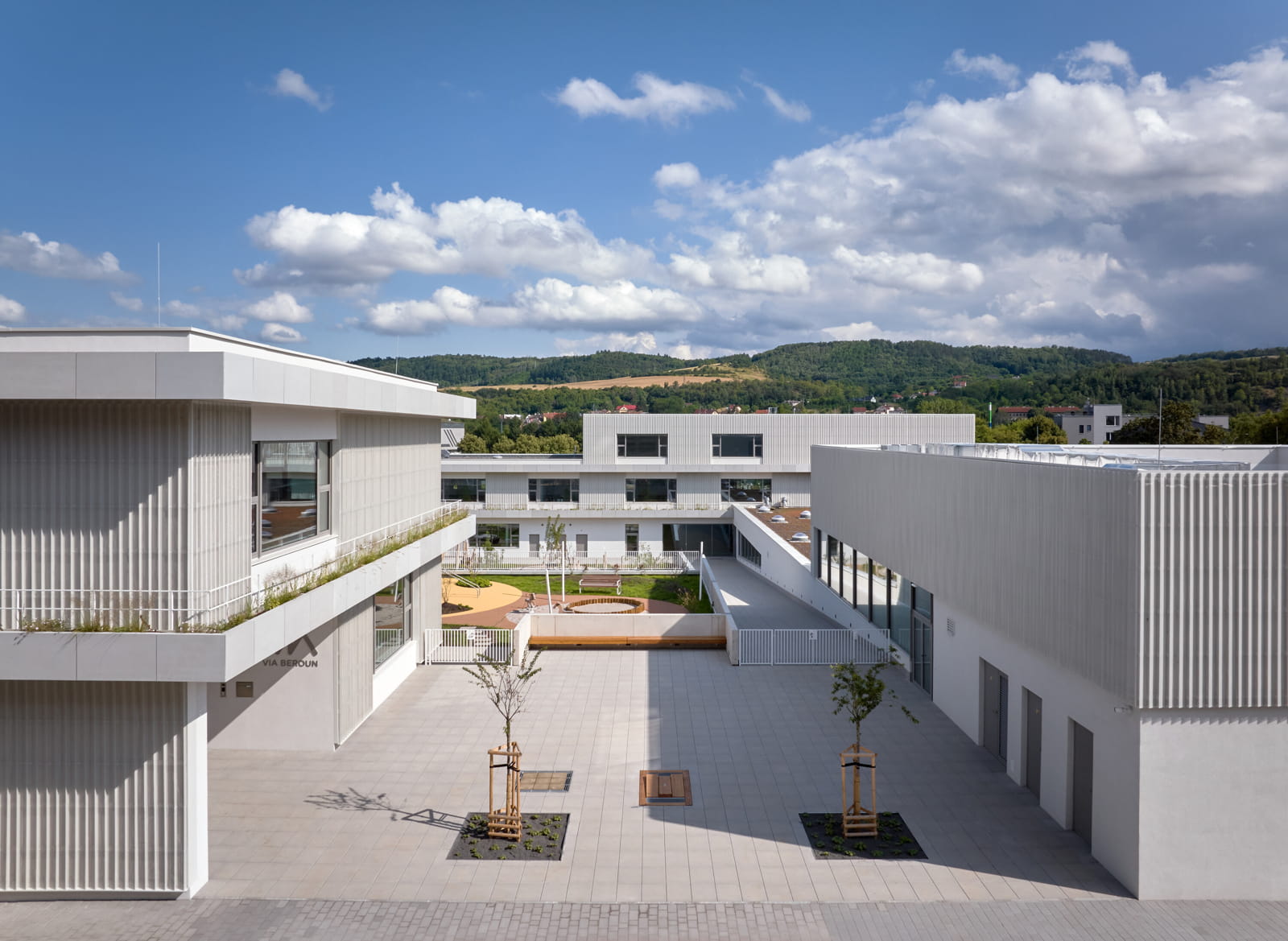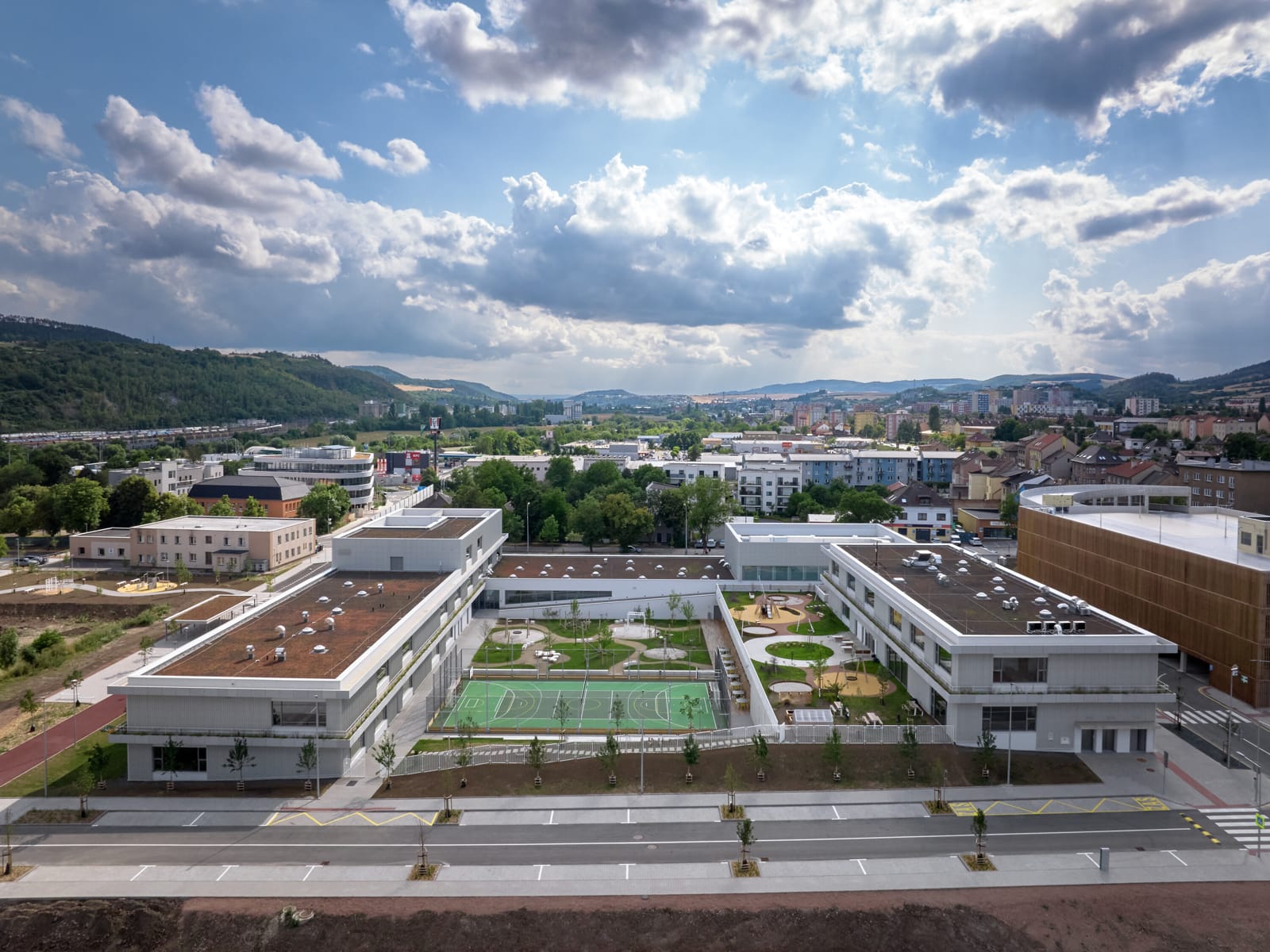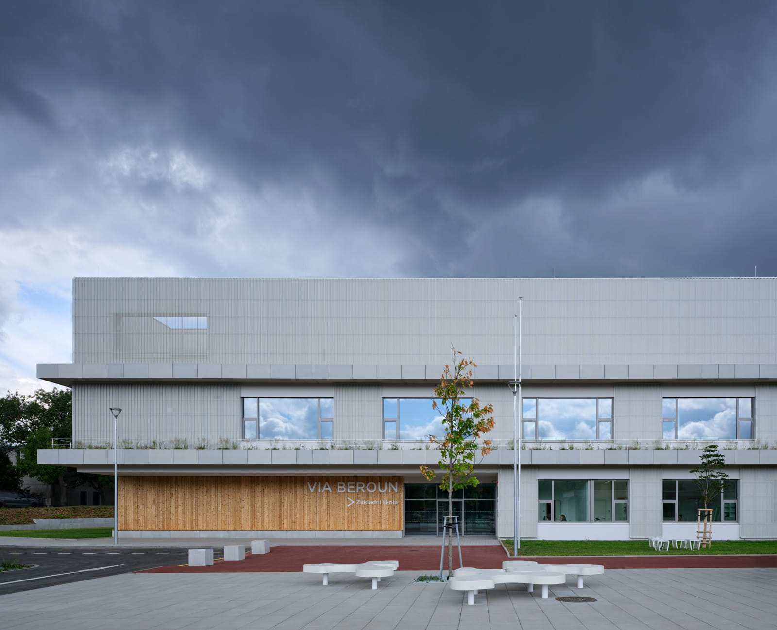 Located near the historic center of Beroun, the VIA school campus, comprising a kindergarten and elementary school, transforms a former industrial site into a vibrant space for learning, play, and community life.