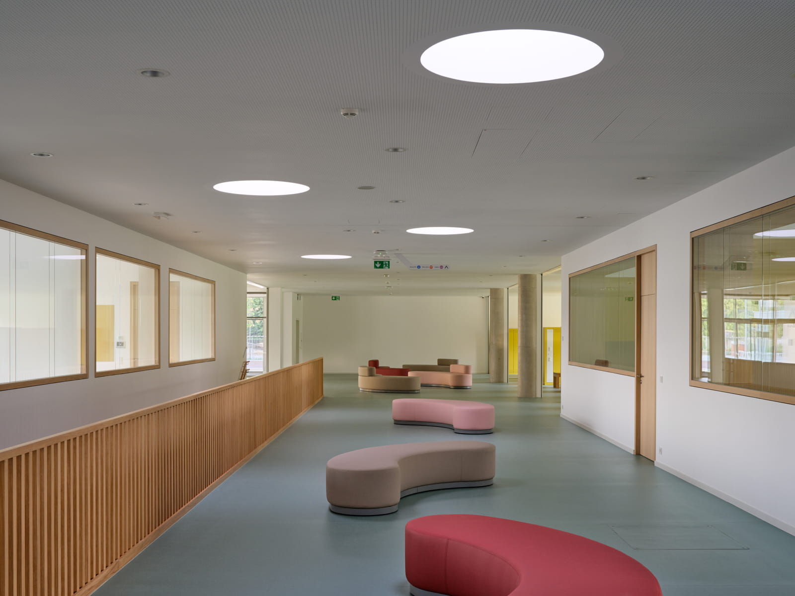 Special attention is given to the unique life of the corridors, which offer generous spaces with various seating types and views into the classrooms.
