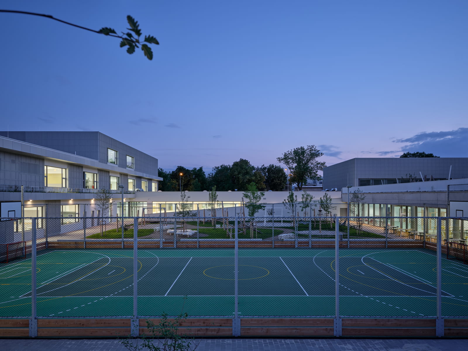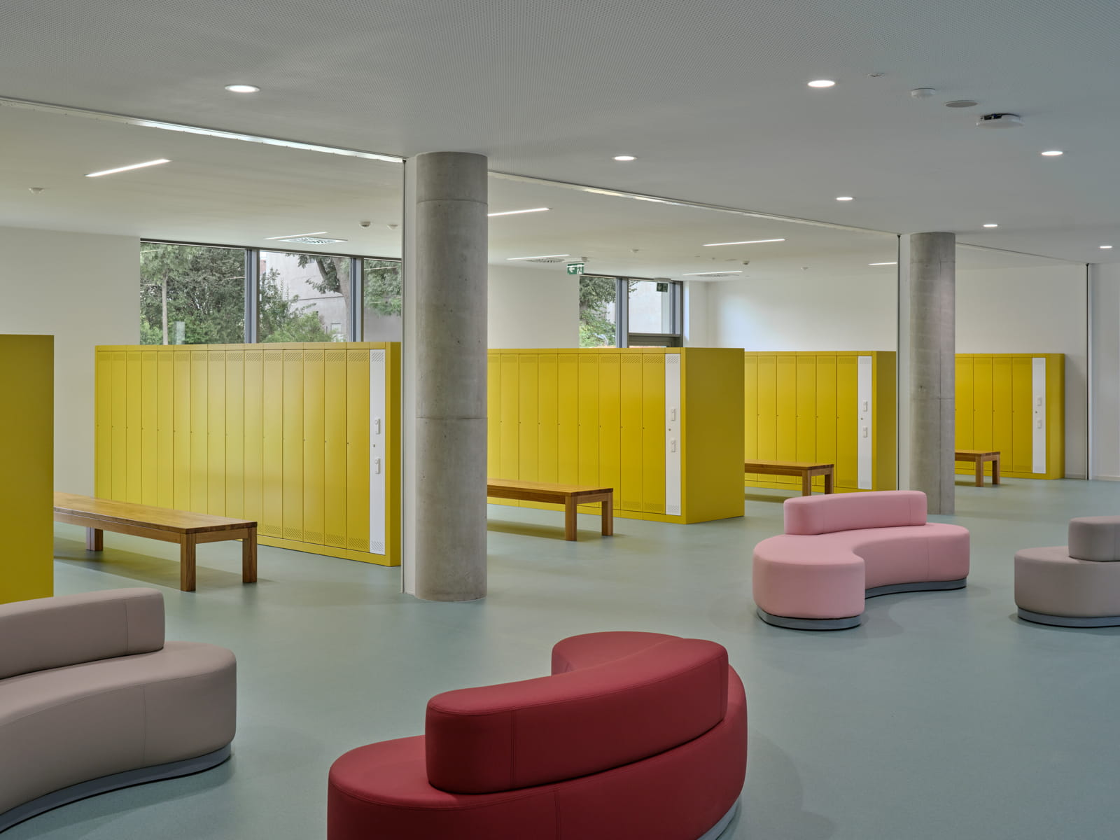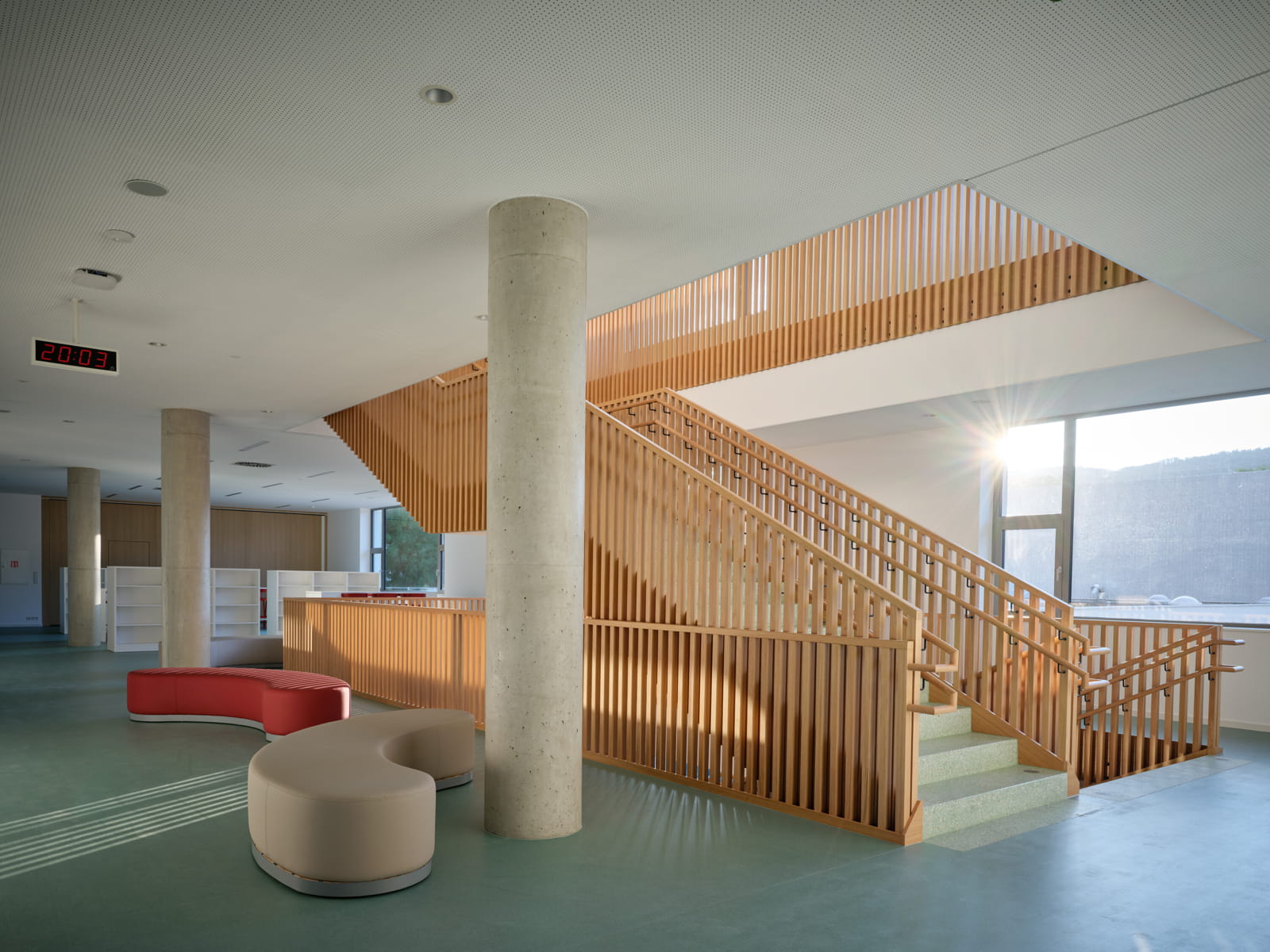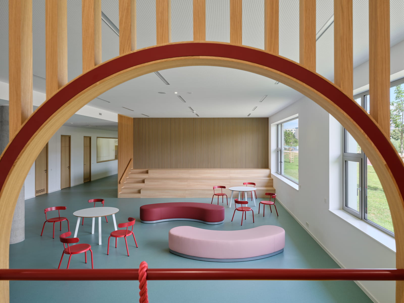 The entrance to the elementary school leads into the main hall, which features a central staircase, an administrative block, and changing rooms. Along the corridors running both north and south are the classrooms for the lower grades, as well as shared spaces for alternative learning, relaxation, and play.