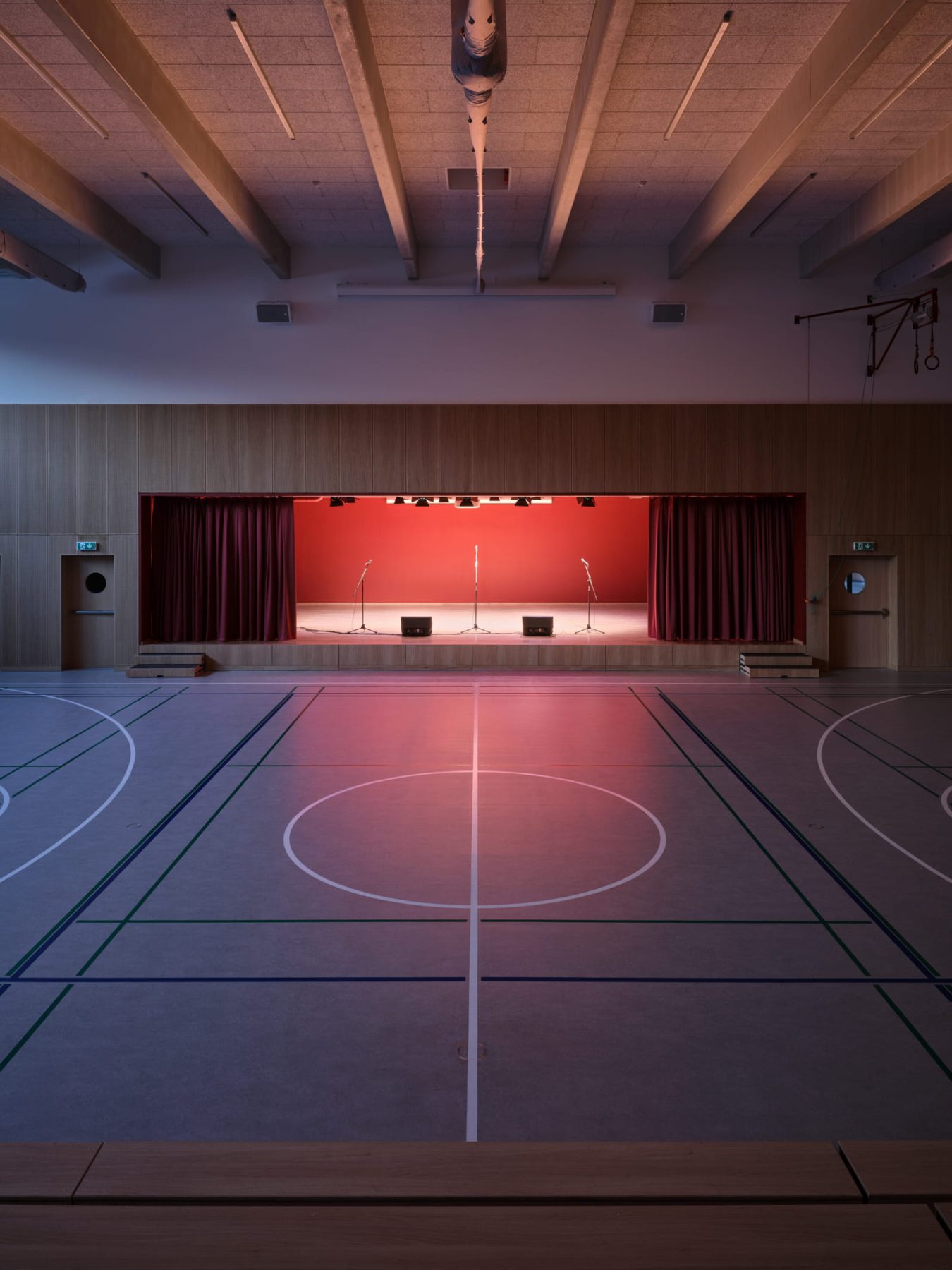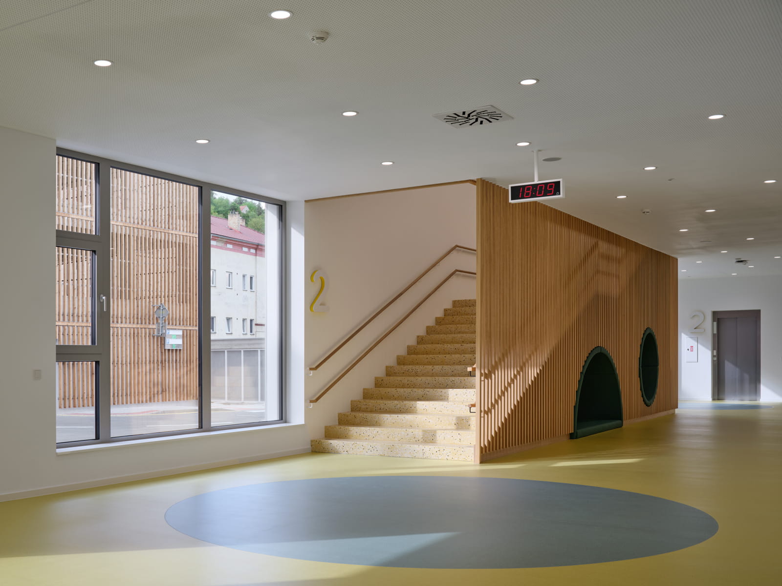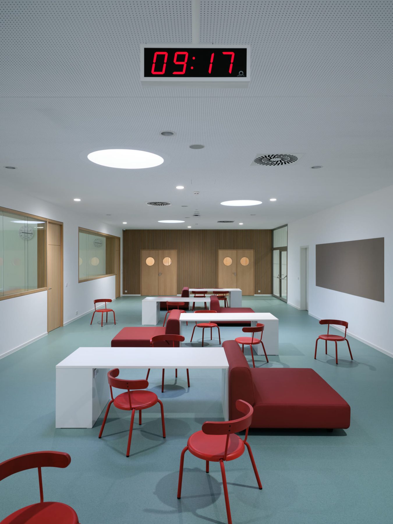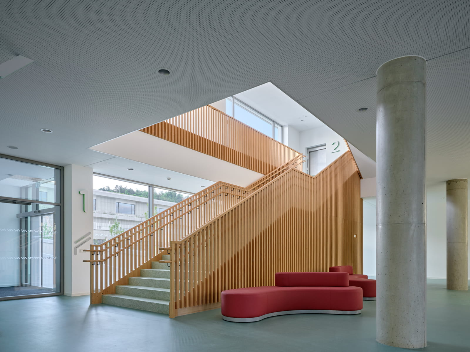 The entrance to the elementary school leads into the main hall, which features a central staircase, an administrative block, and changing rooms. Along the corridors running both north and south are the classrooms for the lower grades, as well as shared spaces for alternative learning, relaxation, and play.