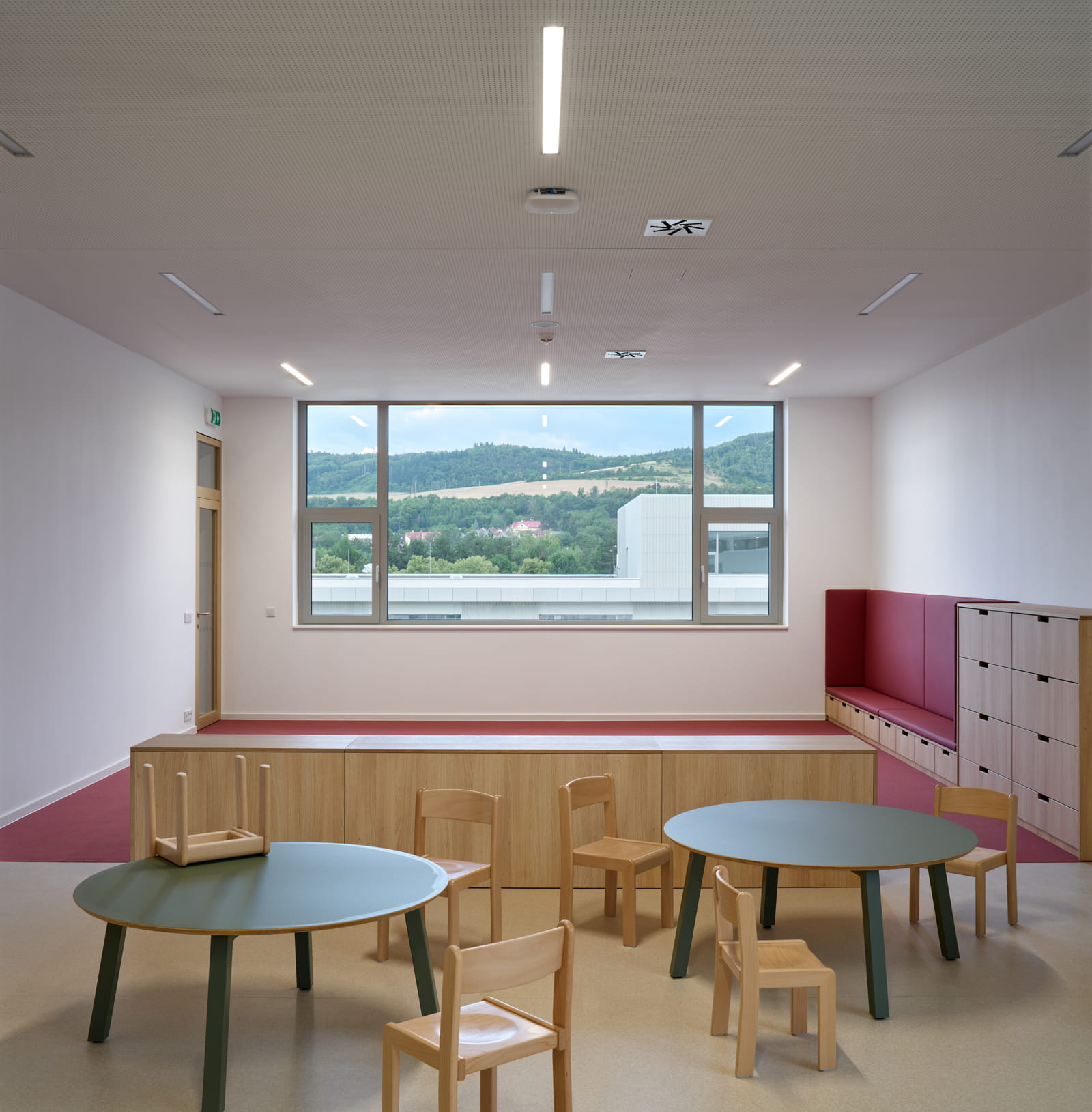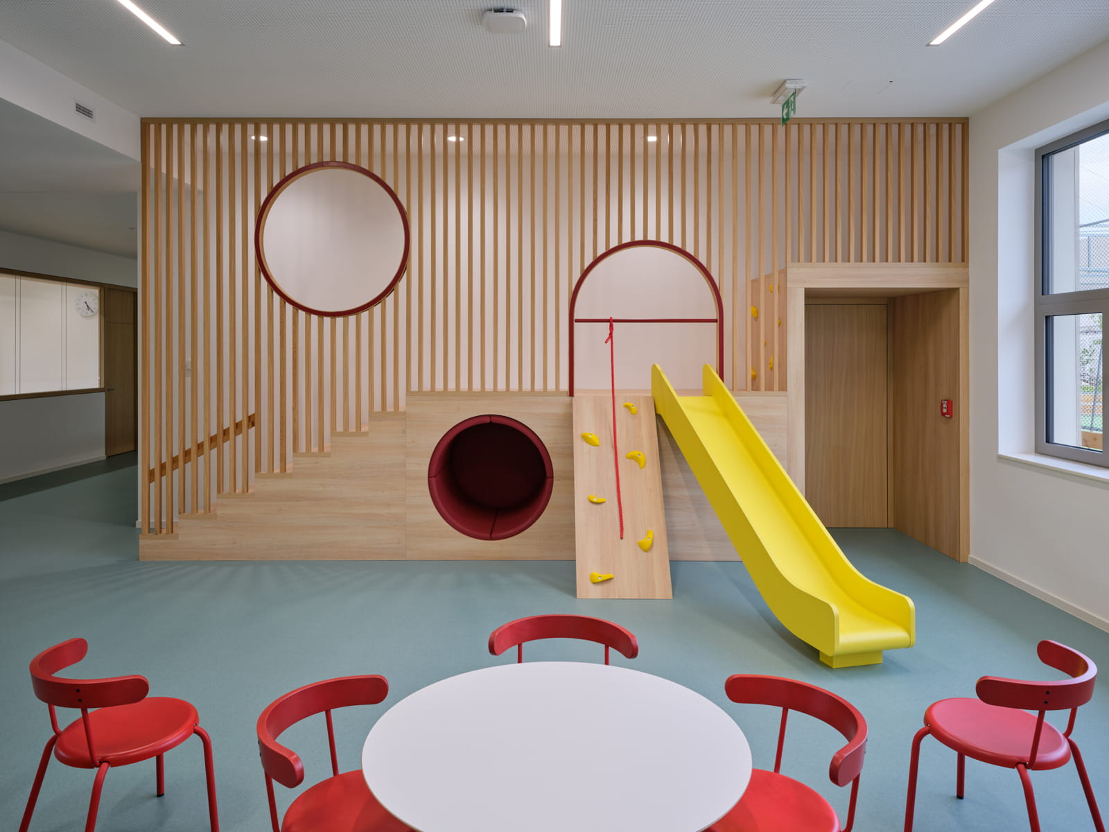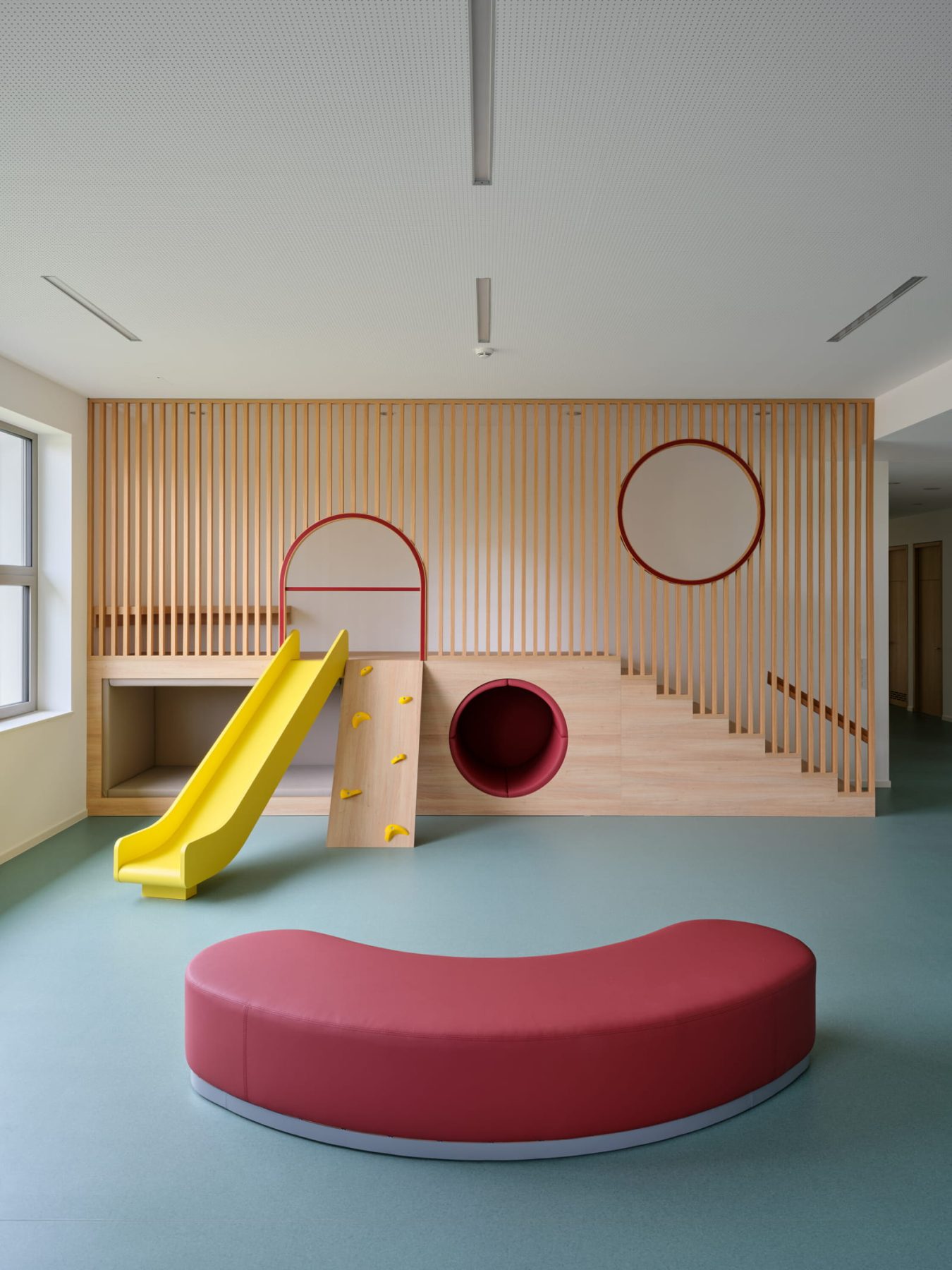 Large windows and skylights allow abundant natural light, while visual connections to the school’s greenery and courtyard integrate the kindergarten into the broader campus environment.