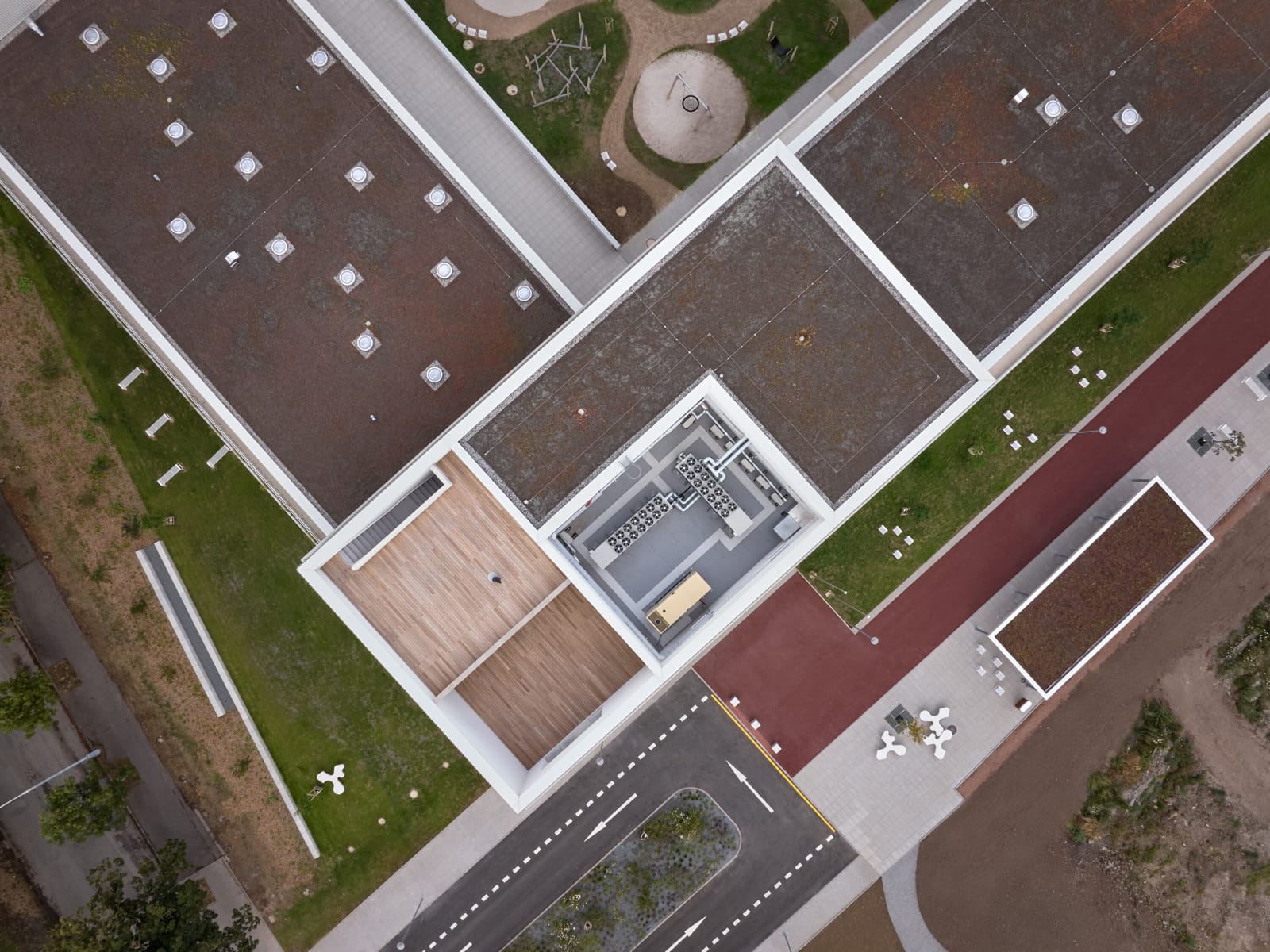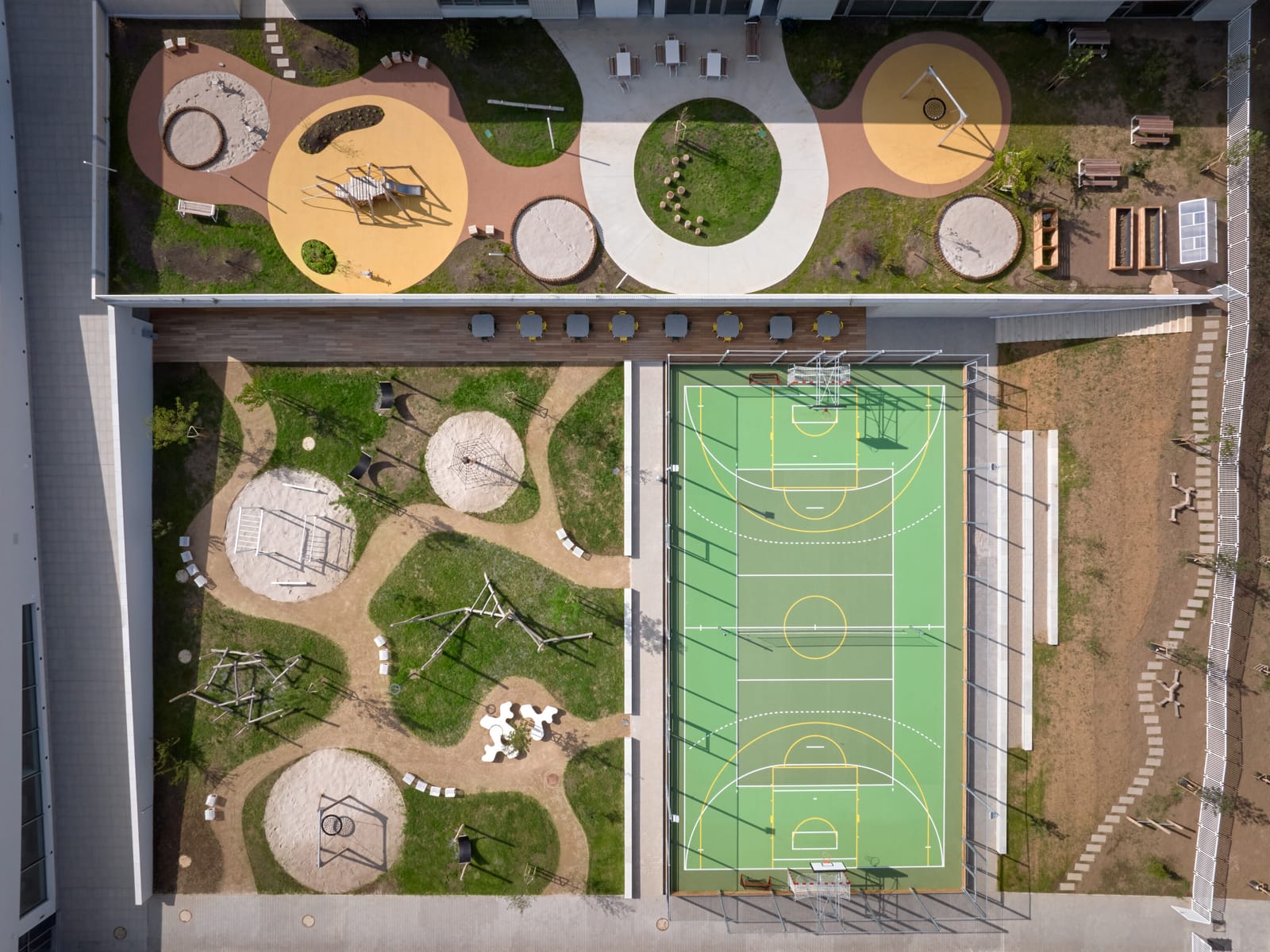 Rooftops host both intensive green roofs with shrubs and small trees and extensive green spaces, complemented by outdoor furniture, exercise installations, and playful elements that provide opportunities for movement, creativity, and connection.