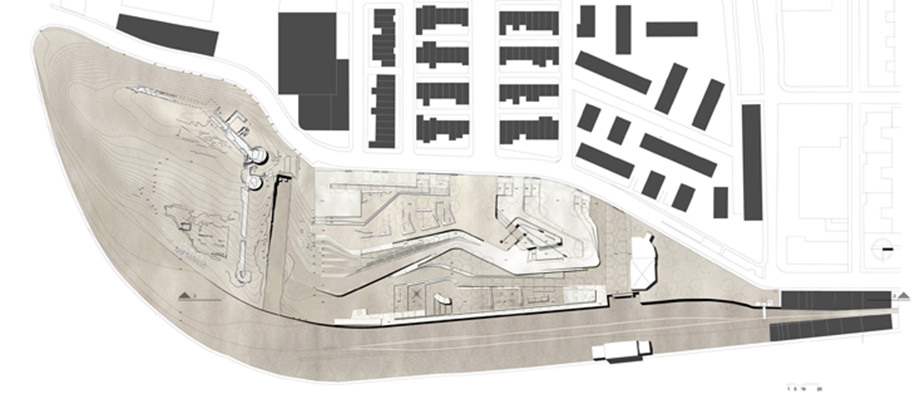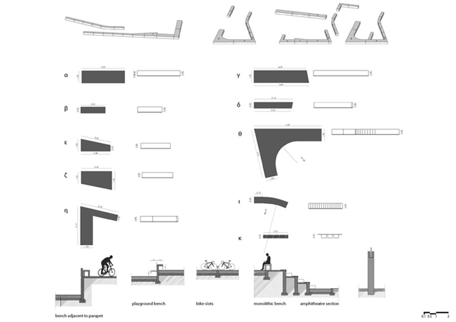 The suspension over the harbor area, in combination with the need to underline the limits of the “Kastraki” area to the port and the railway lines, lead to the creation of a route which is designed as a dislocated fortress wall and as a new linear “edge” of the city.