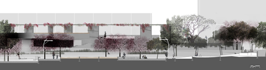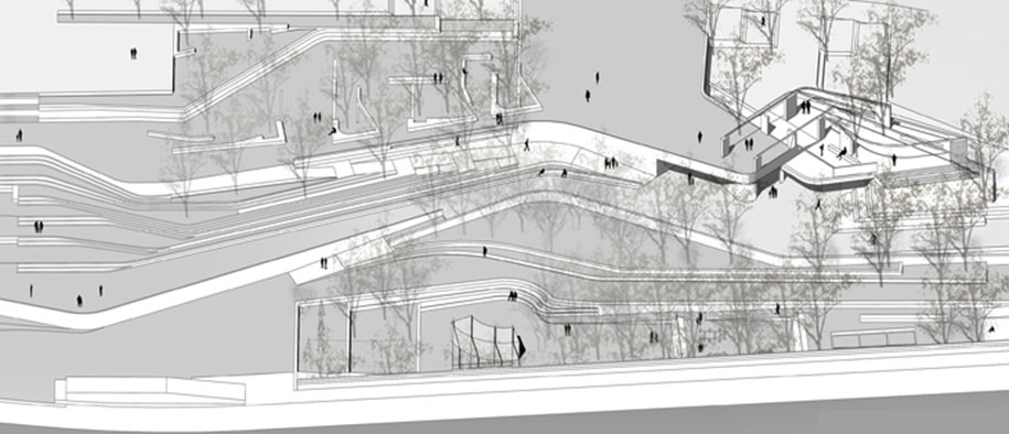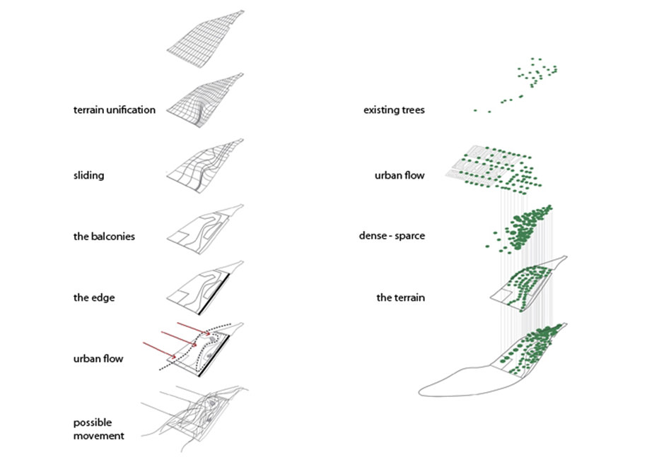 The exploitation of the differentiated views is achieved through a sliding process which is applied to the different levels of the terrain, producing a set of exterior-referenced areas (the square, the balconies), while the individual treatment of specific areas generates leisure and rest units which are more internal and self-referential (the hanging garden, the “forest”, the playground).