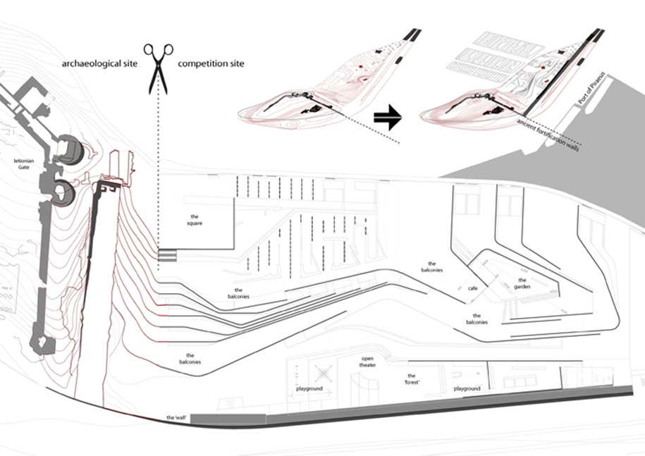 The purpose of this competition is to establish a design for the “Kastraki” area, whose identity is constituted by certain spatial characteristics such as the proximity with the archaeological site of Ietioneia Gate and the port of Piraeus, the geomorphology of the area and its position in relation to the urban fabric. The proposal for the “Kastraki” area intends to strengthen these special qualities in a manner that would unify the study area with the archaeological site of Kastraki, both perceptually and spatially. More specifically, it intends to