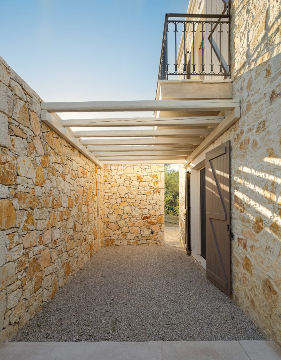 The complex consists of the main stone building of double height, with a gabled roof, which includes the living room, the open kitchen and the dining area, a two-storey building, which includes bedrooms, and an independent ground floor building that houses the hostel. The relation between the three buildings is defined by the orthogonal placement of the two; the building of the rooms, and the central with the living spaces, which are connected by an entrance corridor, while the guest room is rotated, for reasons of privacy. This displacement leaves a passage through the back, enclosed courtyard to the outdoor areas in front of the house, and the pool.