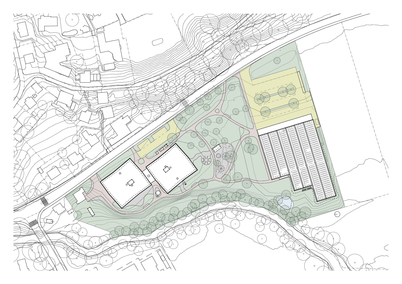 The two buildings stand freely in the landscape, connected by gently curving paths through a generous park.