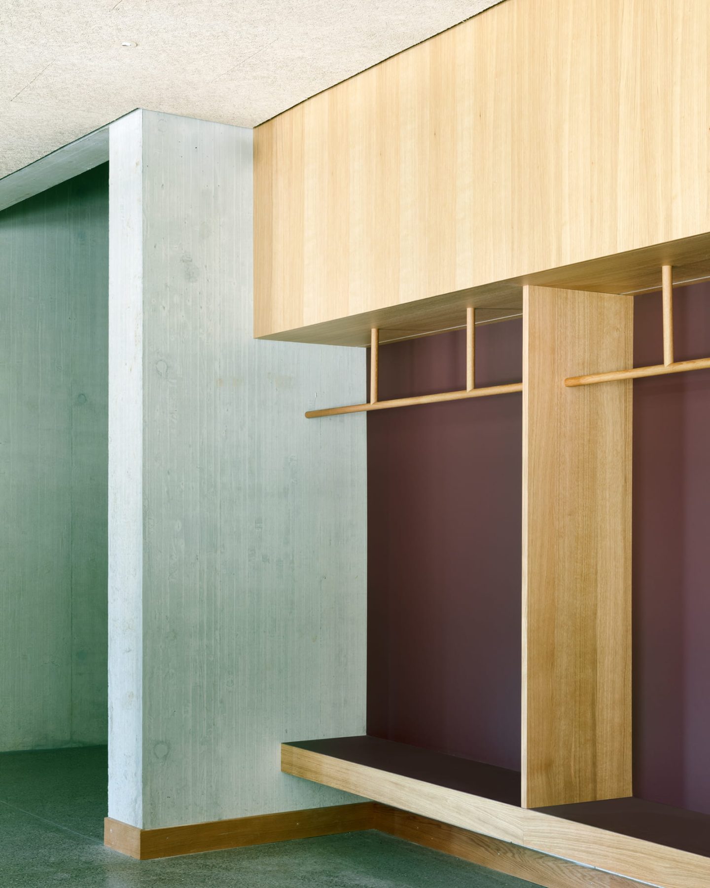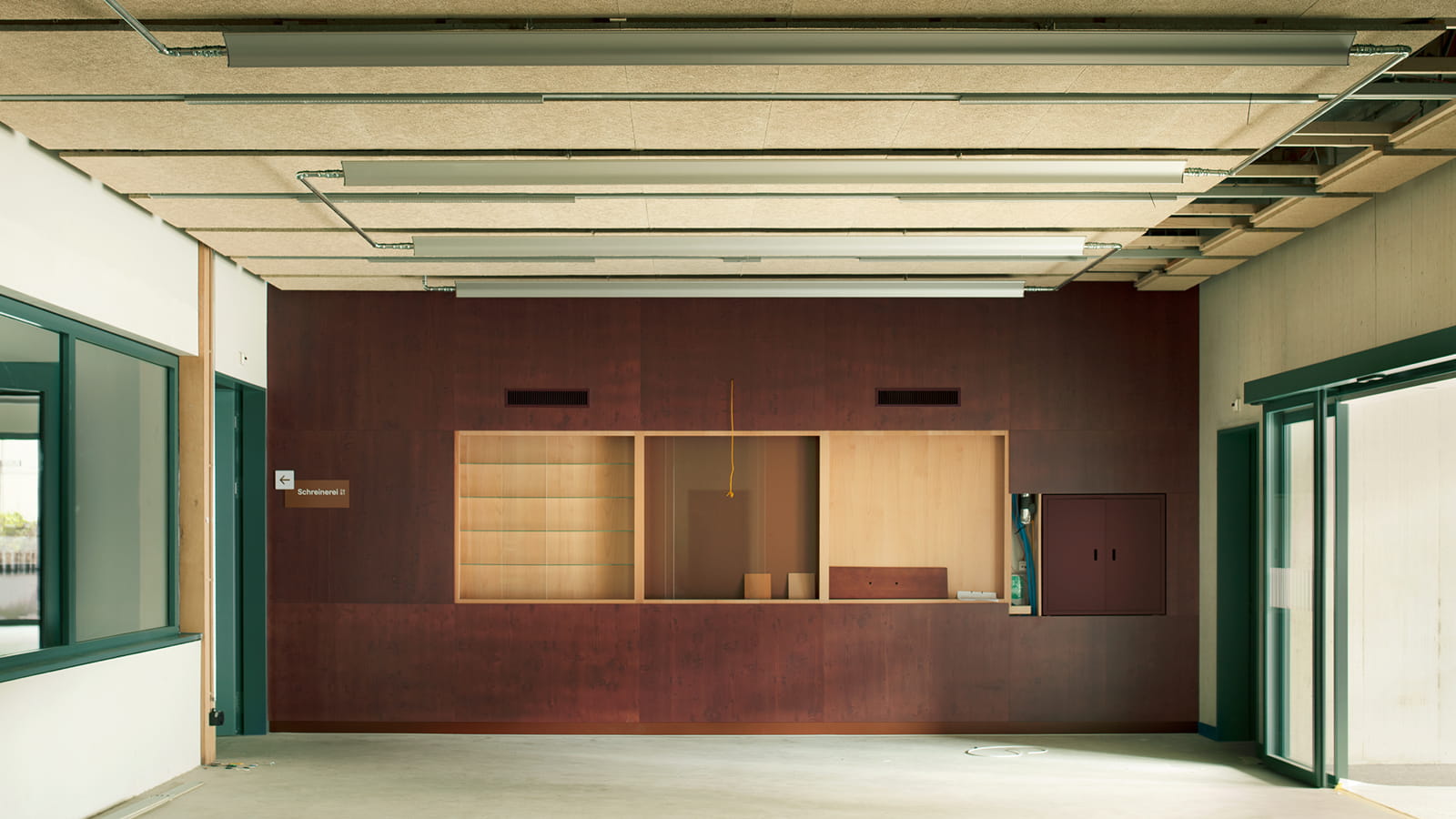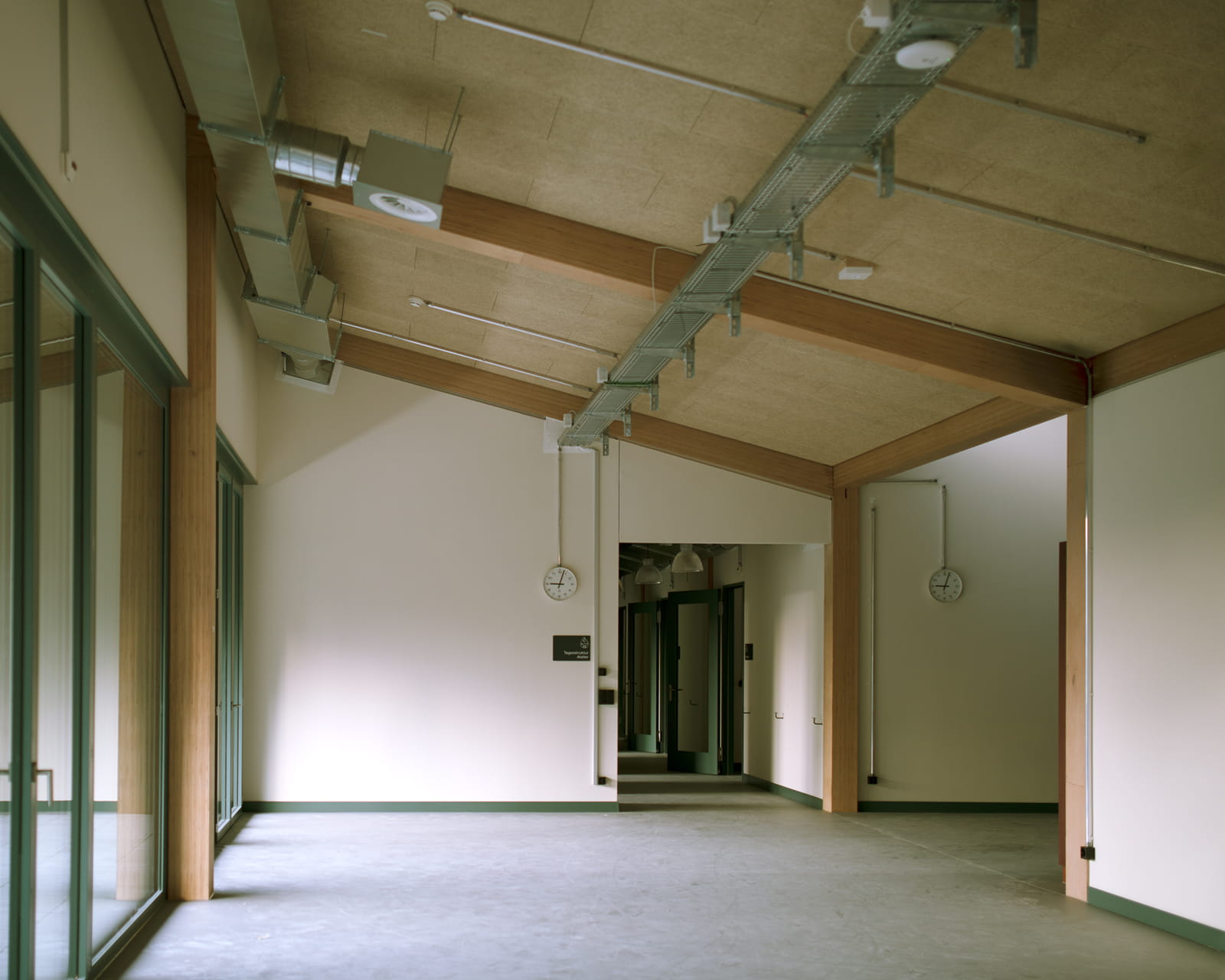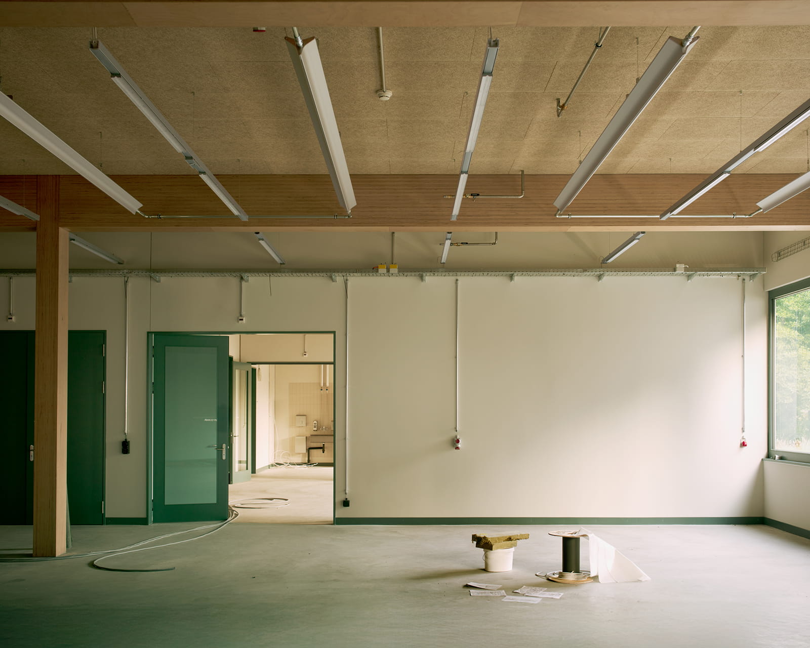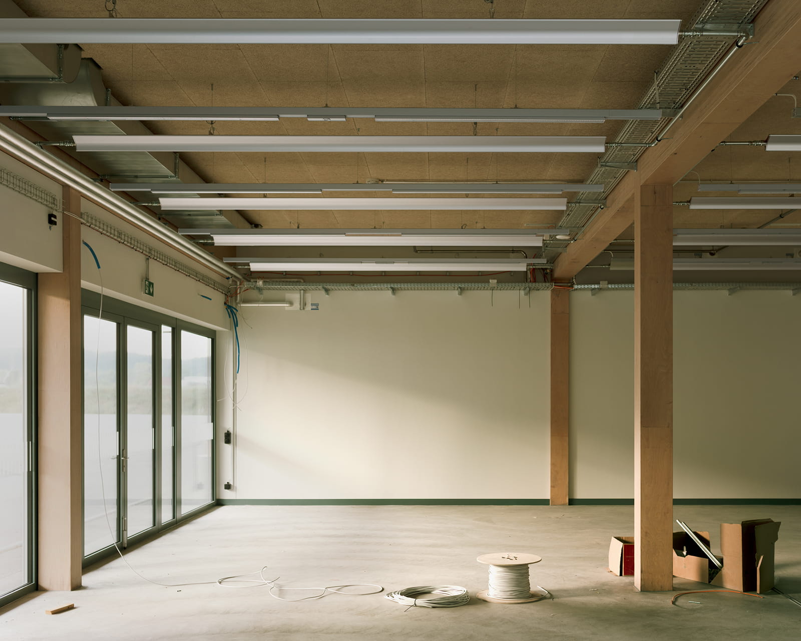 Inside, the structural framework of beech wood defines the space. In combination with the openly routed technical installations, it creates a direct and robust expression.