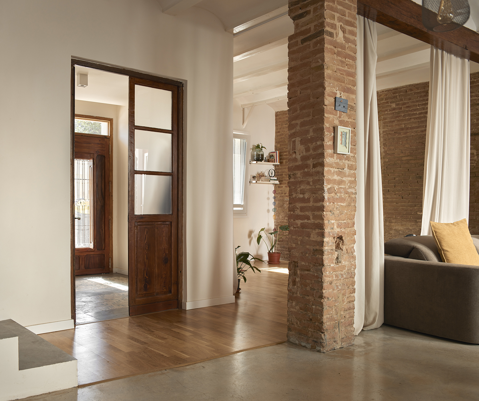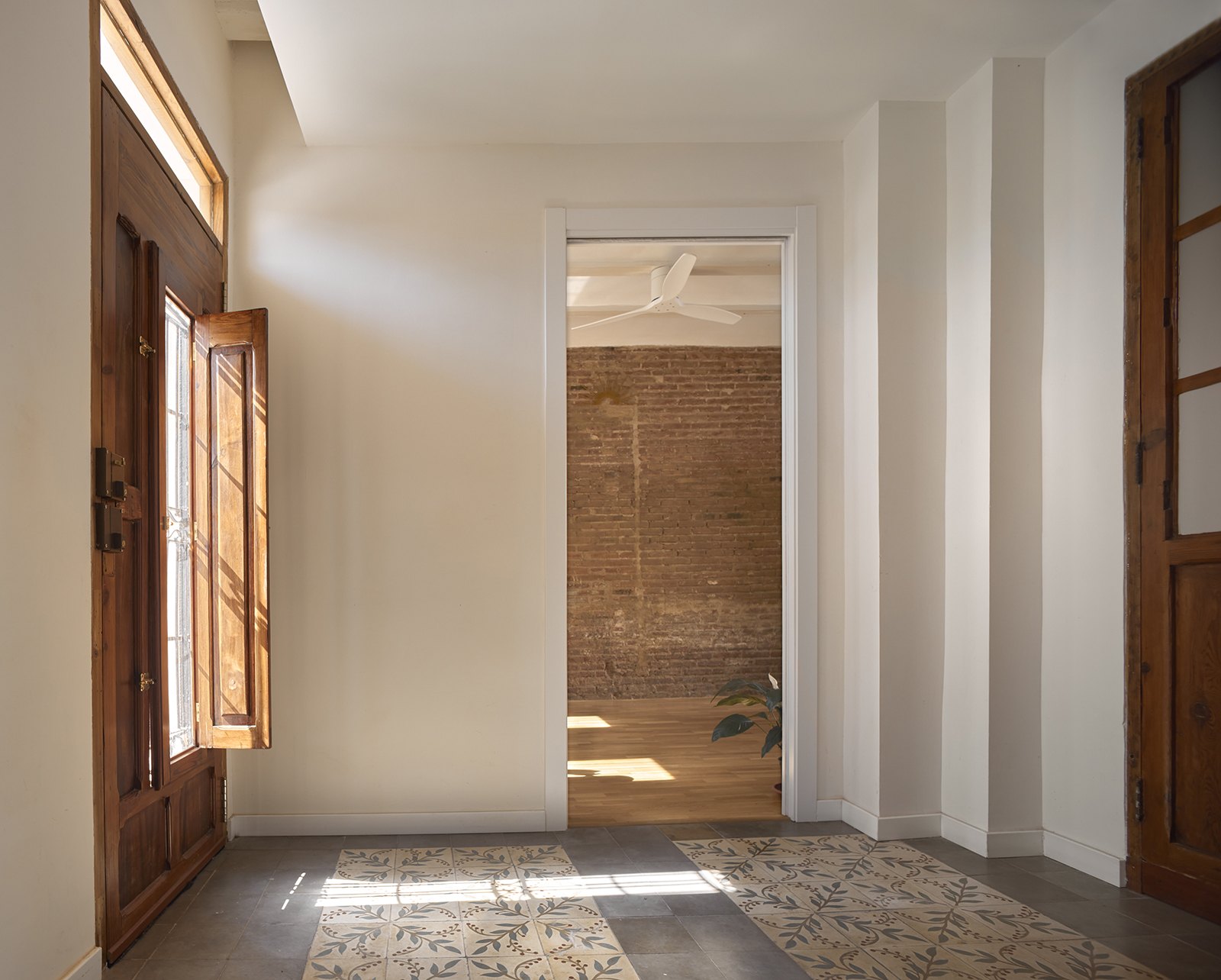 Reclaimed hydraulic tiles and restored doors contribute to a material narrative rooted in reuse and transformation.