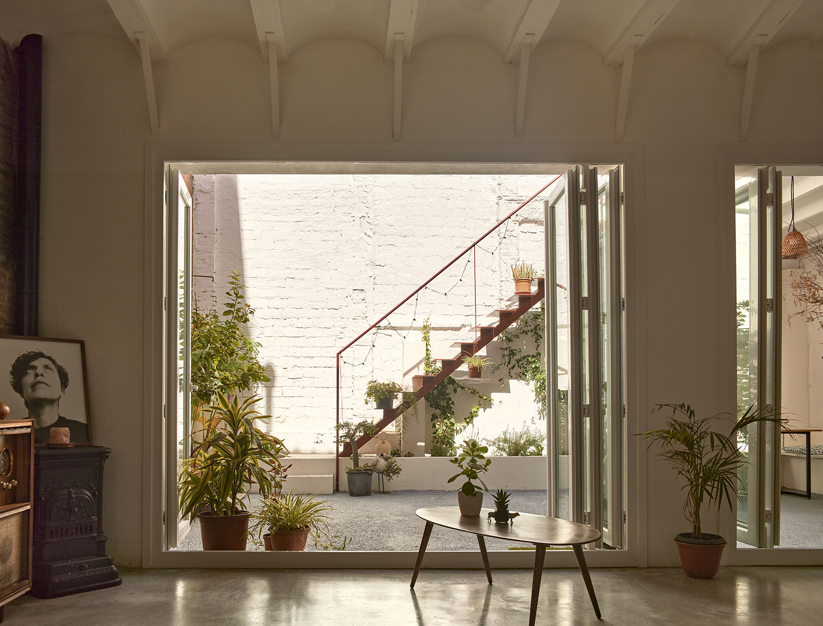A courtyard acts as the social core, extending the living space outward, while large openings dissolve the boundary between interior and exterior.