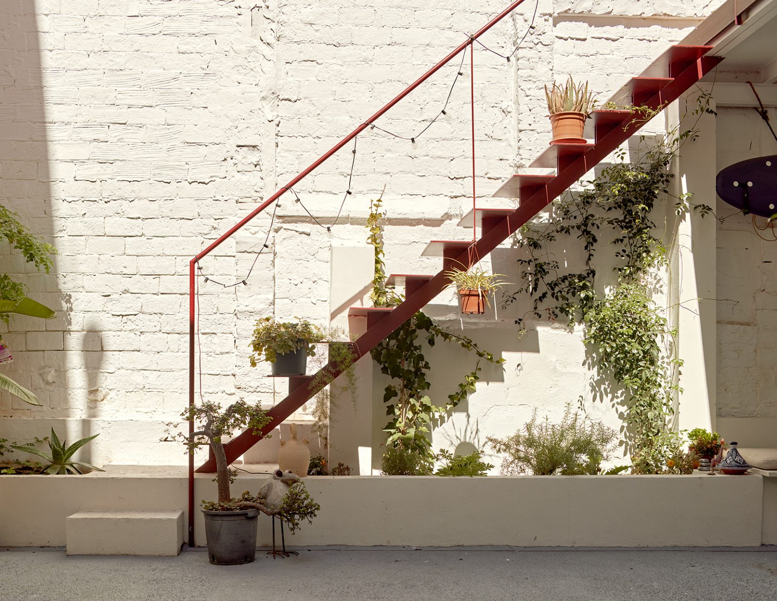 A distinctive red staircase, visible from the courtyard, acts as both a circulation element and a visual anchor.