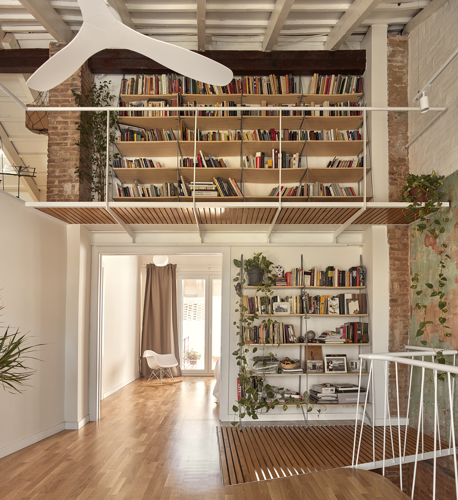 The ground floor accommodates collective uses as living, reading, and gathering articulated through natural light and material warmth. Above, a more introspective realm hosts a study, library, and loft, organized along a continuous spatial flow.