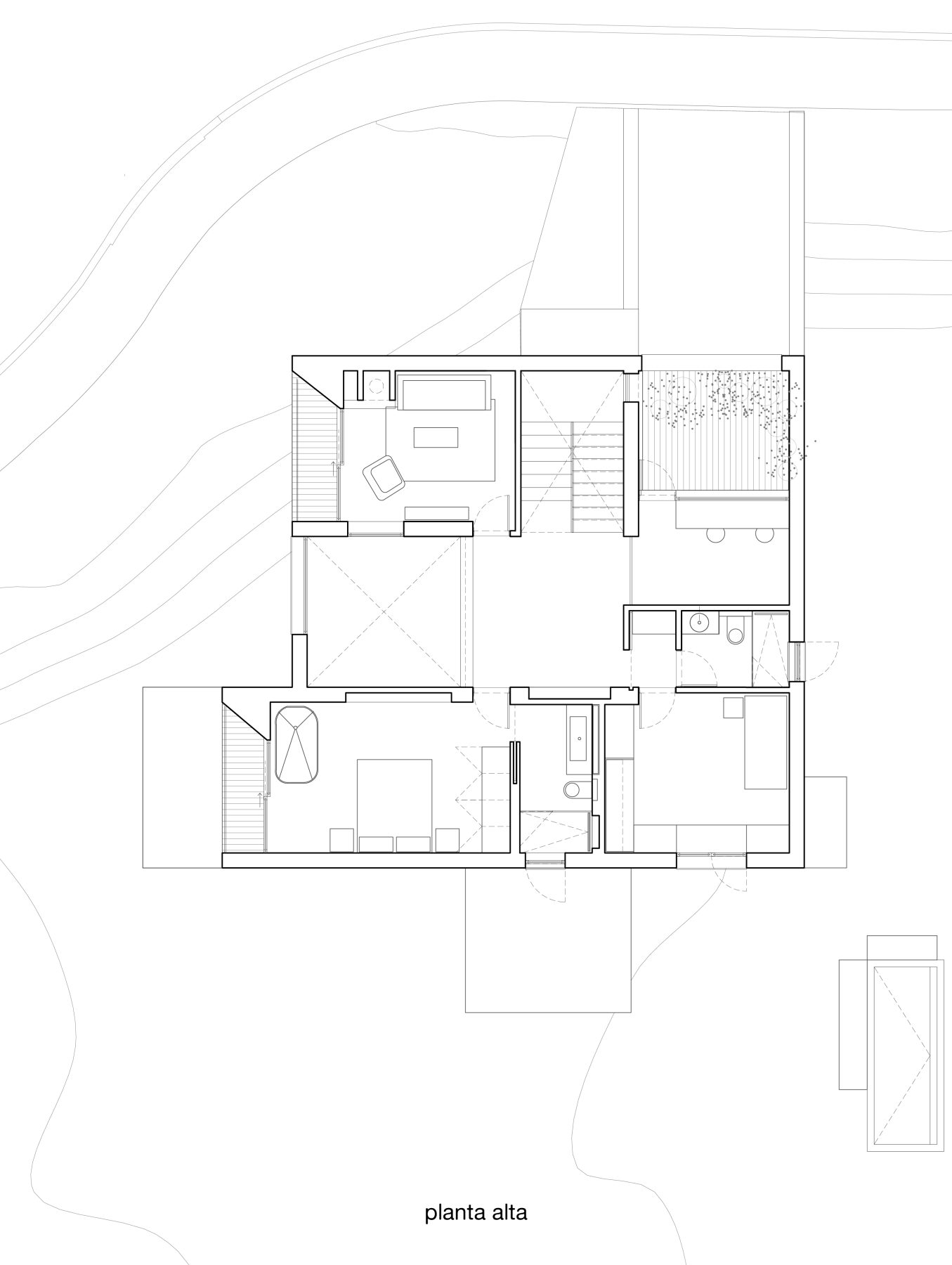 The house unfolds over two floors and an accessible rooftop that becomes a terrace with 180-degree views. The lower, semi-buried floor takes advantage of the site’s natural slope to house the garage and service areas while improving thermal efficiency. The upper floor is reserved for the more private rooms. Between the two levels, a double-height space connects them vertically with a light staircase that allows light and views to flow through.