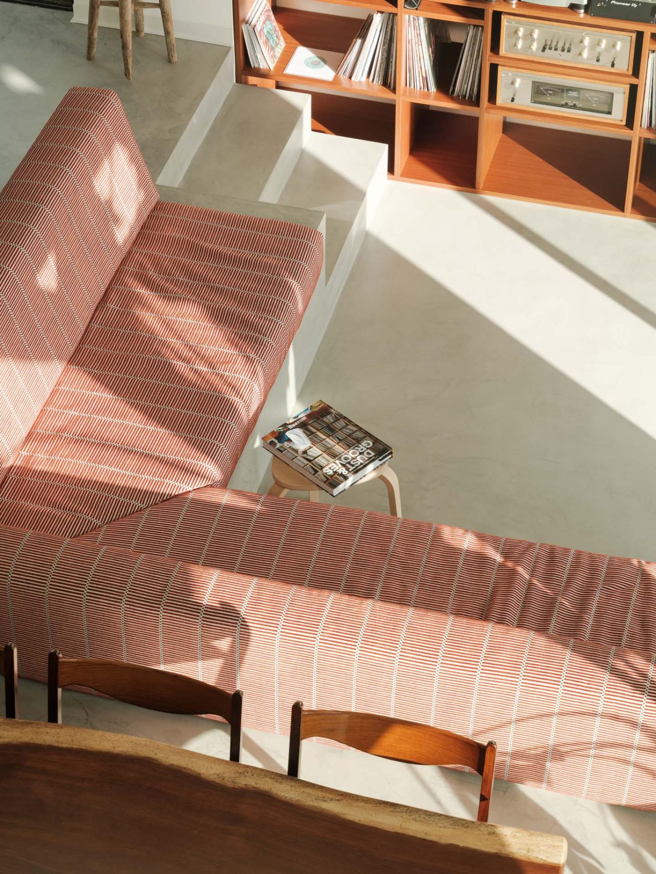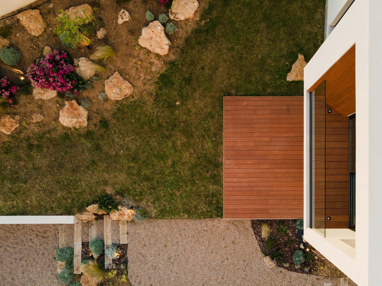 The living room is set lower than the rest of the floor, bringing it closer to the garden and reinforcing the sense of shelter facing the sea. The open and functional kitchen connects to the social area and to a small upper-floor patio that brings in natural light and ventilation. Hidden doors, interconnected spaces, and framed openings lined with wooden niches—both inside and out—help create a serene, warm atmosphere full of carefully crafted details.