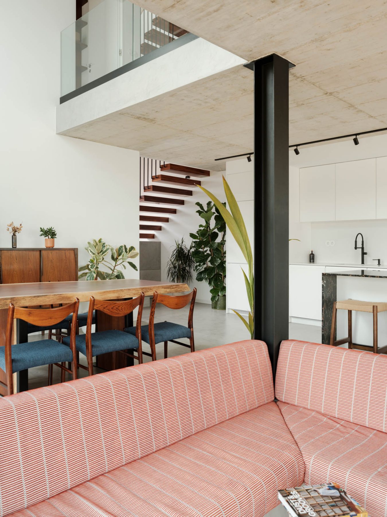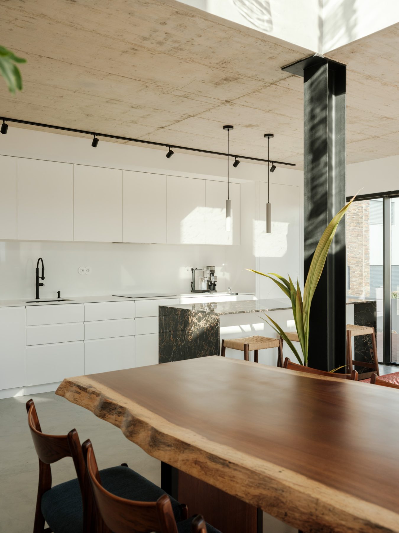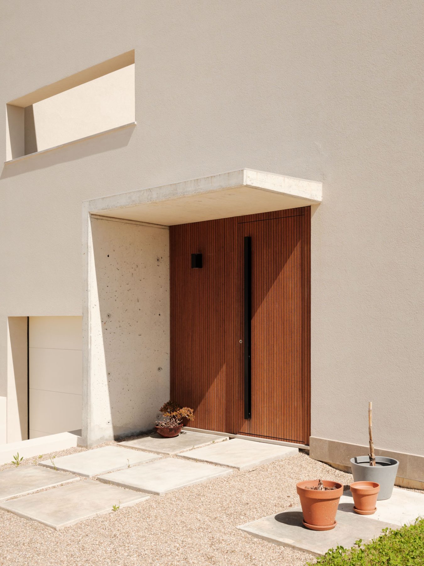 Inside, polished concrete flooring and exposed concrete slabs were combined with selected wood and metal details to add texture and warmth. The house closes itself off from the street and neighboring plots, while opening completely to the sea.