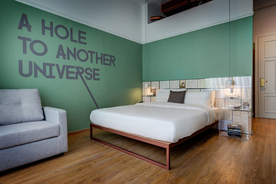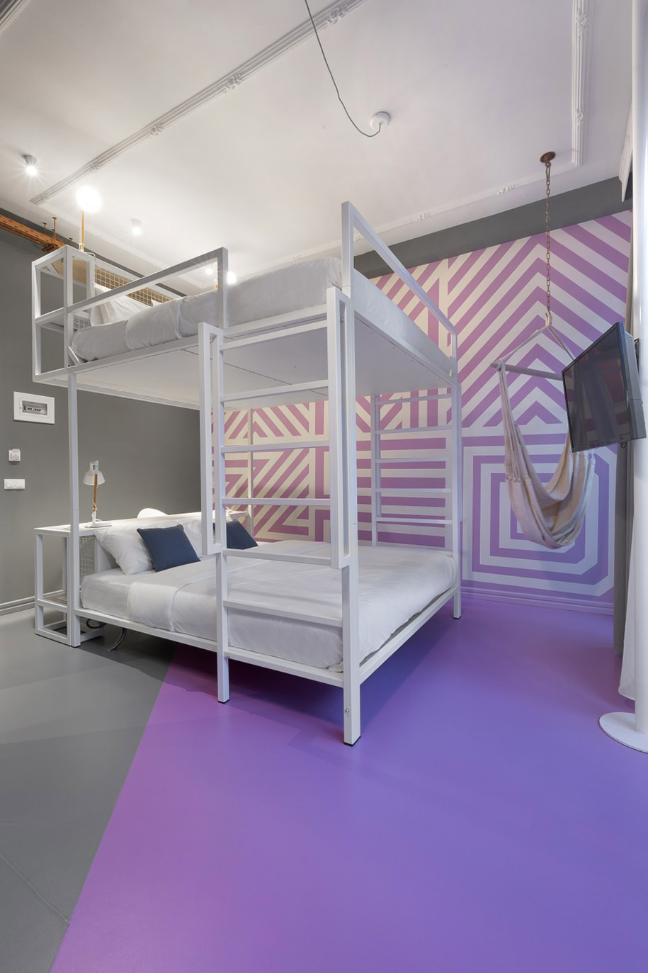 The interior design of the Colors Urban Hotel is developed around the idea of the thematic room. The themes (such as nature, music, cinema, comics, astronomy and books) make each and every room unique, differentiating them in regard to the furniture design, the colors of the flooring and the walls, the wallpapers and the graphic elements used. The furniture is made of metal and wood and it is tailor made for each room.
