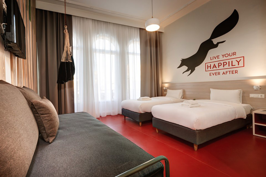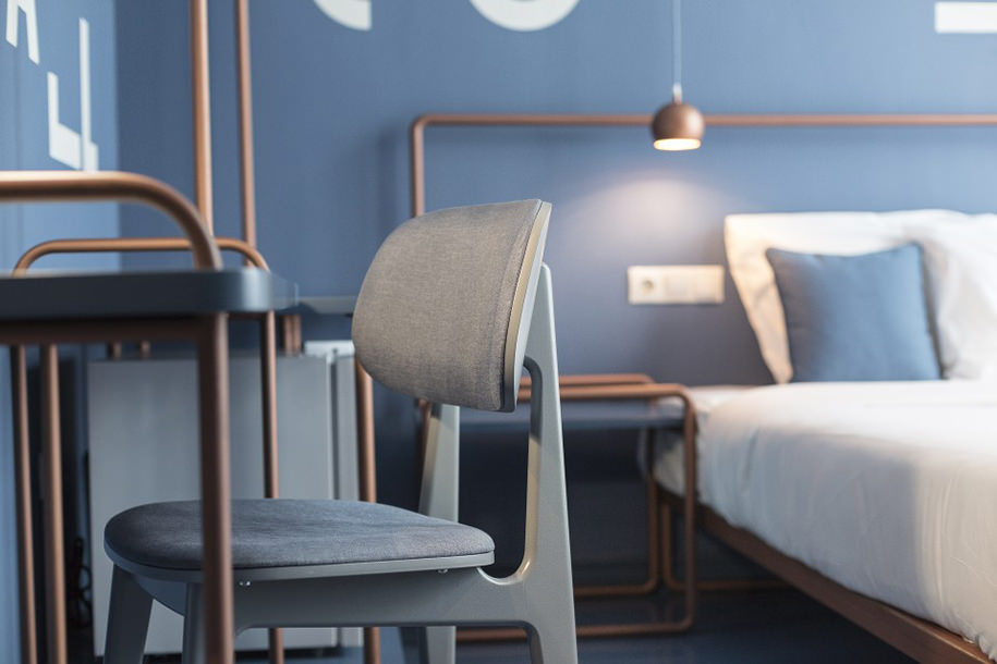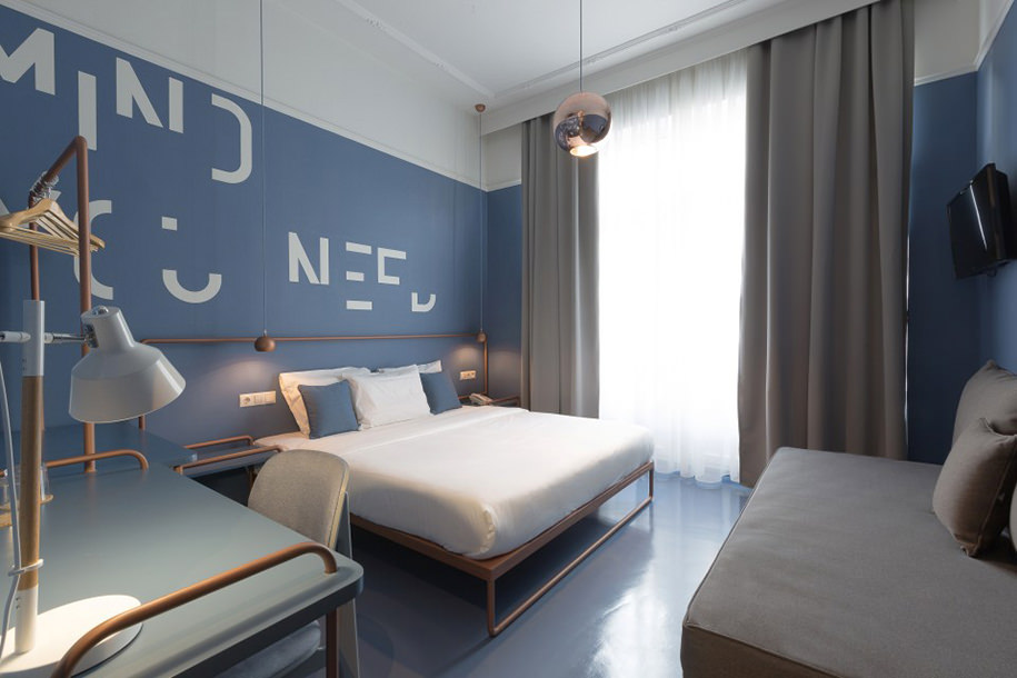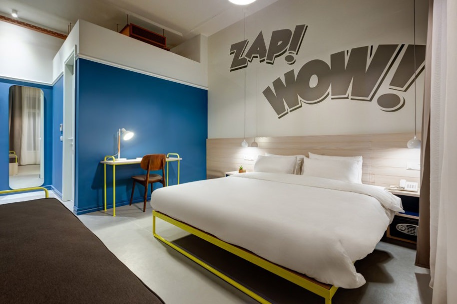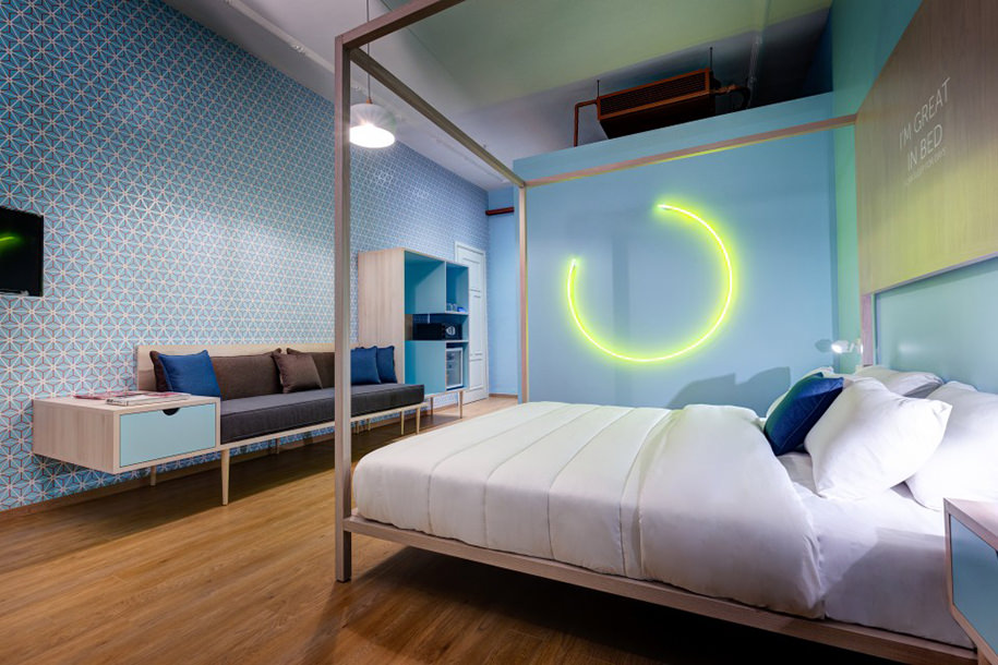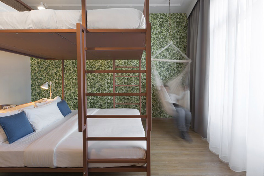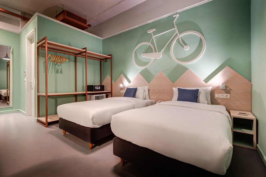 Another feature of the Colors Urban Hotel is the bigger space allowance of each room, compared to the typical hotel rooms. This characteristic led to a new typology of layout, allowing the bed to be placed in the center of the room and the desk behind it, while open wardrobes and offices, as well as nooks used as nightstands, are used. The high ceilings allowed the placement of a second bed on top of the main one while the floor-to-ceiling windows to the full width of each room, open the rooms to the city view and enhance a wider feel of the space, even further.