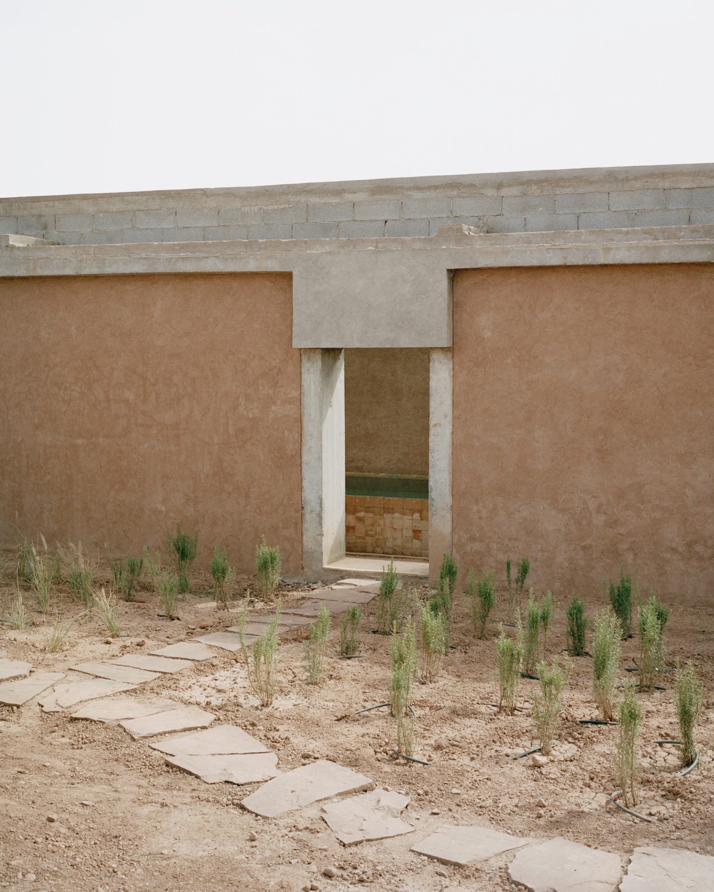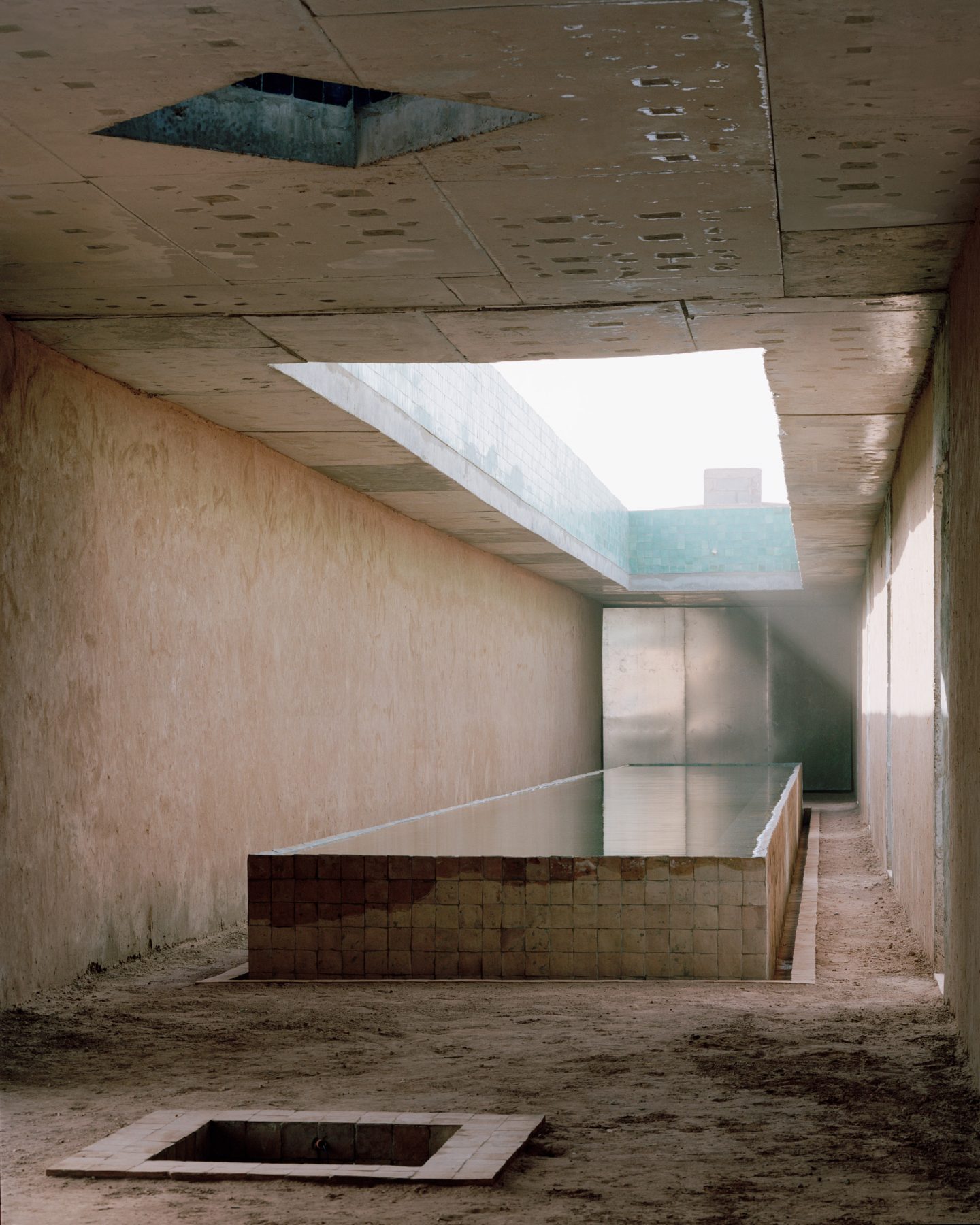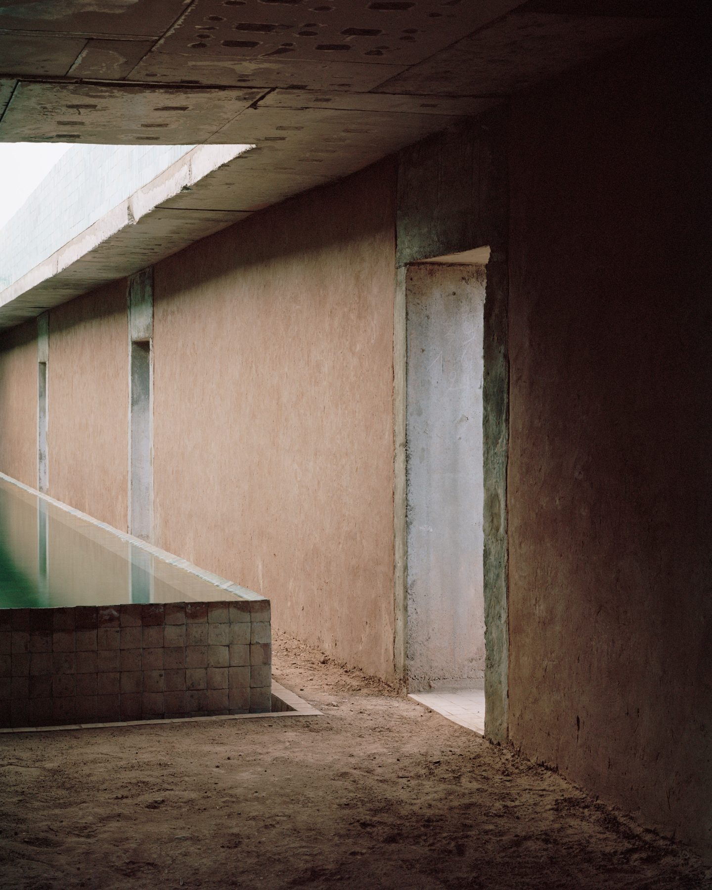 The two parallel rammed earth walls defining the domestic space host a succession of rooms, patios and water basins. The harsh sunlight enters the spaces through defined openings and skylights in the ceiling.