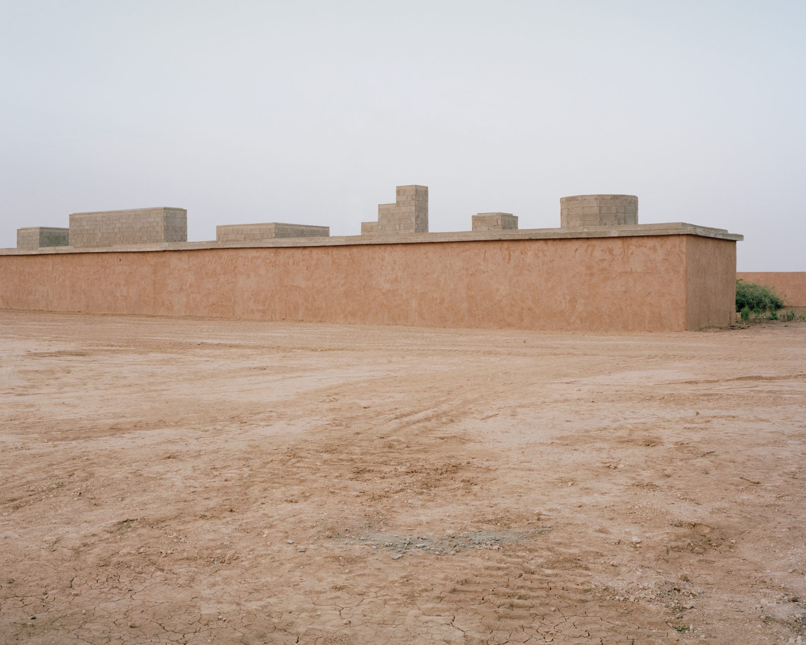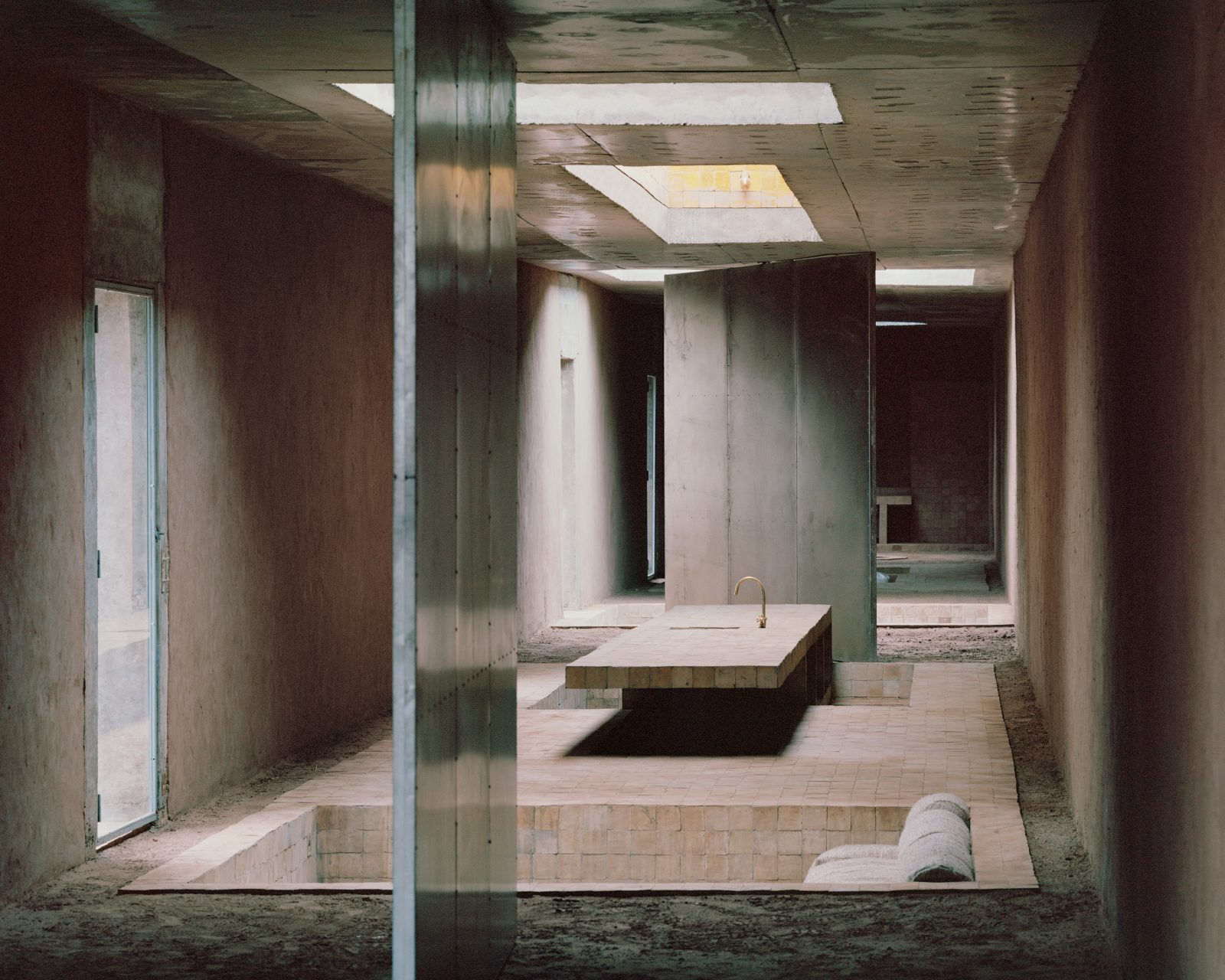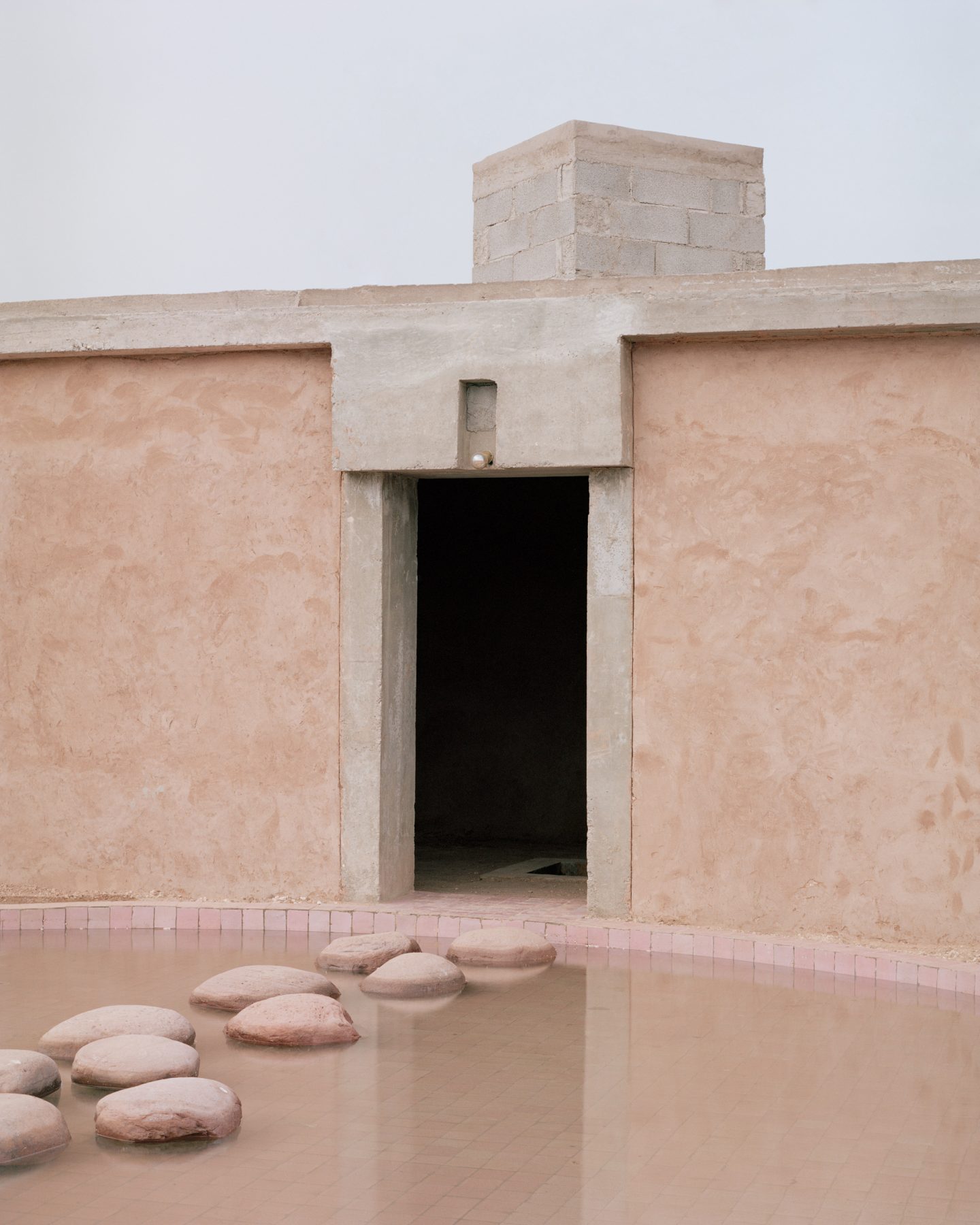 The two parallel rammed earth walls defining the domestic space host a succession of rooms, patios and water basins. The harsh sunlight enters the spaces through defined openings and skylights in the ceiling.