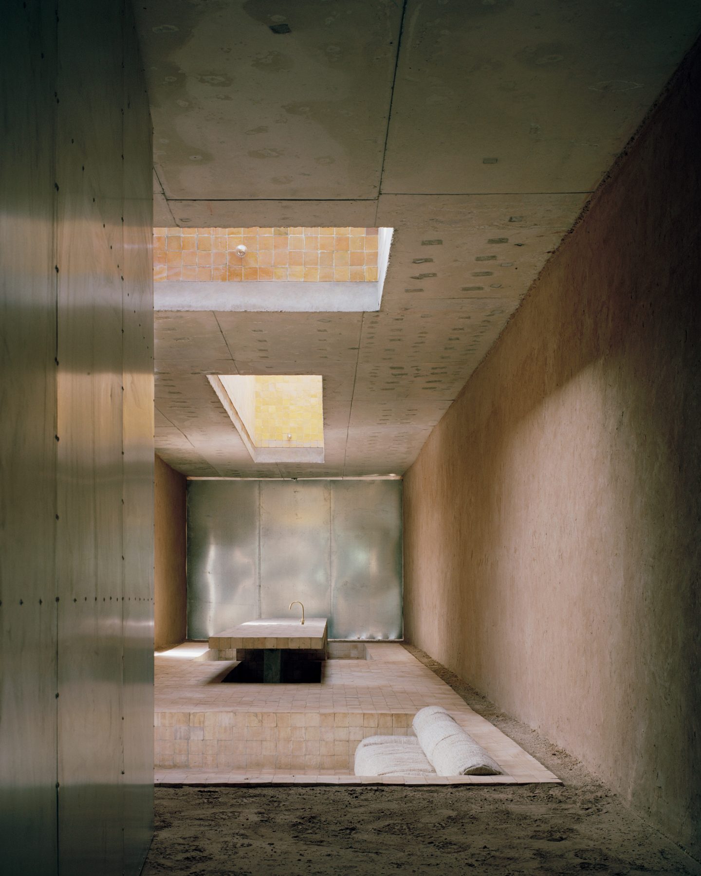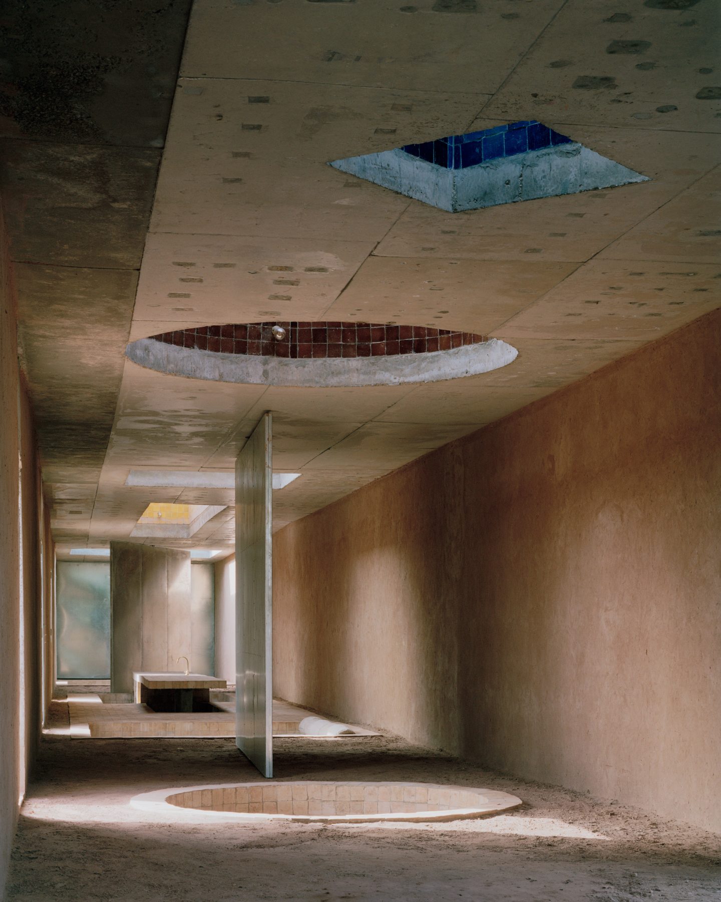 While the walls and floors are simply made of compressed soil, the zenithal openings in the ceiling are lined with colorful zellige tiles produced in a neighboring village.