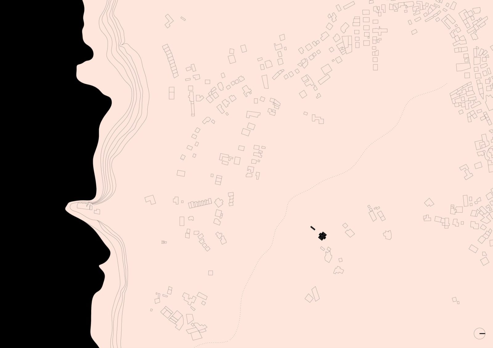 The plot, a steep, narrow strip of land in the heart of the countryside, is a five-minute walk from the beach, and offers panoramic views over the sea, the valley, and the village in the distance.