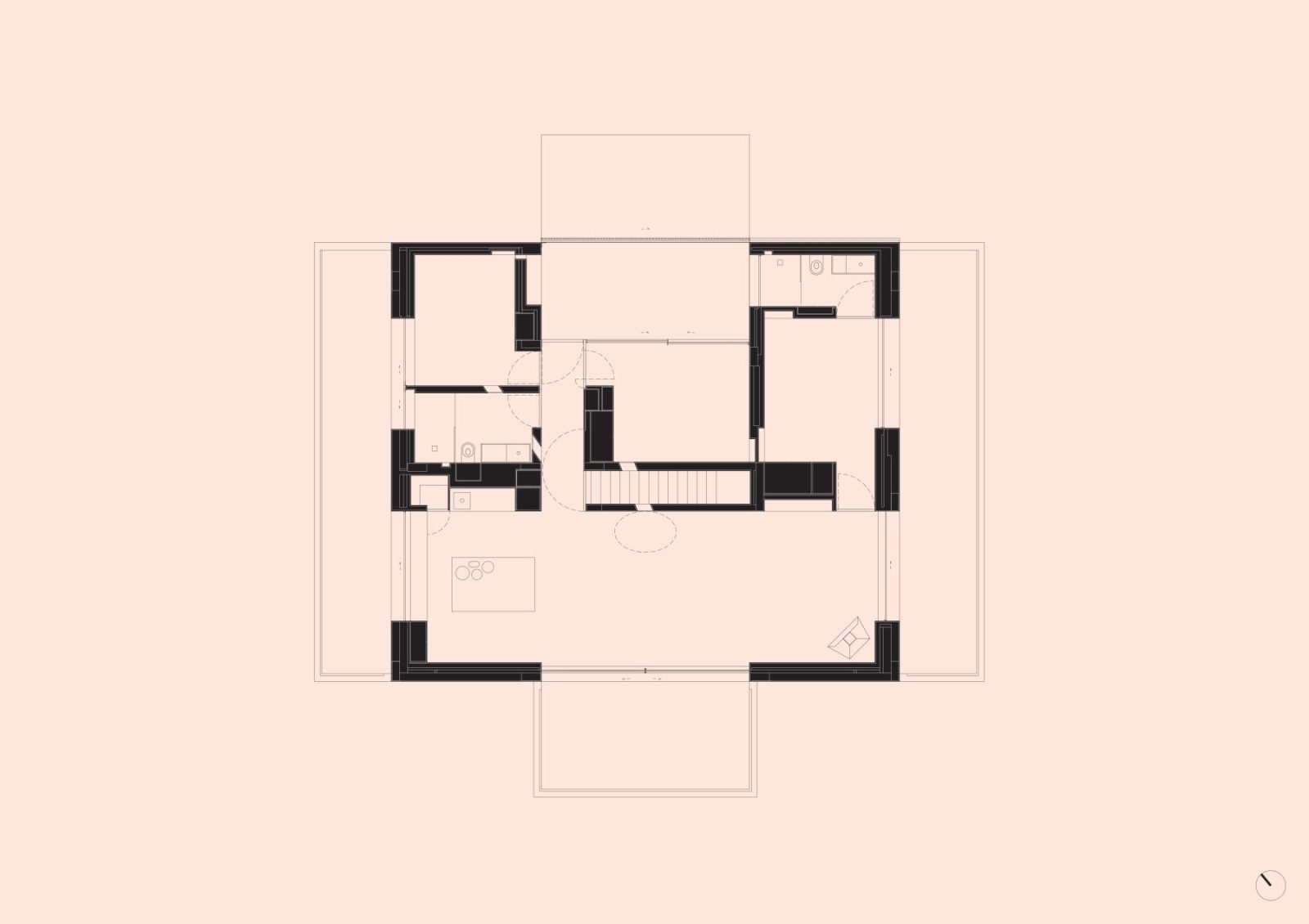 Four load-bearing walls support a cruciform podium, onto which the house sits, hovering over the land. The platform touches the sloping ground once only to allow entry, while all other sides accommodate terraces that float in the air in all directions and that extend interior space to the outside, giving each room its own private refuge.