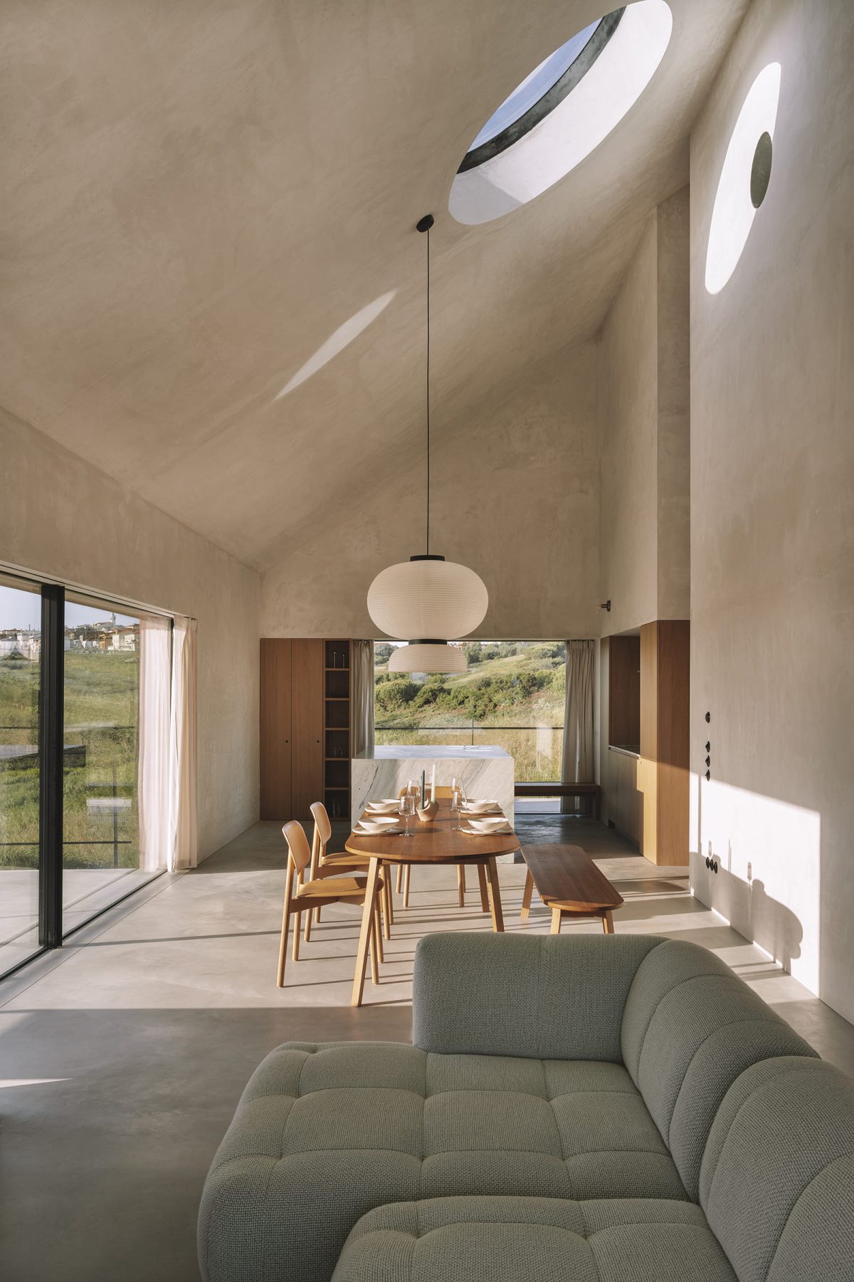 A large skylight reinforces this impression in the living room, while elsewhere a series of oculi, designed precisely within the structure’s geometry using a 3D model, allow direct light from the skylight to cut through the house, reaching its darkest areas. For four months of the year, a beam of light illuminates each room before sunset, reaching peak intensity at the summer and winter solstices.